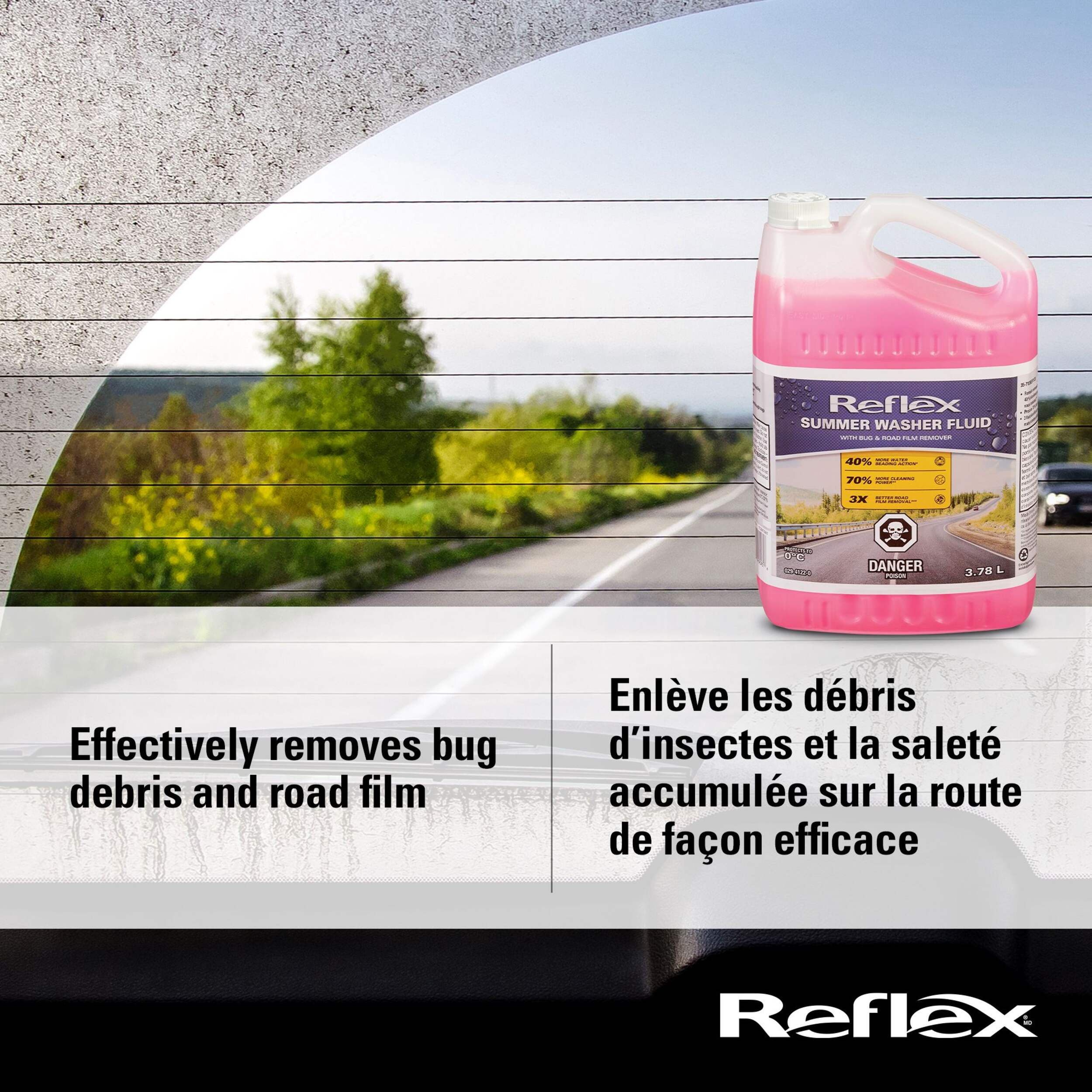 Reflex Summer Windshield Washer Fluid, formulated with advanced beading technology, offers enhanced cleaning power and more beading action for better removal of road film and bugs during summer driving. This 3.78-L fluid coats your windshield with an advanced water-repellent finish that causes water to bead up. Its form a water-repellent finish, improving the driving experience in rainy conditions too.