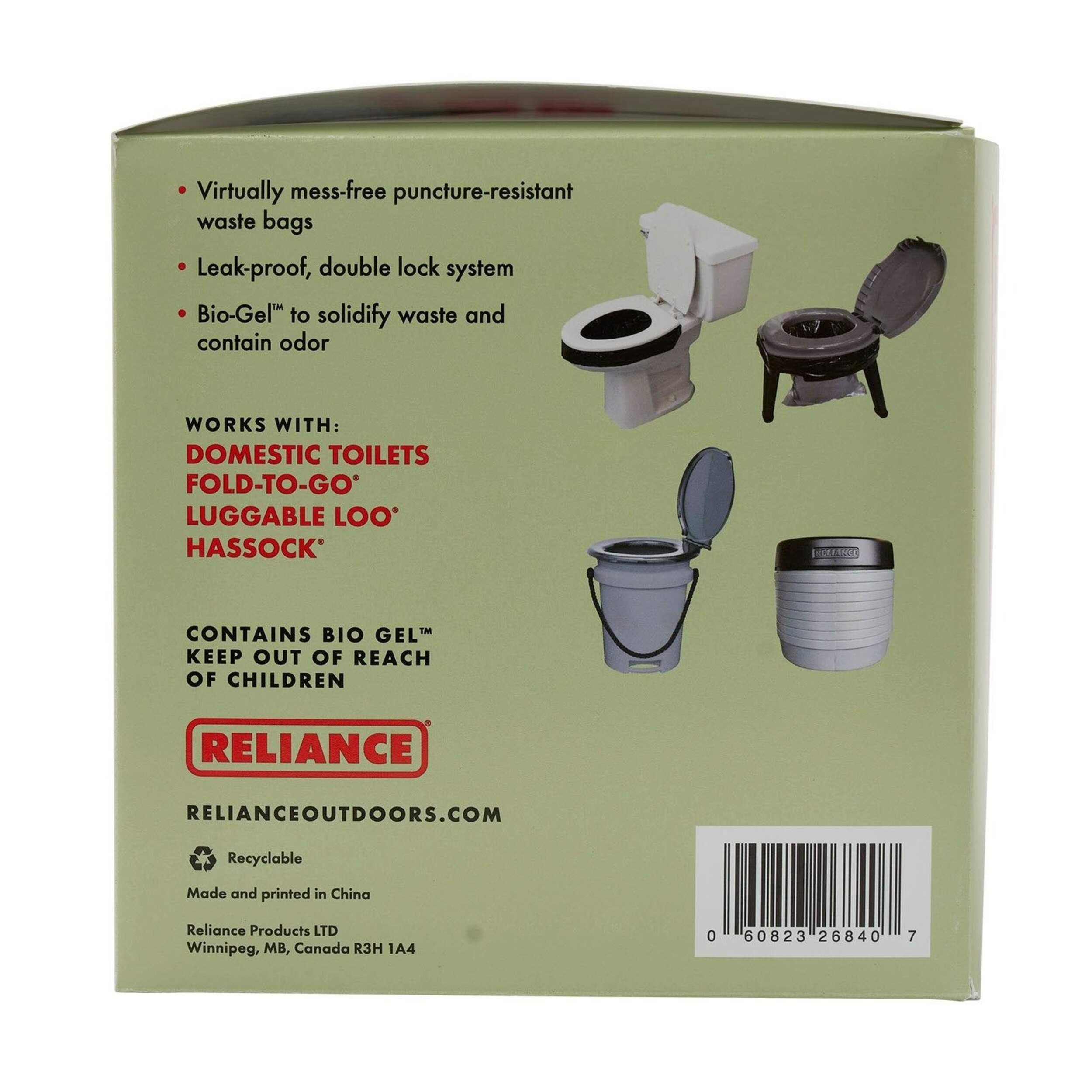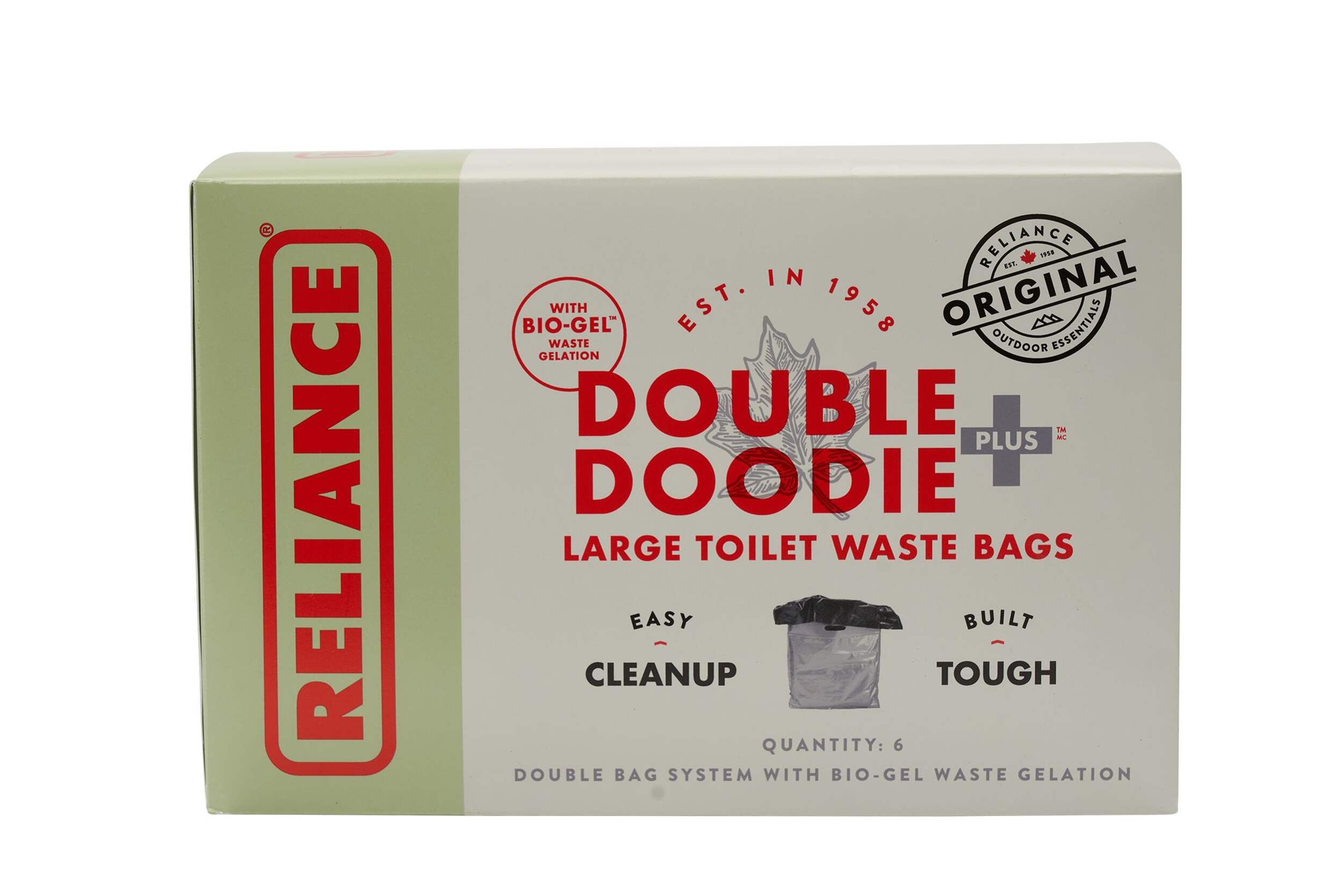 Reliance Double Doodie Plus Camping Toilet Waste Bags help keep your adventures on track even while you're in the woods. With all the benefits of the regular Double Doodie bags, these Double Doodie Plus bags are bigger and contain Bio Gel™ waste gelation. Meant for families, each bag holds up to 12 lb of human waste. Bio-Gel™ in each bag turns liquid waste into a gel in moments and masks odors, making for no-mess, easy clean-ups. The double bag system has an inner waste bag that rolls up when filled. The attached heavy-duty outer bag has a leak-proof double zip-lock to make sure what's inside the bag stays inside.