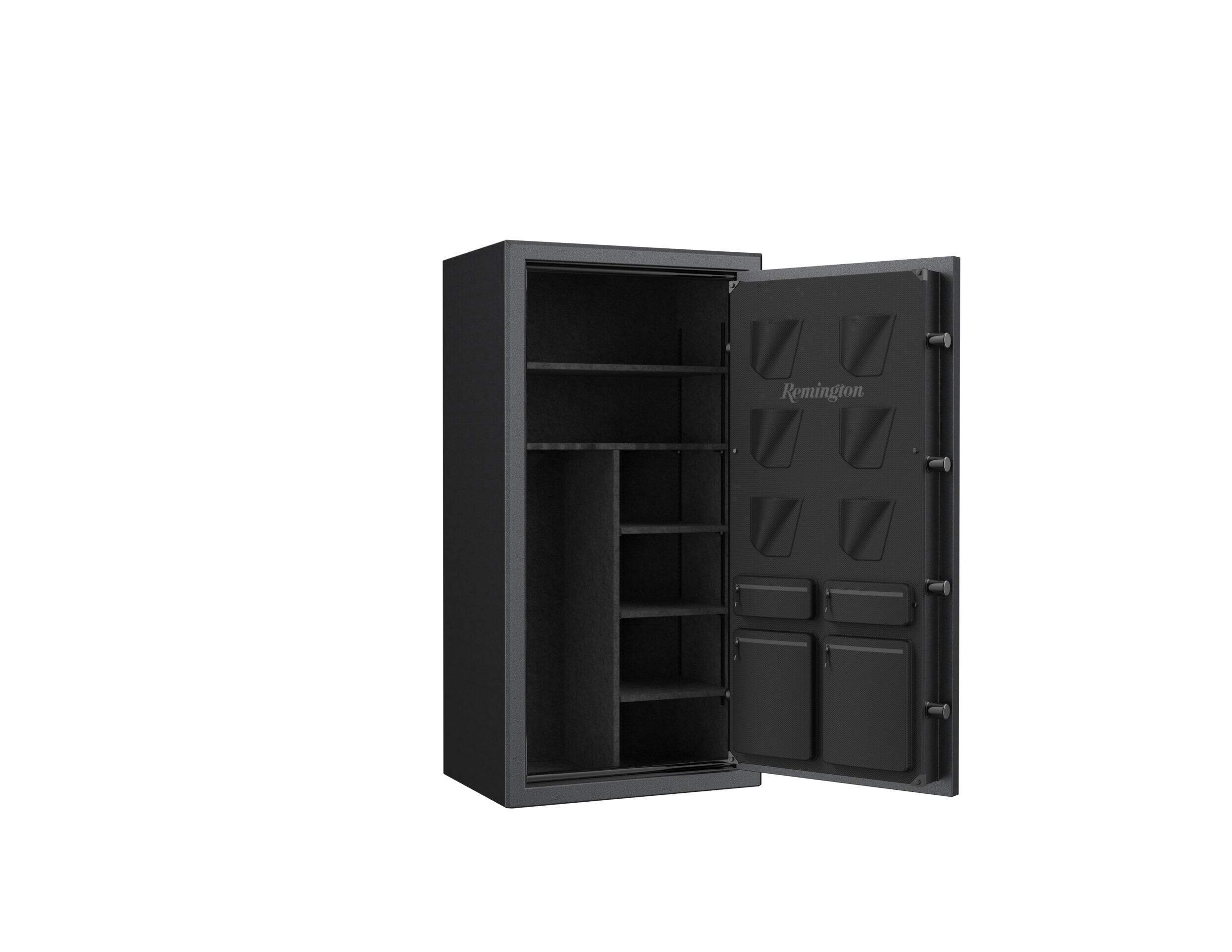 Secure your firearms with confidence using the Remington 32 Gun Safe. Designed to protect against fire and water damage, this fireproof and waterproof gun safe ensures your valuable collection remains intact. The sleek Black Gloss Hammertone finish adds a touch of elegance to its robust construction.