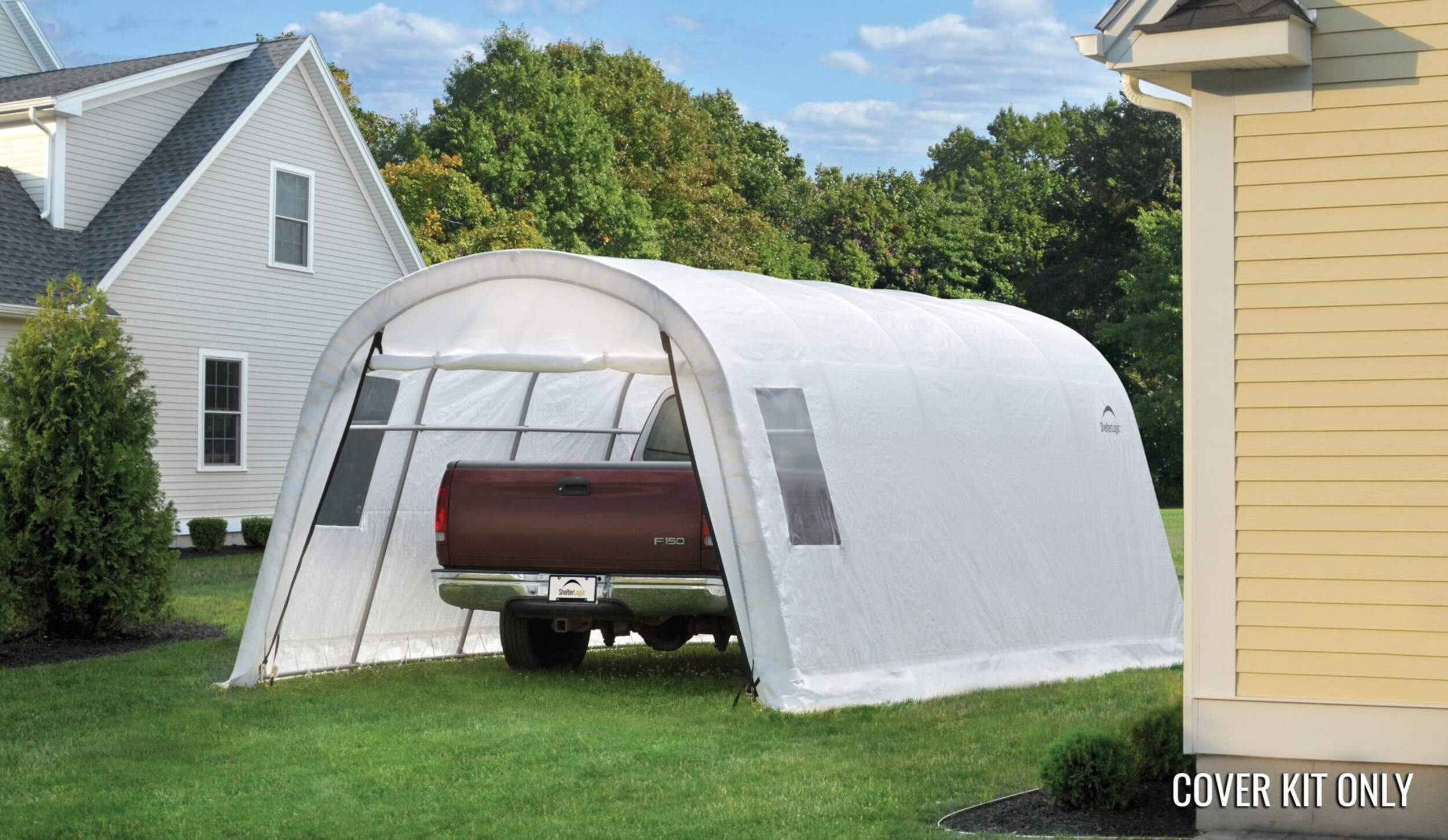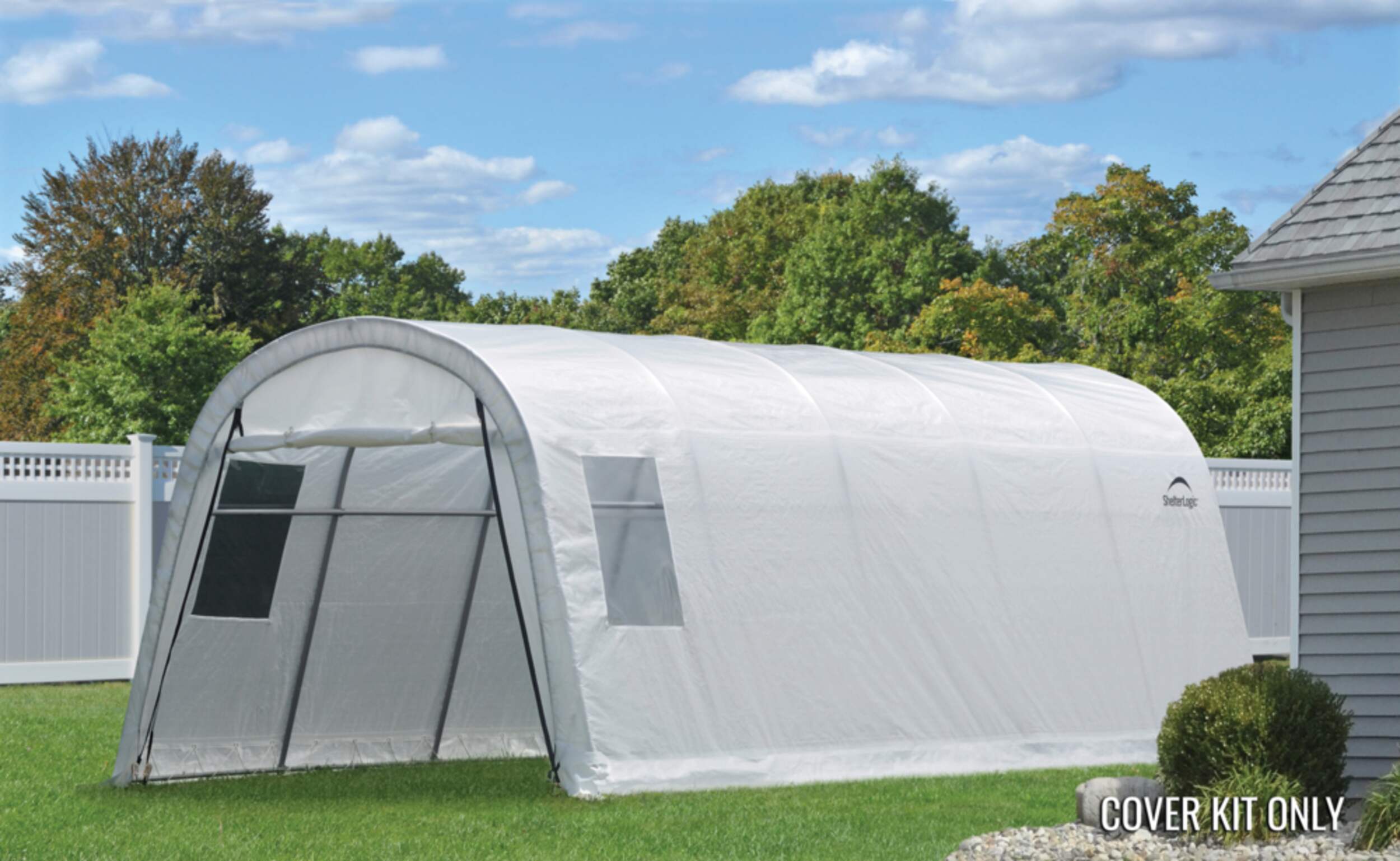 The Garage-in-a-Box® Round 12 x 20 x 8 ft. Replacement Cover Kit replaces your existing Garage-in-a-Box RoundTop 12 x 20 x 8 ft. cover and end panels. The 100% waterproof ShelterLogic fabric replacement cover is made strong and has been UV treated inside and out to prevent and reduce fading and deterioration from harmful UV rays. Available in Standard, Heavy Duty 14.5 oz. and Ultra Duty 21.5 oz. See the chart for details. Cover kit only, frame sold separately.
