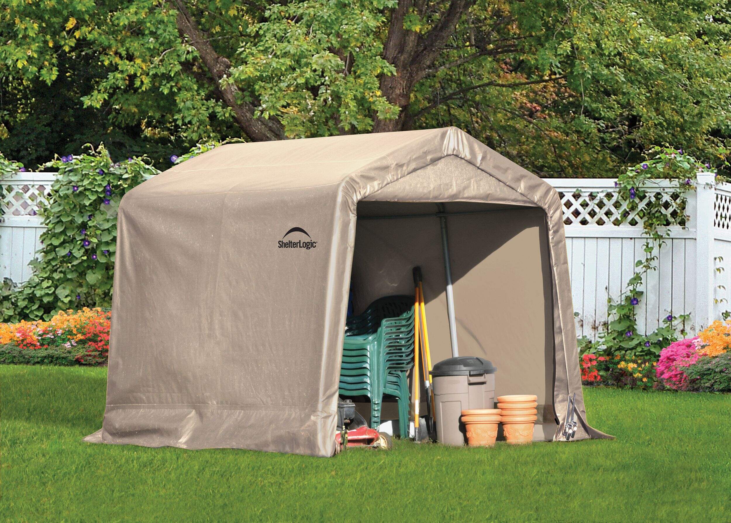 The 8 ft. x 8 ft. x 7 ft. or 2.4 x 2.4 x 2.1 m Shed-in-a-Box is designed for easy set-up, portability and value