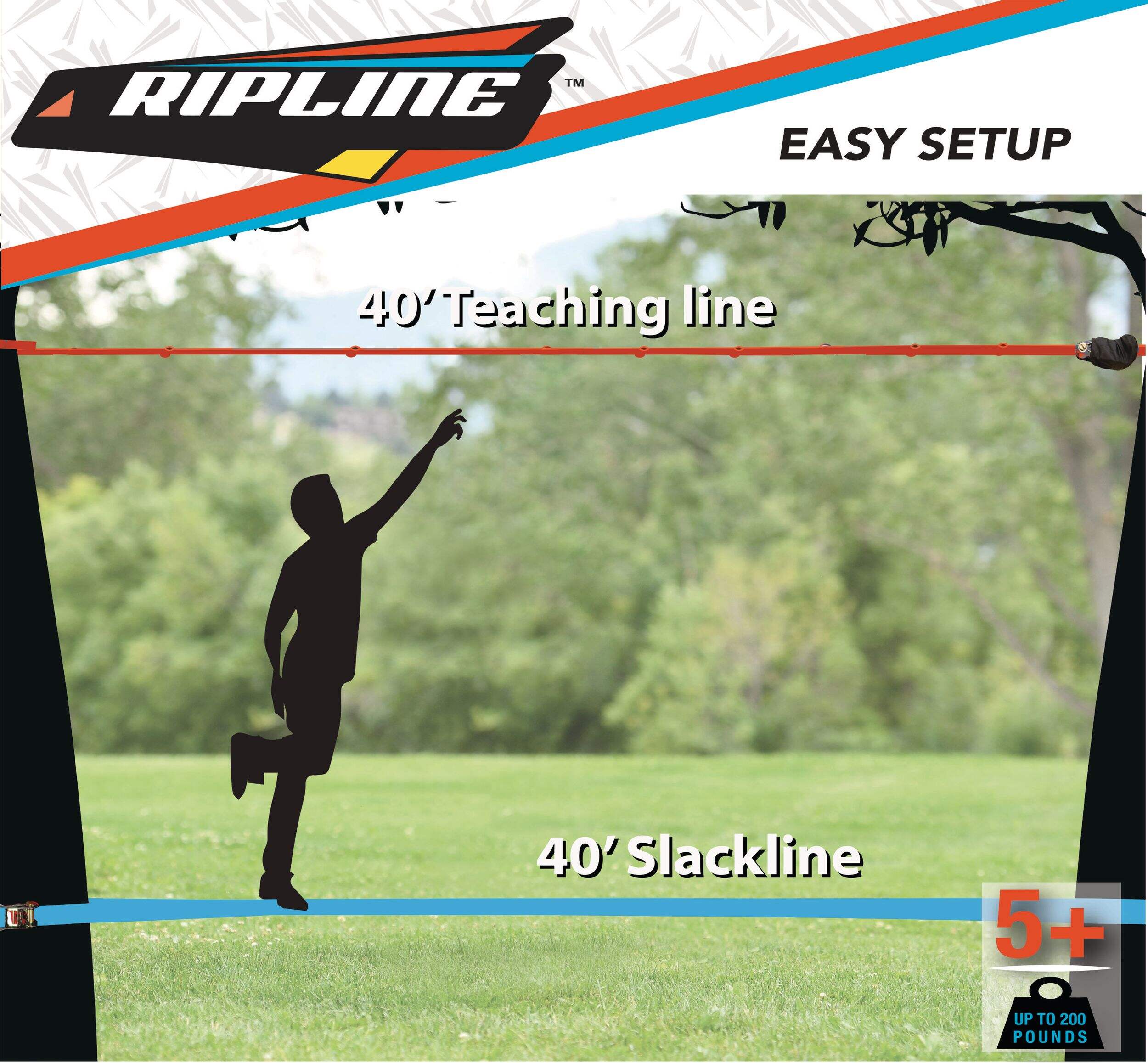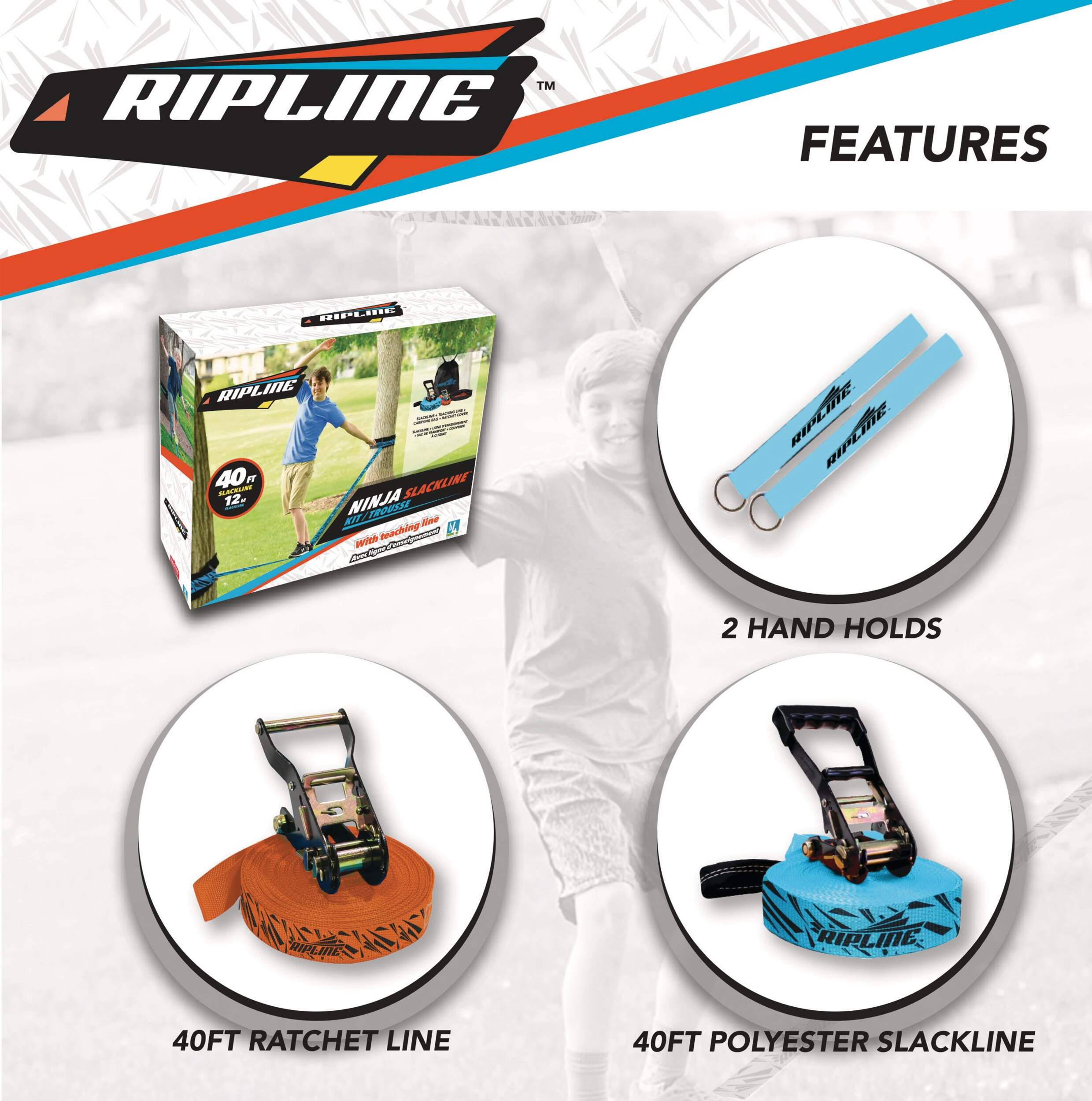 Features a 35' (10.7 m) challenge line which includes a 28' (8.5 m) line with 6' (1.8 m) ratchet strap