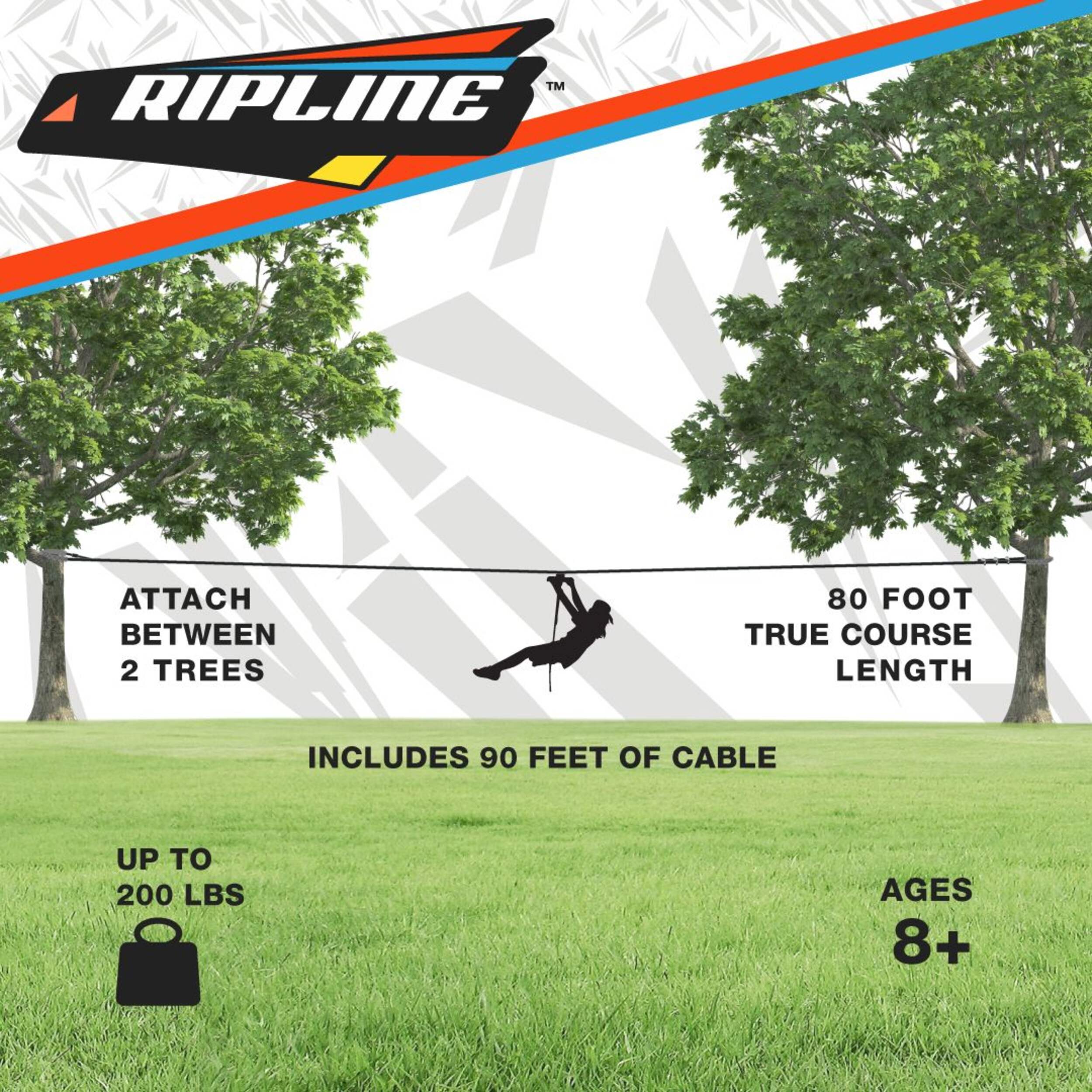 Ripline's zipline kit makes backyard adventure simple and swift, providing everything needed for a quick and easy zipline install. The complete kit includes 85 feet of hot-dipped galvanized steel cable, a durable blow-molded red seat with adjustable length ropes, weather-resistant hardware, tree protector sleeves and a tightening tool- just add two trees. Once set up, kids ages 8 and up can experience the thrill of zipping through the air within an hour, safely controlled by the spring brake system. The zipline delivers a rush of fun and freedom for any outdoor adventurer, young or young at heart.