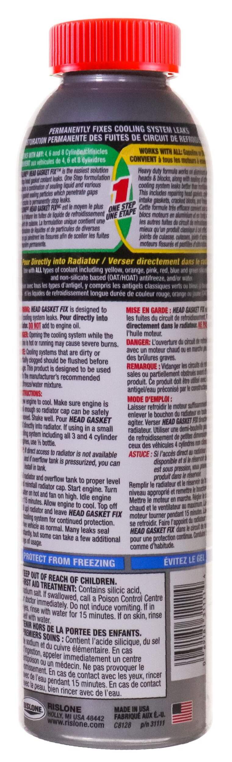 If the words “head gasket leak” give you the shivers, we have a solution for you. Fixing a head gasket typically requires a hefty chunk of money and a few days without your car. But what if you could fix it yourself? The easy-to-use Rislone Head Gasket Fix can get you back on the road in less than an hour. This product contains a combination of antifreeze-compatible sodium silicate sealing liquid and gasket sealing particles of various sizes, which penetrate gaps or cracks and harden to permanently stop leaks.