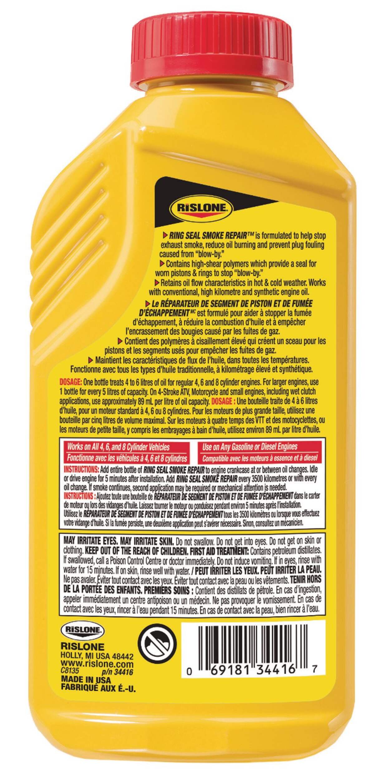 Rislone® Ring Seal® Smoke Repair is formulated to help stop blue exhaust smoke, reduce oil burning, and prevent plug fouling. Ring Seal contains high-shear polymers that form a seal for worn pistons and rings to stop blow-by. High mileage formula is specifically designed for older engines with higher mileage. The cleaner's all-weather formula retains oil flow characteristics in hot and cold weather, so you can add more anytime or simply top it off when low.