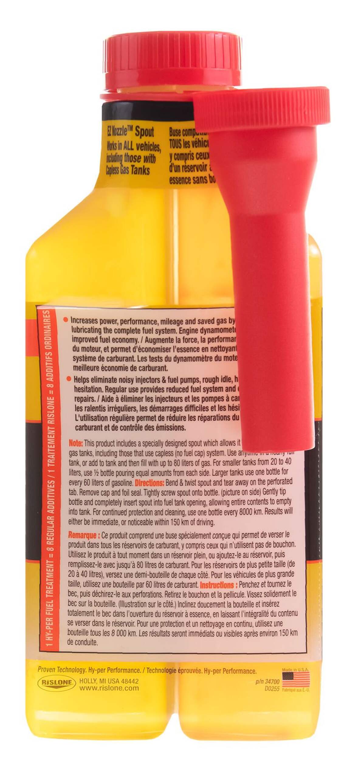 Rislone Hy-per Fuel Gasoline Fuel System Cleaner is designed to improve the quality of gas by increasing its cleaning ability, adding lubrication, removing contaminants, reducing spark knock, and helping to prevent the fuel from going bad.This dual-cavity bottle contains the same amount of additives equal to a bottle of regular fuel injector cleaner, upper cylinder lubricant, fuel stabilizer, gas dryer, gas treatment and octane booster. In other words, this is six additives in one bottle. This product increases power, performance, mileage and saves you gas by cleaning and lubricating the complete fuel system. It also happens to be the one that won an innovation award from PTEN (Professional Tool & Equipment News).