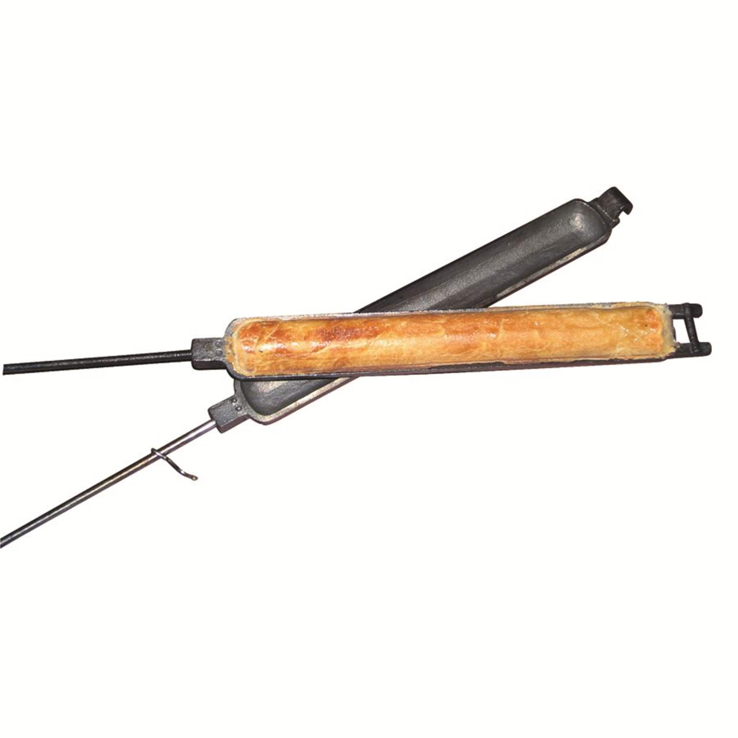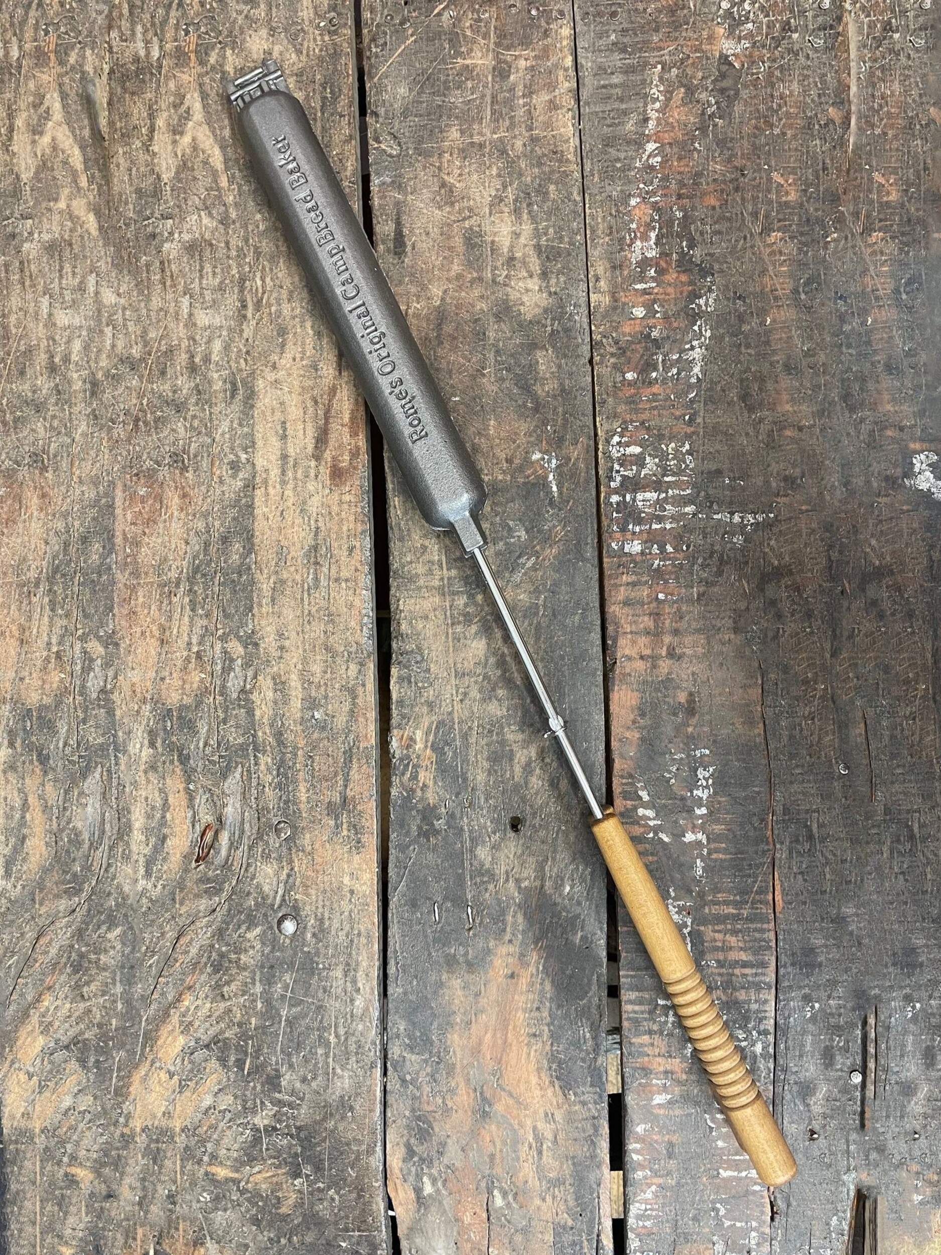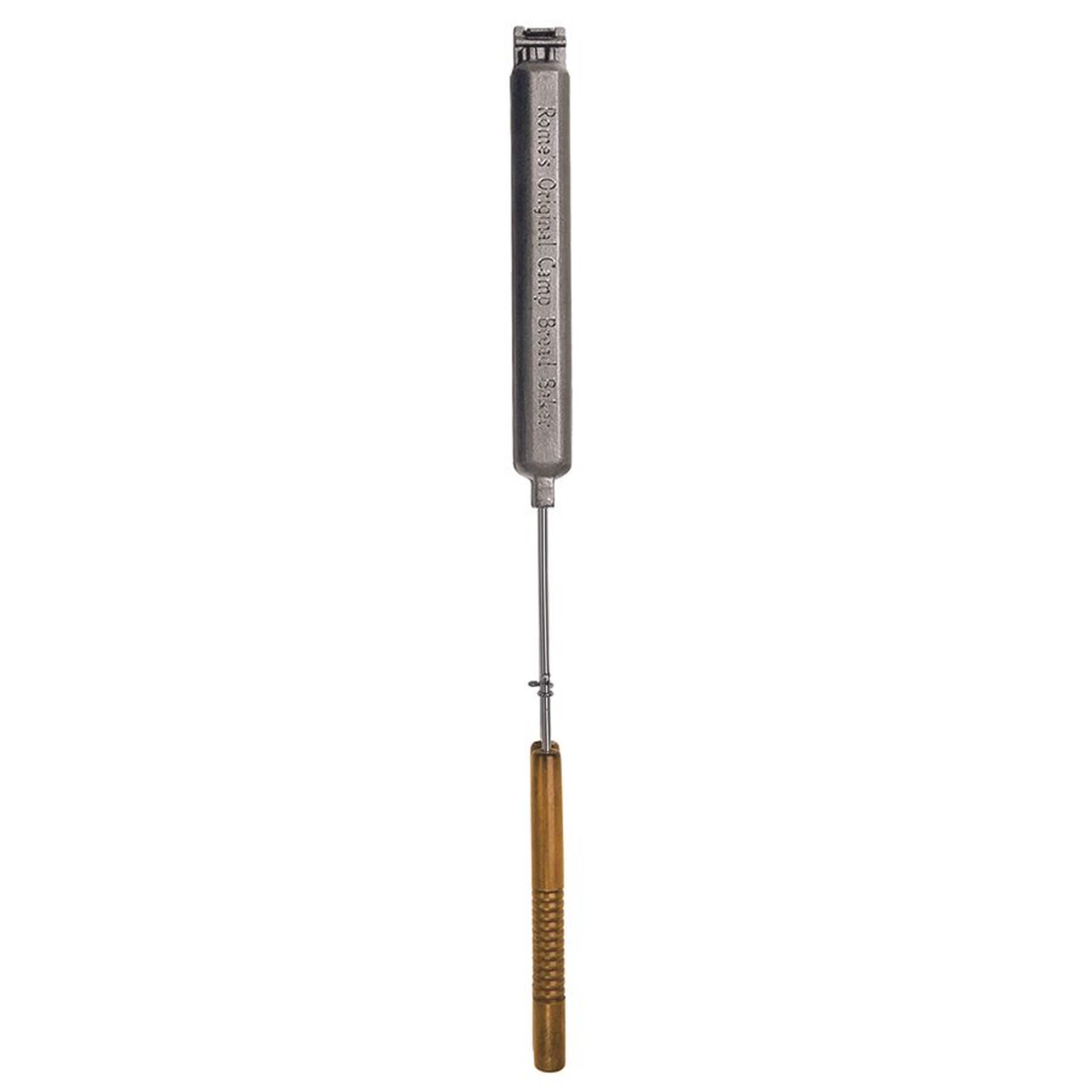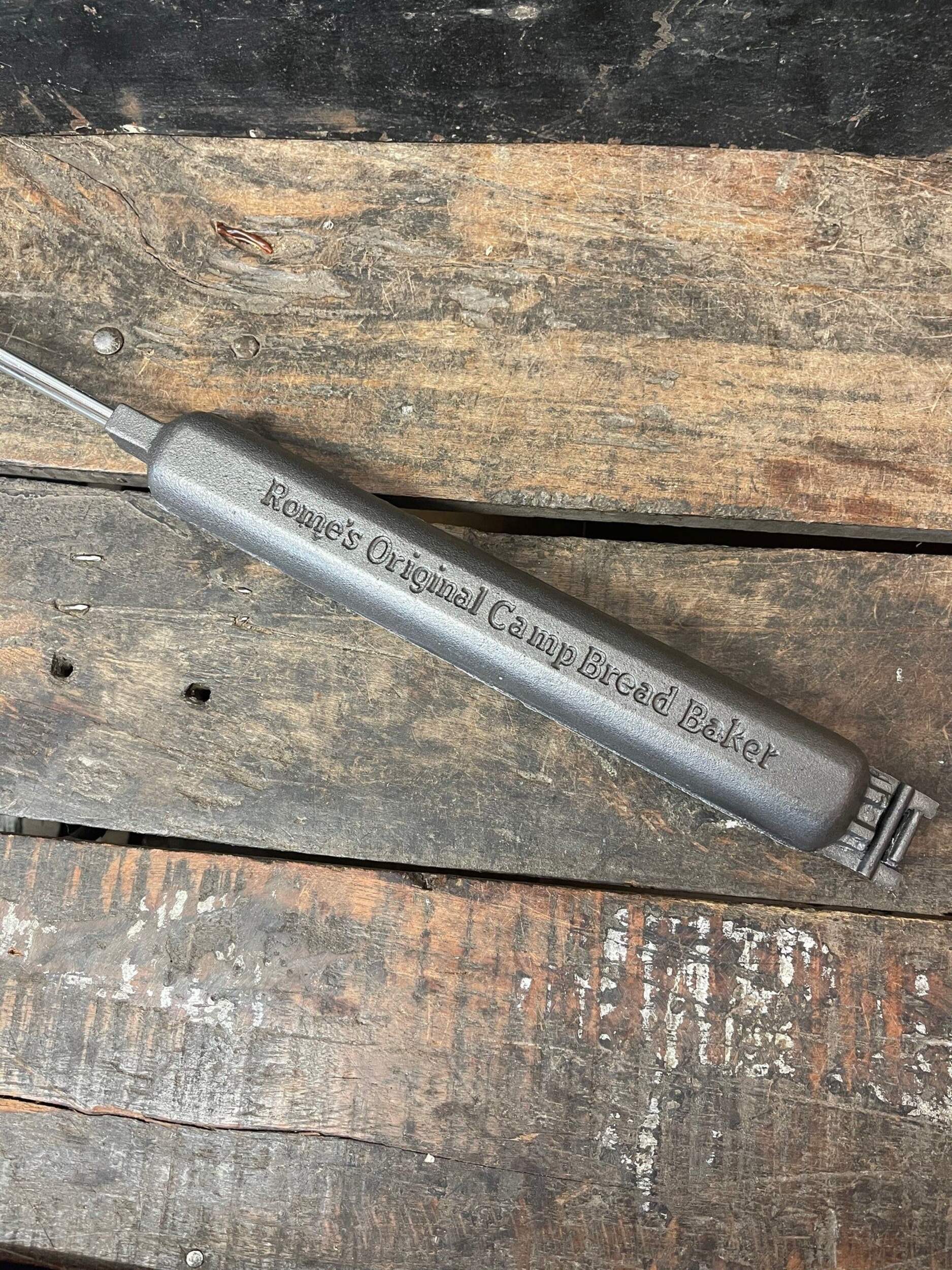 The camp bread baker from Rome is an easy way to make quick breads, cornbread, burritos and wraps or grilled sausages over the campfire. Cast iron cooker features two castings that join together with a hinge to make a cooking cavity that is 12" long by 1.5" dia. To make quick bread, simply oil the cooking cavity and fill one side with dough and cook in the fire until done. Steel rods with quality wood handle for ease of use. Overall length is 30". Great on a campfire or bbq. Complete recipes and instructions included. 10 year warranty.