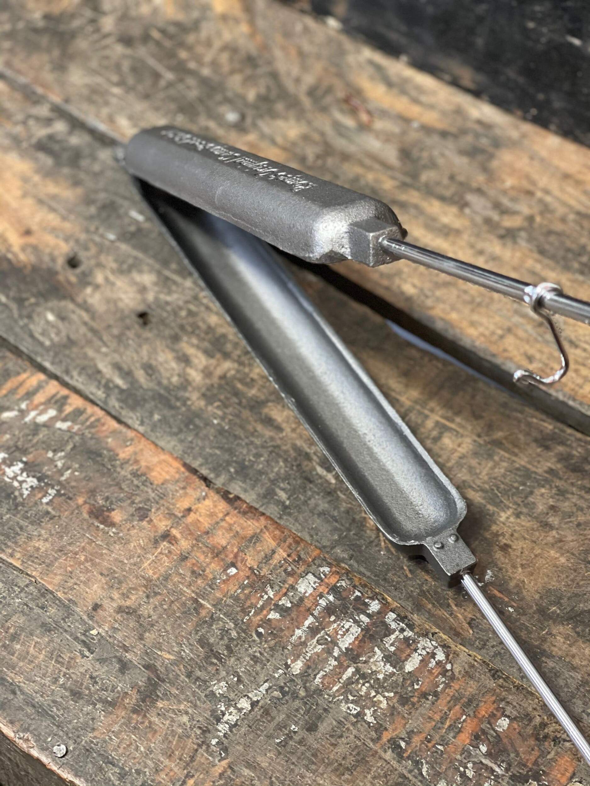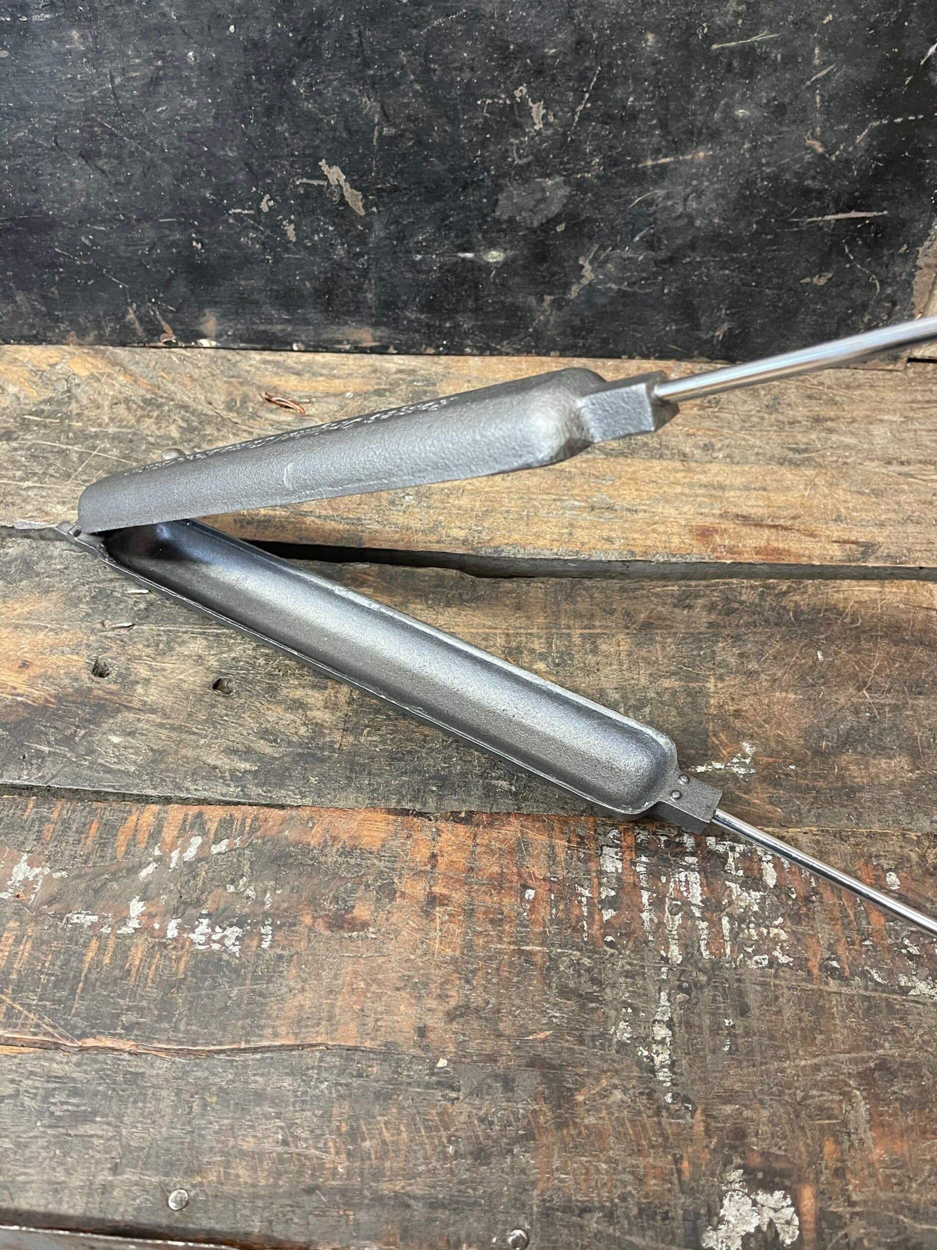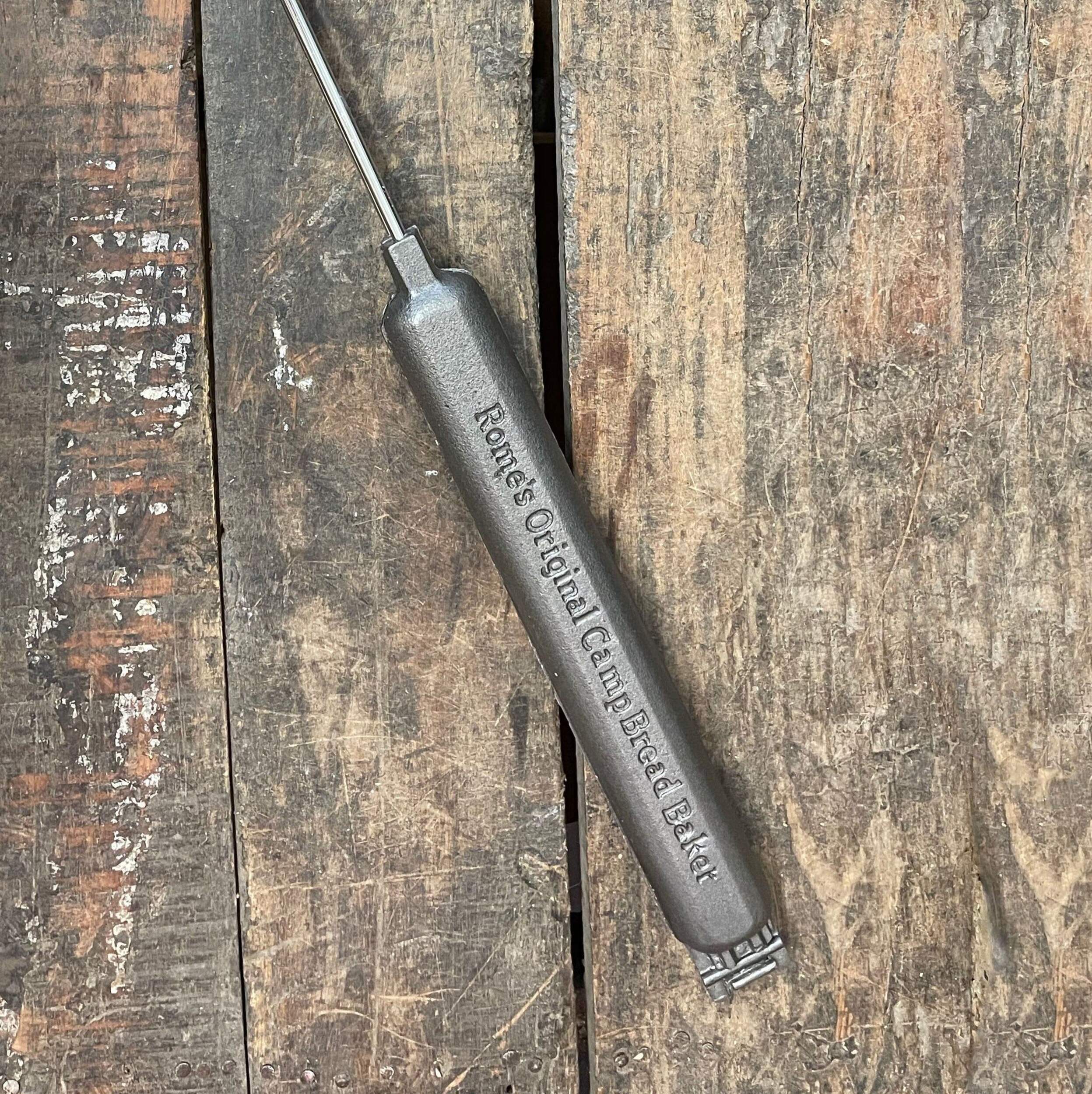 The camp bread baker from Rome is an easy way to make quick breads, cornbread, burritos and wraps or grilled sausages over the campfire. Cast iron cooker features two castings that join together with a hinge to make a cooking cavity that is 12" long by 1.5" dia. To make quick bread, simply oil the cooking cavity and fill one side with dough and cook in the fire until done. Steel rods with quality wood handle for ease of use. Overall length is 30". Great on a campfire or bbq. Complete recipes and instructions included. 10 year warranty.
