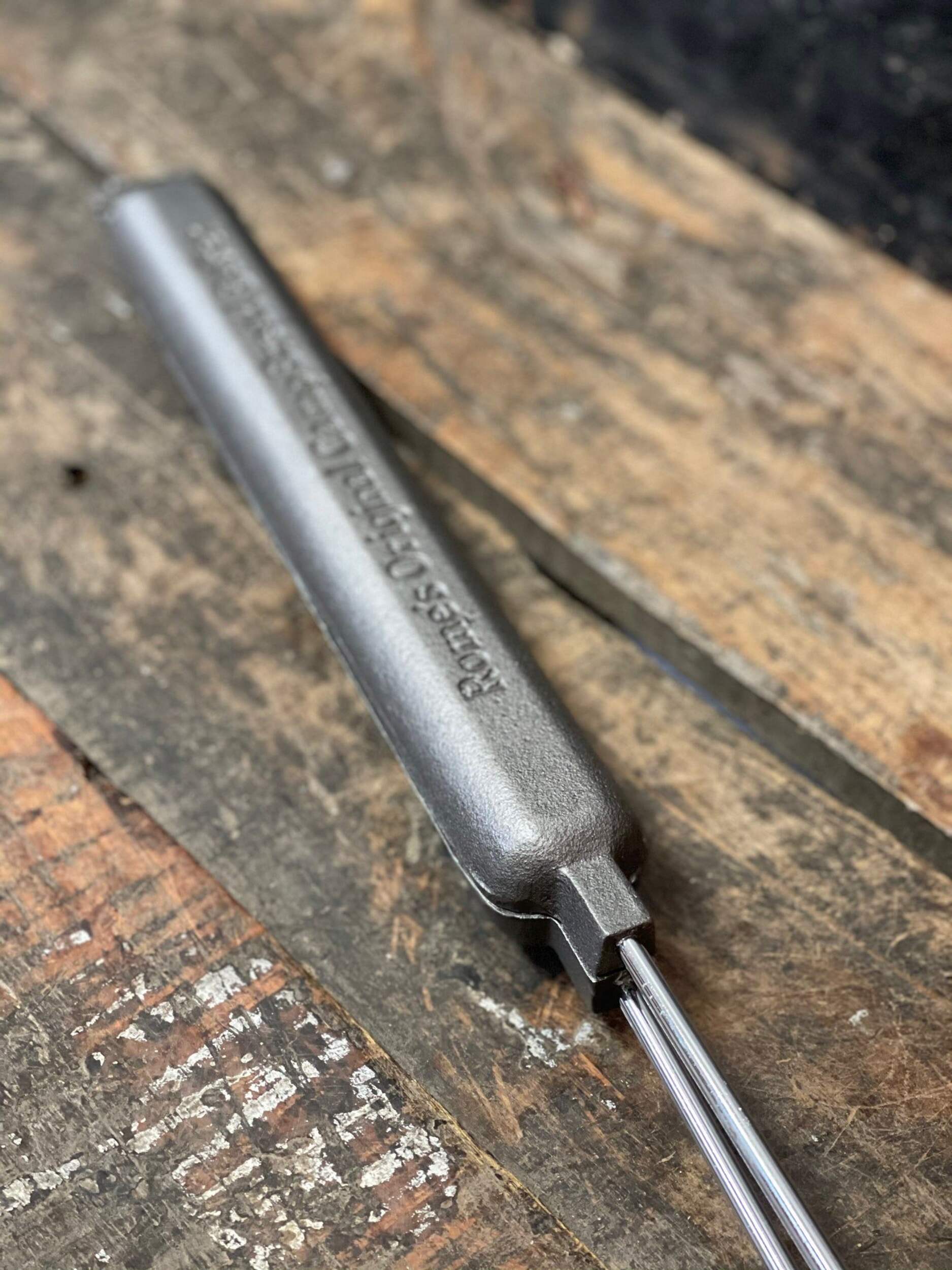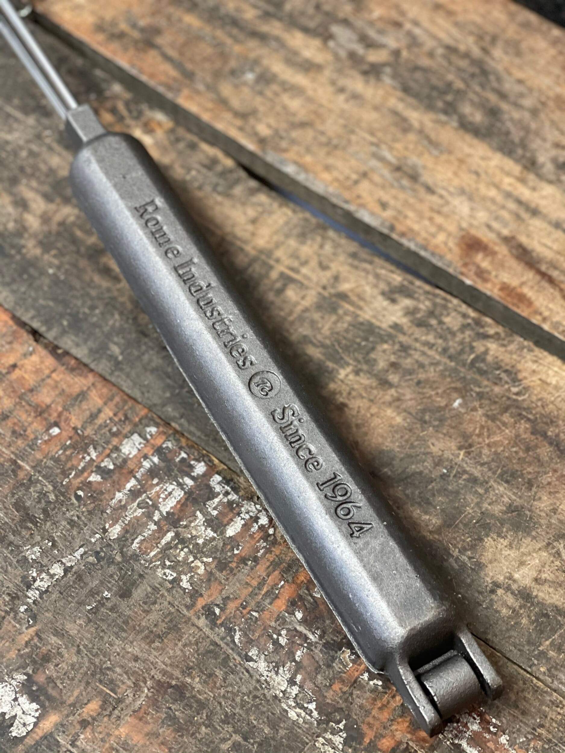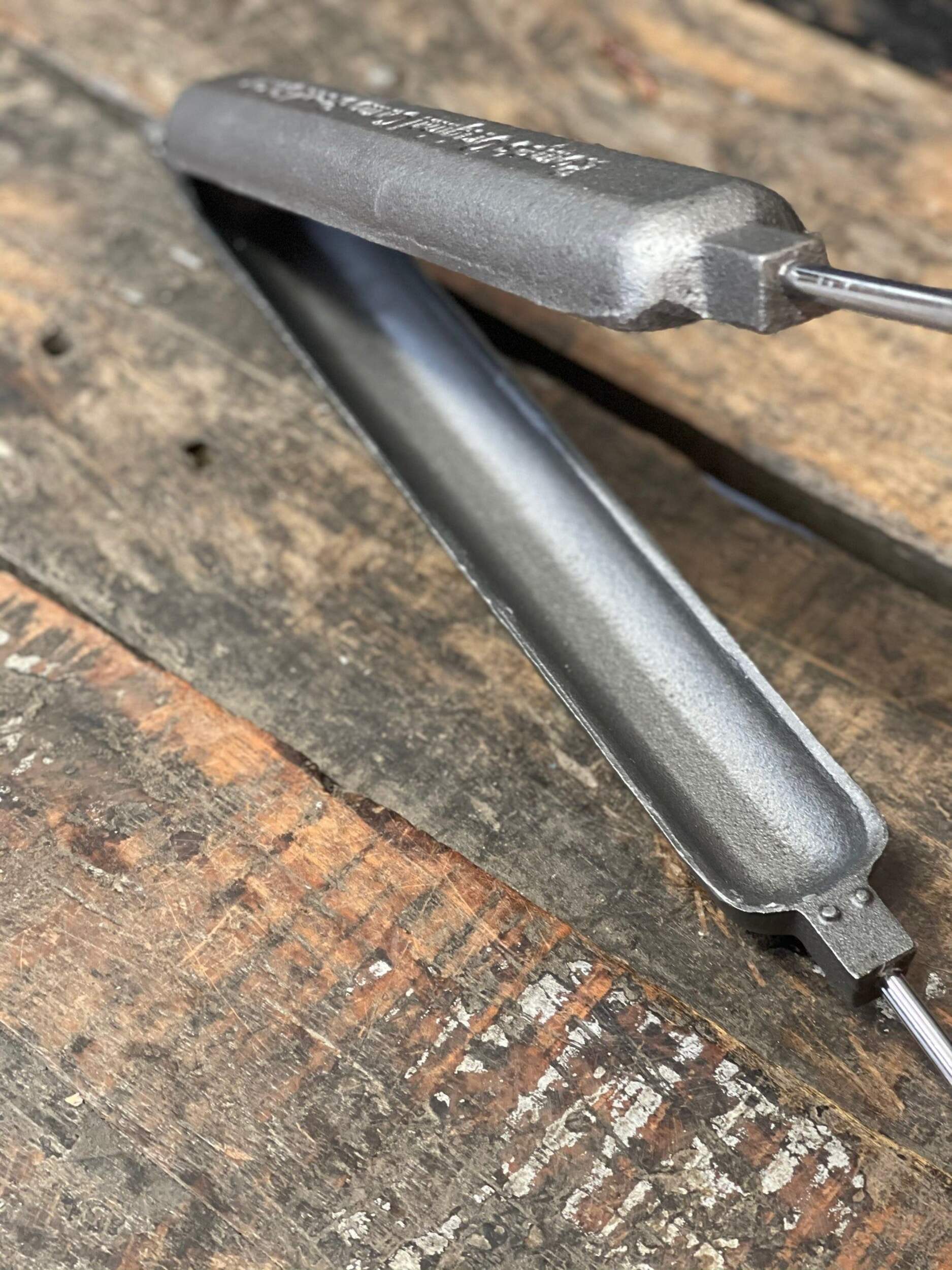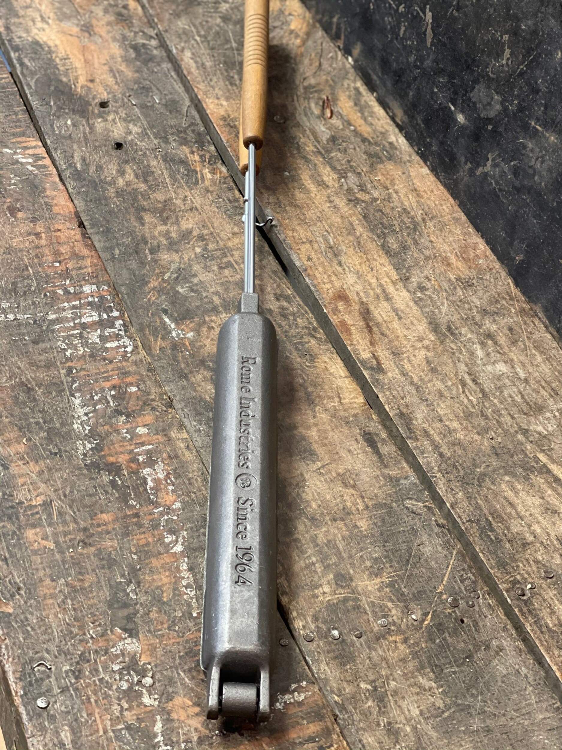 The camp bread baker from Rome is an easy way to make quick breads, cornbread, burritos and wraps or grilled sausages over the campfire. Cast iron cooker features two castings that join together with a hinge to make a cooking cavity that is 12" long by 1.5" dia. To make quick bread, simply oil the cooking cavity and fill one side with dough and cook in the fire until done. Steel rods with quality wood handle for ease of use. Overall length is 30". Great on a campfire or bbq. Complete recipes and instructions included. 10 year warranty.