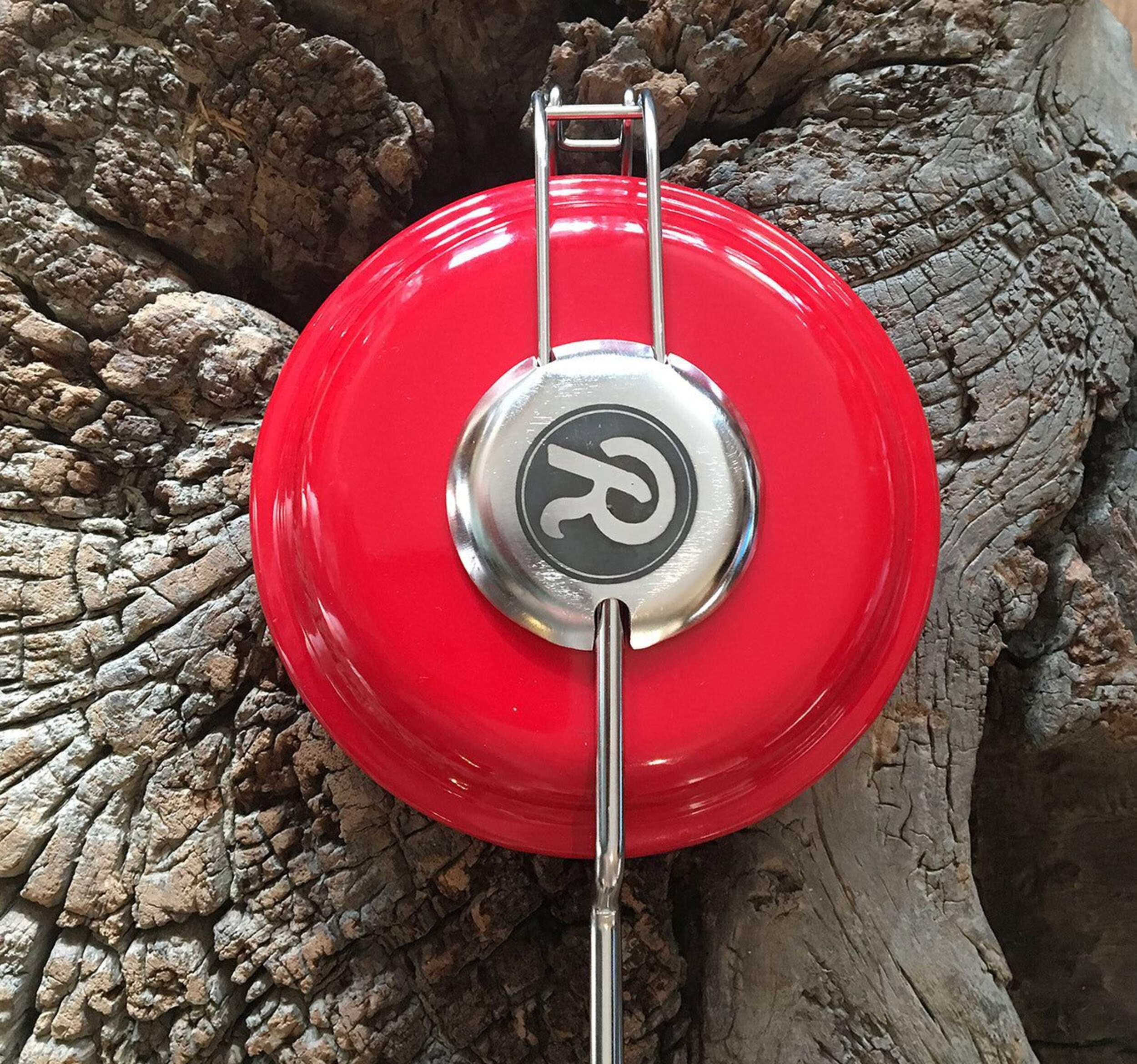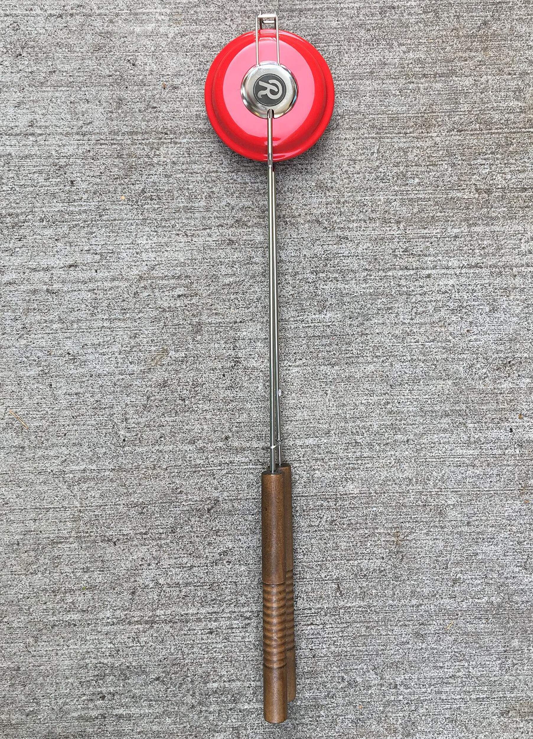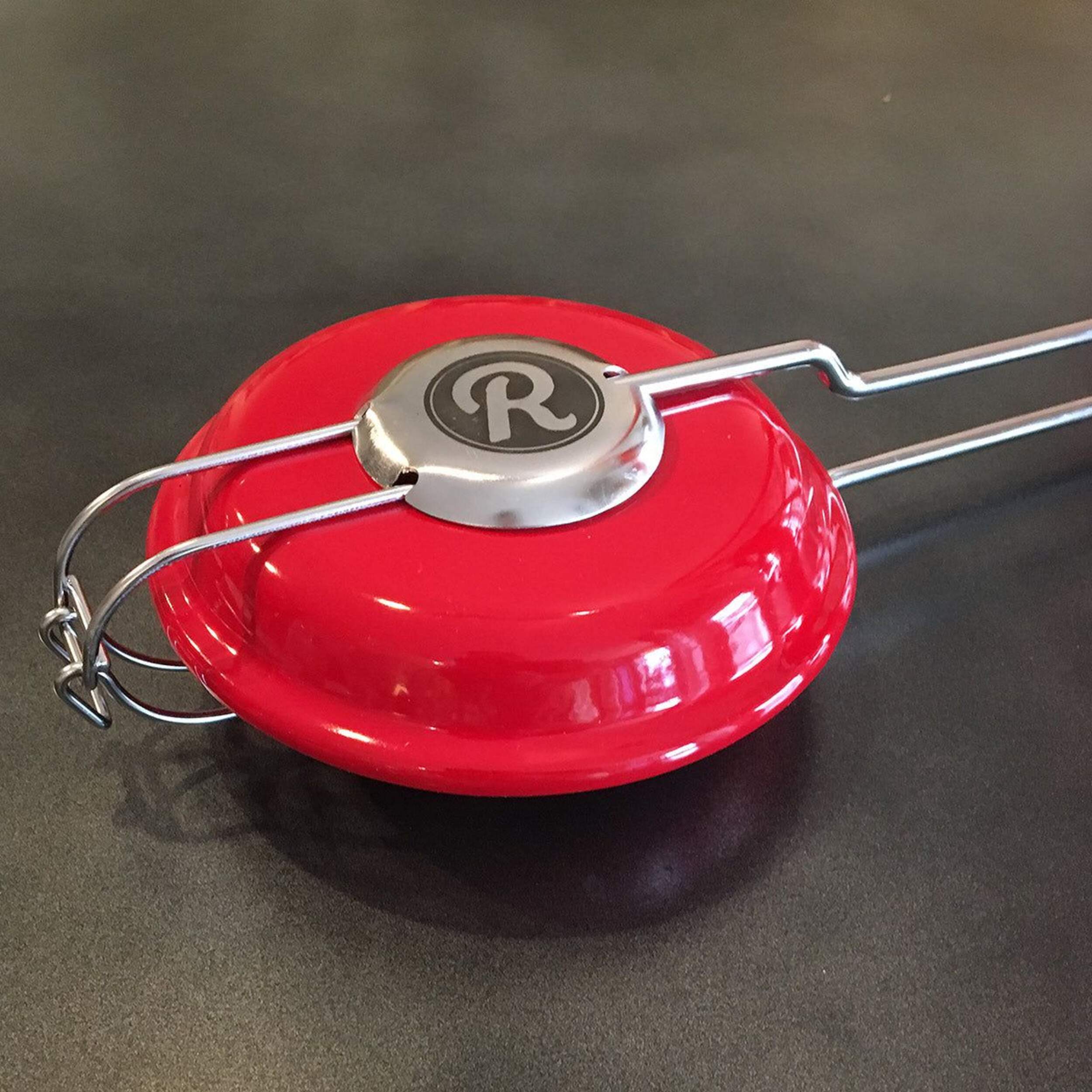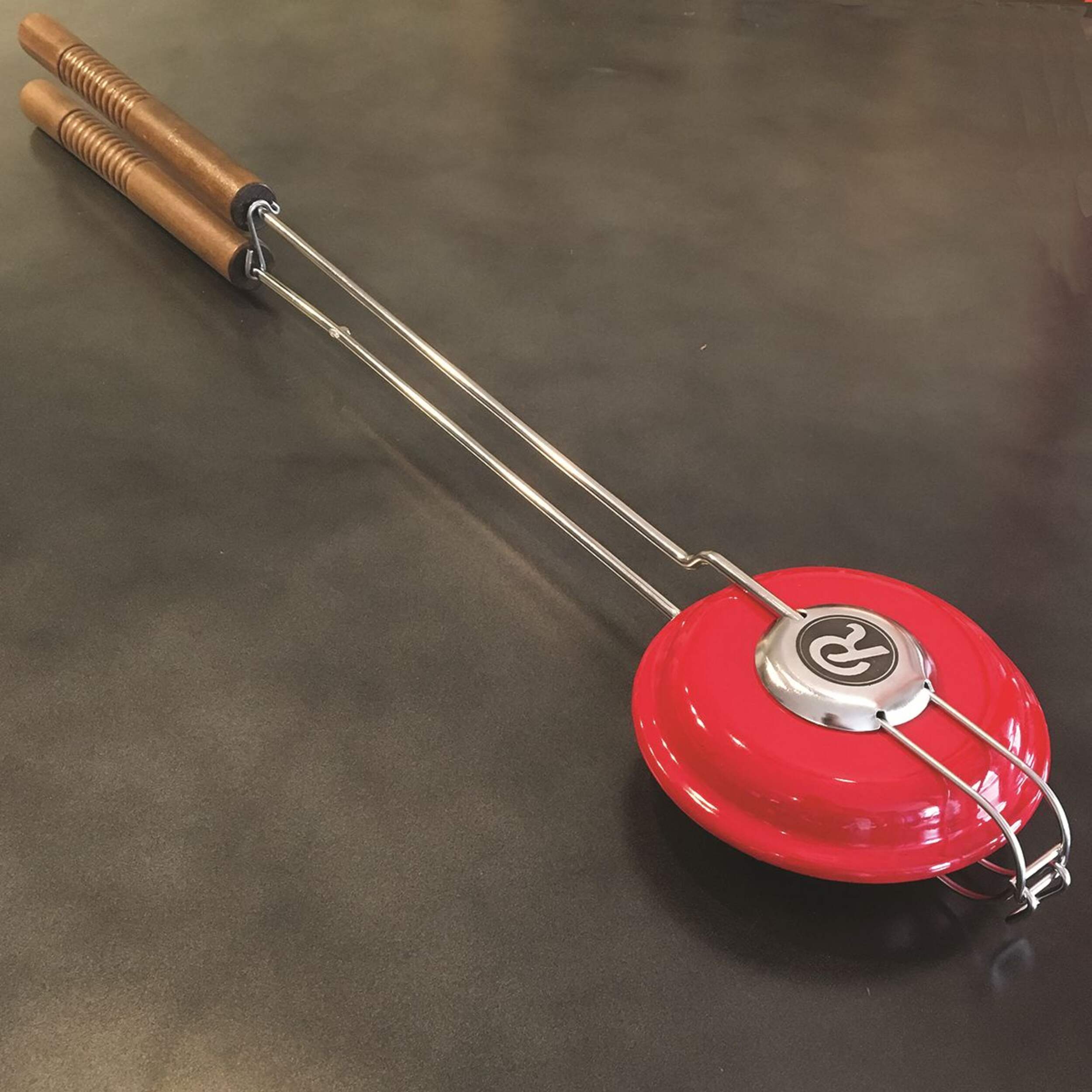 A lightweight round pie iron made from steel with a baked enamel finish. The goal in designing this pie iron was to develop an alternative to cast iron that was not only lightweight, but also easy to clean and flexible in use from the grill, firepit or campfire. All of this was done with style and special design touches that Rome pie irons are known for.The round design is trims the excess bread and makes a perfect sealed pie that's just under 5" diameter. Overall length is 26" Weighs 1 lb.The unique hinge construction makes opening and closing the iron a smooth motion. Inside the iron is a stainless steel campfire flame image which imprints into the bread when it toasts.Great for all kinds of sweet and savory pocket treats. Just take two pieces of bread and fill with cheeses, preserves & jam etc...