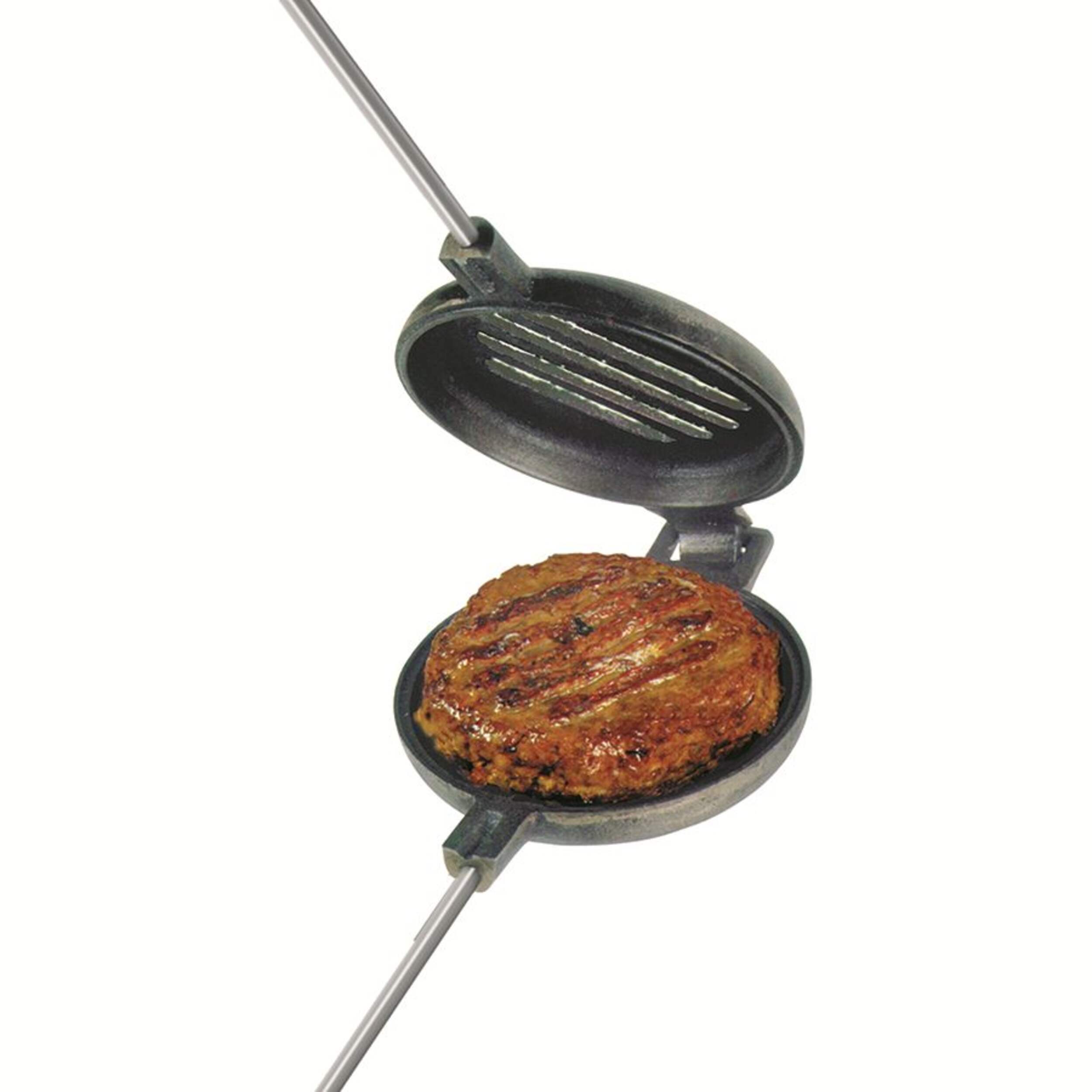 Rome's cast iron burger griller is a great way to cook not only hamburgers over the fire, but salmon patties, crab cakes, large stuffed chicken breast, kofta etc..Fill the cooking cavity with meat, close the lid and hold over the heat source. Flip once or twice until done. The slotted cast iron cavity simulates grilling on a grate and allows excess fat to drip from the meat. 4.25" cooking surface. 28" overall length. Cast iron cooking head with stainless steel rods and wood handles. Complete recipes and instructions included. 10 year warranty.