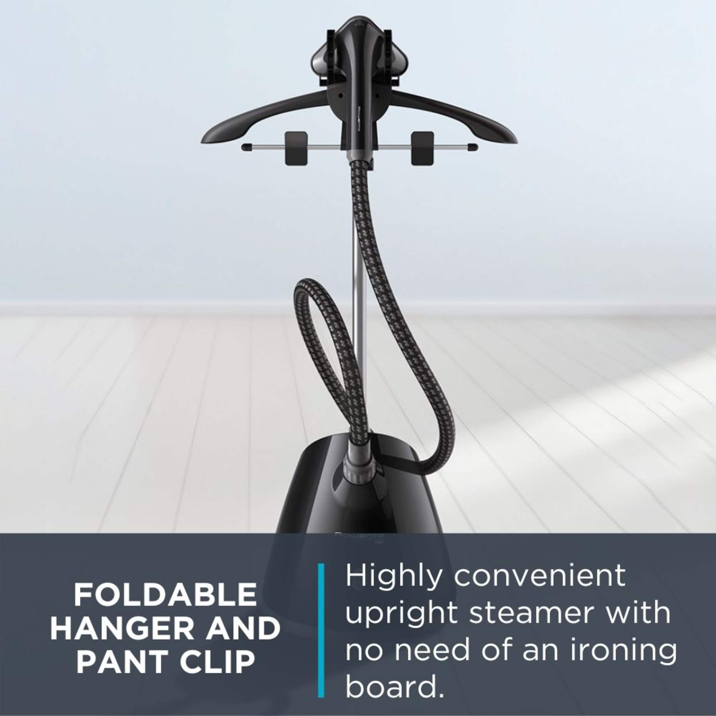 Convenient upright steamer comes with a foldable hanger and pant clip