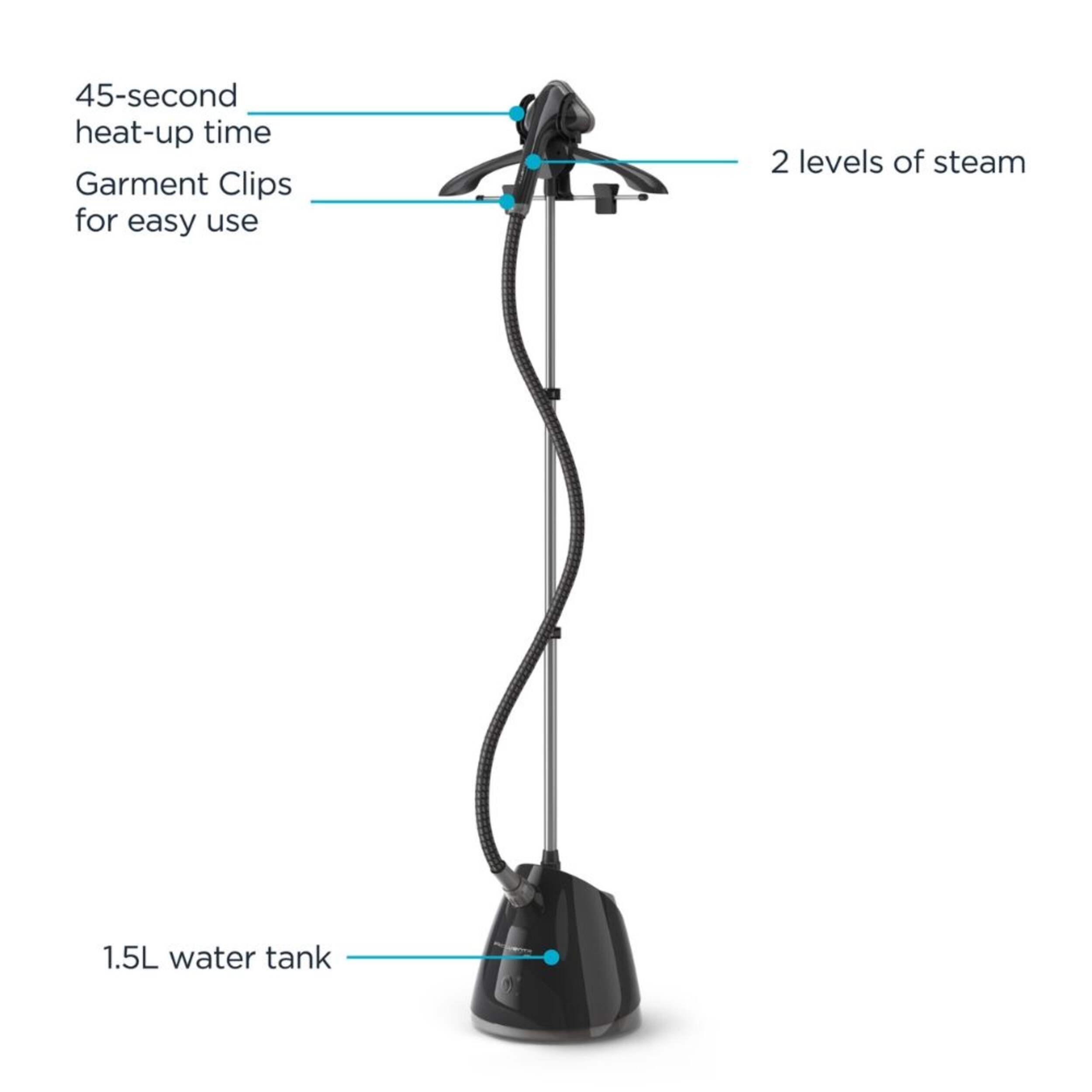 Refresh and sanitize your wardrobe from the convenience of home with the powerful Rowenta 1500W Upright Garment Steamer. This stylish upright steamer uses deep steam to eliminate wrinkles and freshen all types of fabrics. It heats in just 45 seconds to steam curtains, suits, dresses and other delicate items easily and efficiently. Dual voltage allows you to use the steamer anywhere, so it's ideal for business travel or vacations and the perfect solution for maintaining your wardrobe.