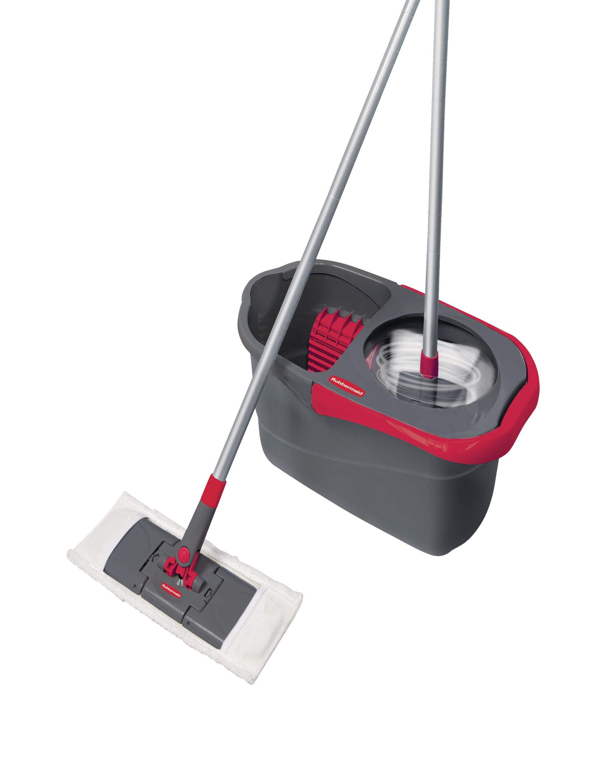 The Rubbermaid Microfibre Flat Spin Mop Floor Cleaning System comes with a collapsible easy-wringing mop handle, a microfibre mop head that removes 99% of dust & allergens, and a lightweight wringing mop bucket with scrubbing panels.