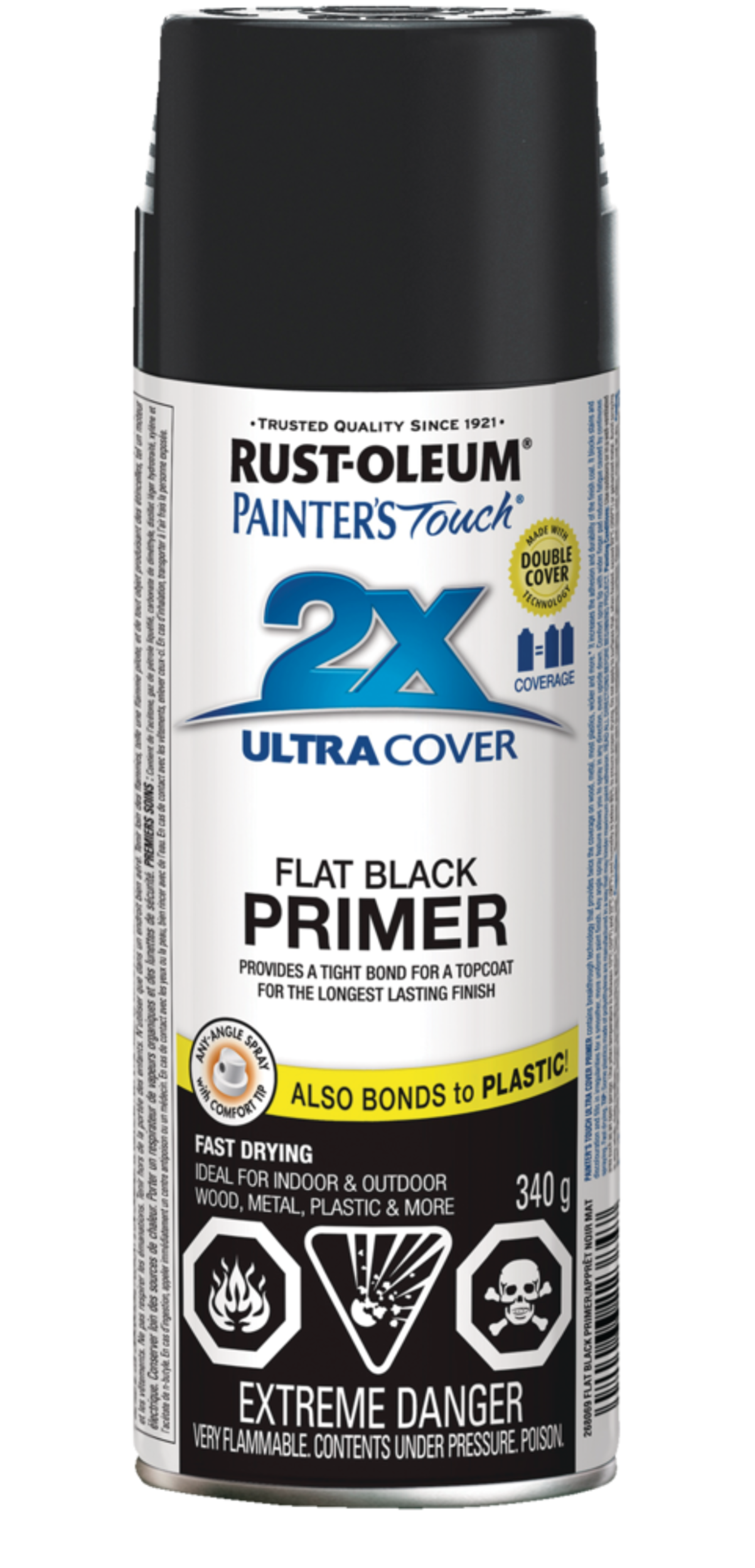 Rust-Oleum's 2X Ultra Cover Multi-Purpose Aerosol Spray Paint & Glossy Primer contains breakthrough technology that provides superior coverage on wood, metal, wicker and more. It covers surfaces with less spray passes, allowing projects to be completed faster and easier. Any angle spray feature allows you to spray in any direction, even upside down. Comfort spray tip with wider finger pad reduces fatigue caused by continuous spraying.