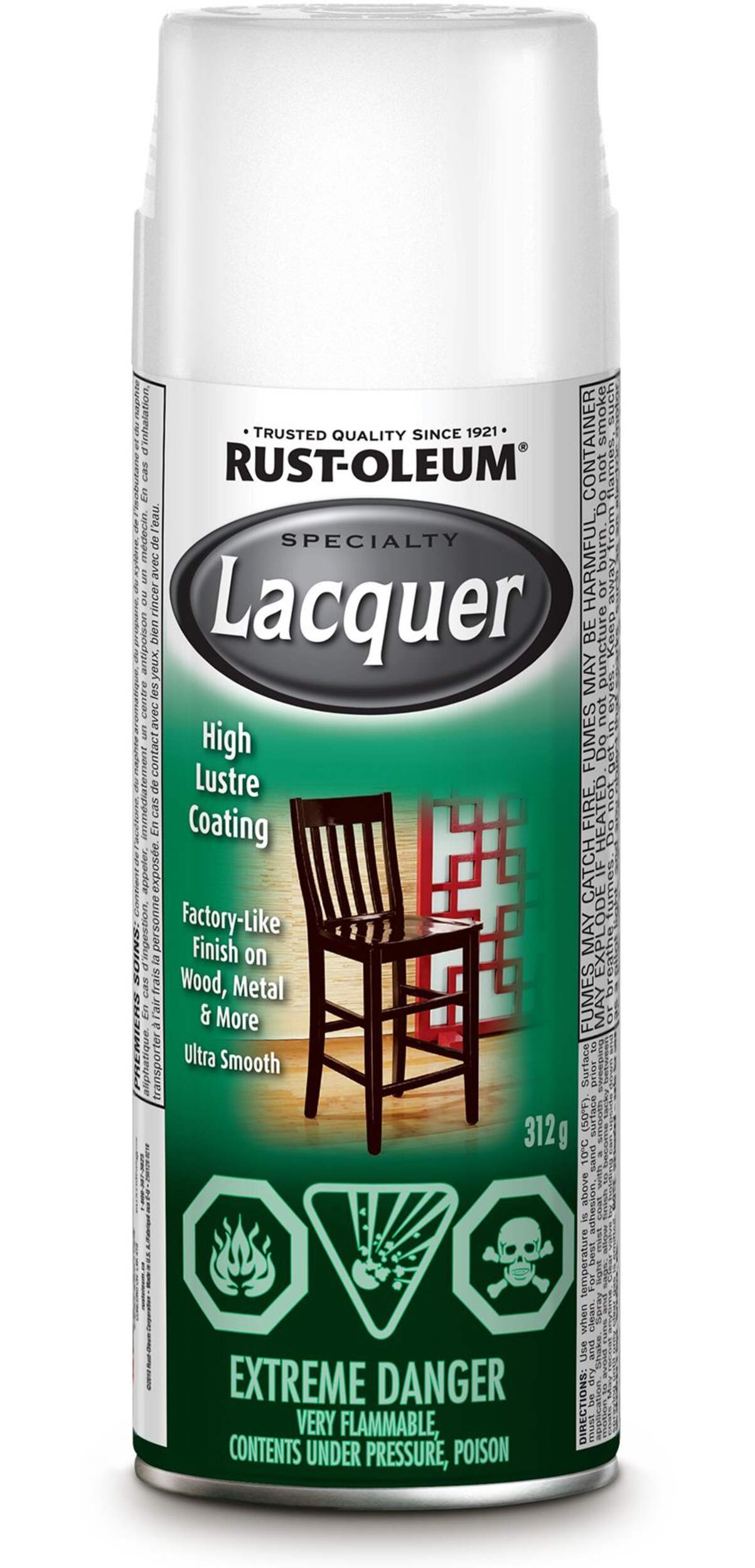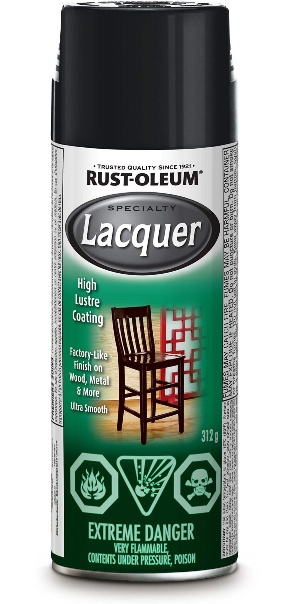 Rust-Oleum Specialty Lacquer Spray Paint adds an ultra-hard, factory-like finish to furniture and accessories. Apply to wood, metal, plaster, masonry or unglazed ceramic. Hardens to high luster.