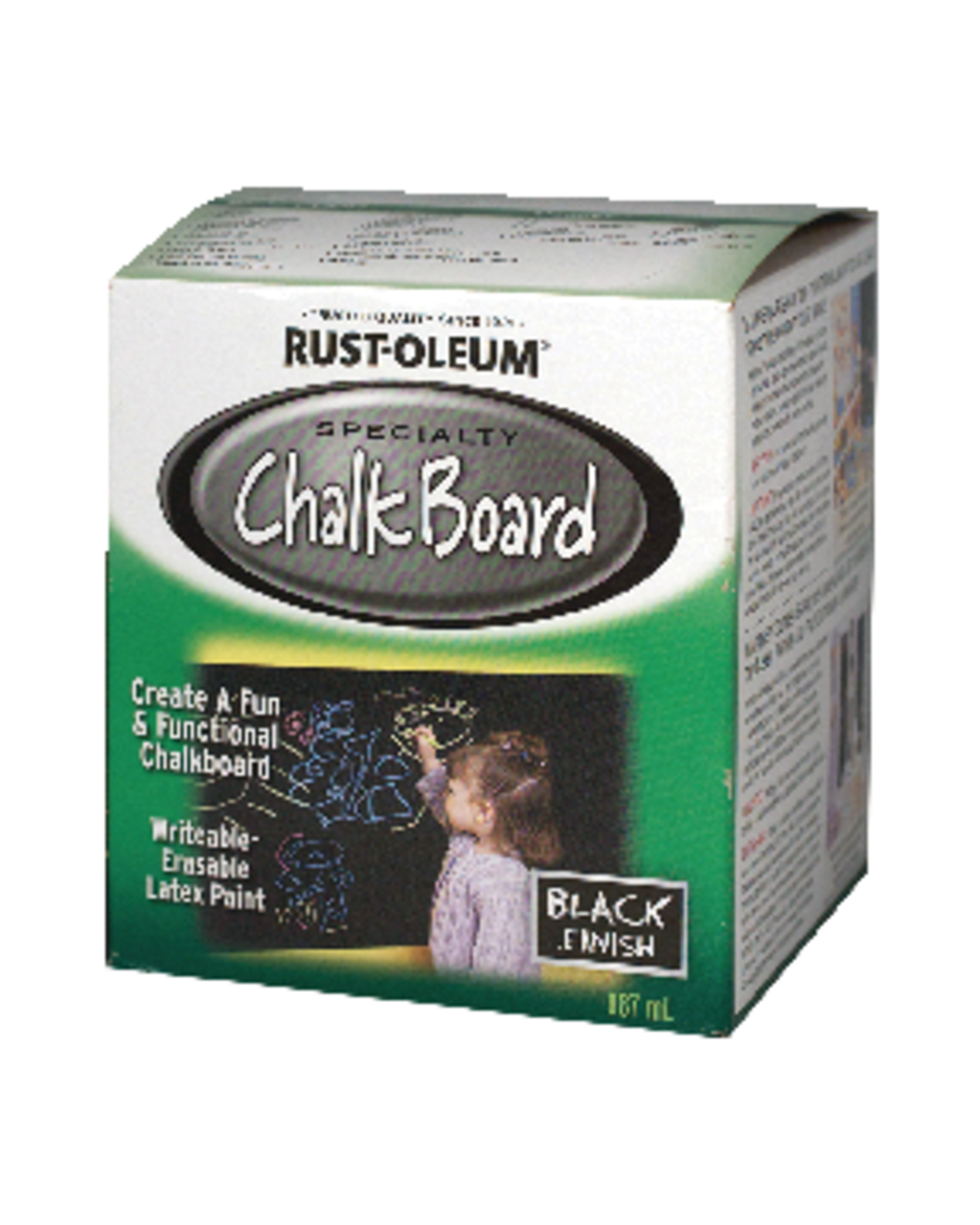 Rust-Oleum Specialty Chalk Board Paint converts surfaces into a usable chalkboard. Apply to metal, wood, plastic, hardboard, glass or paperboard. Erases cleanly. Holds up to repeated chalk writing.