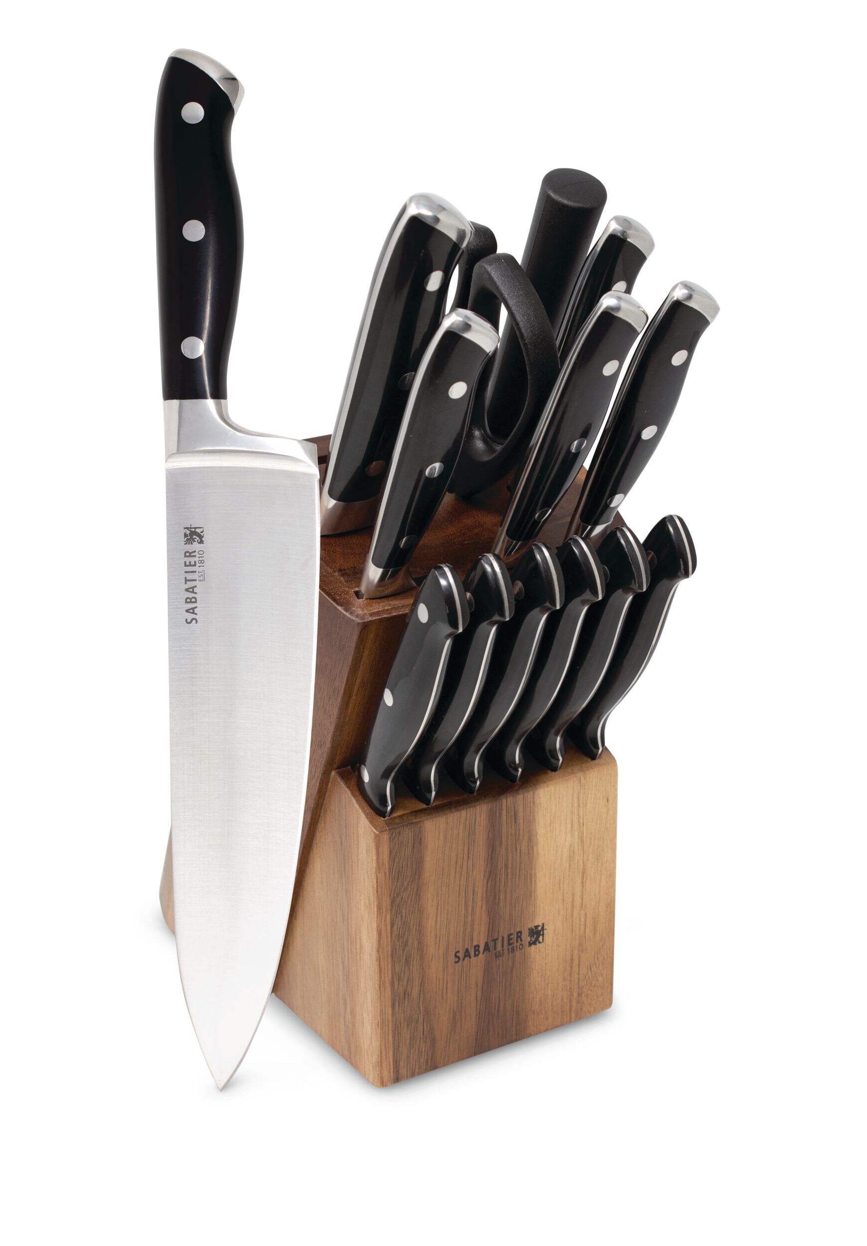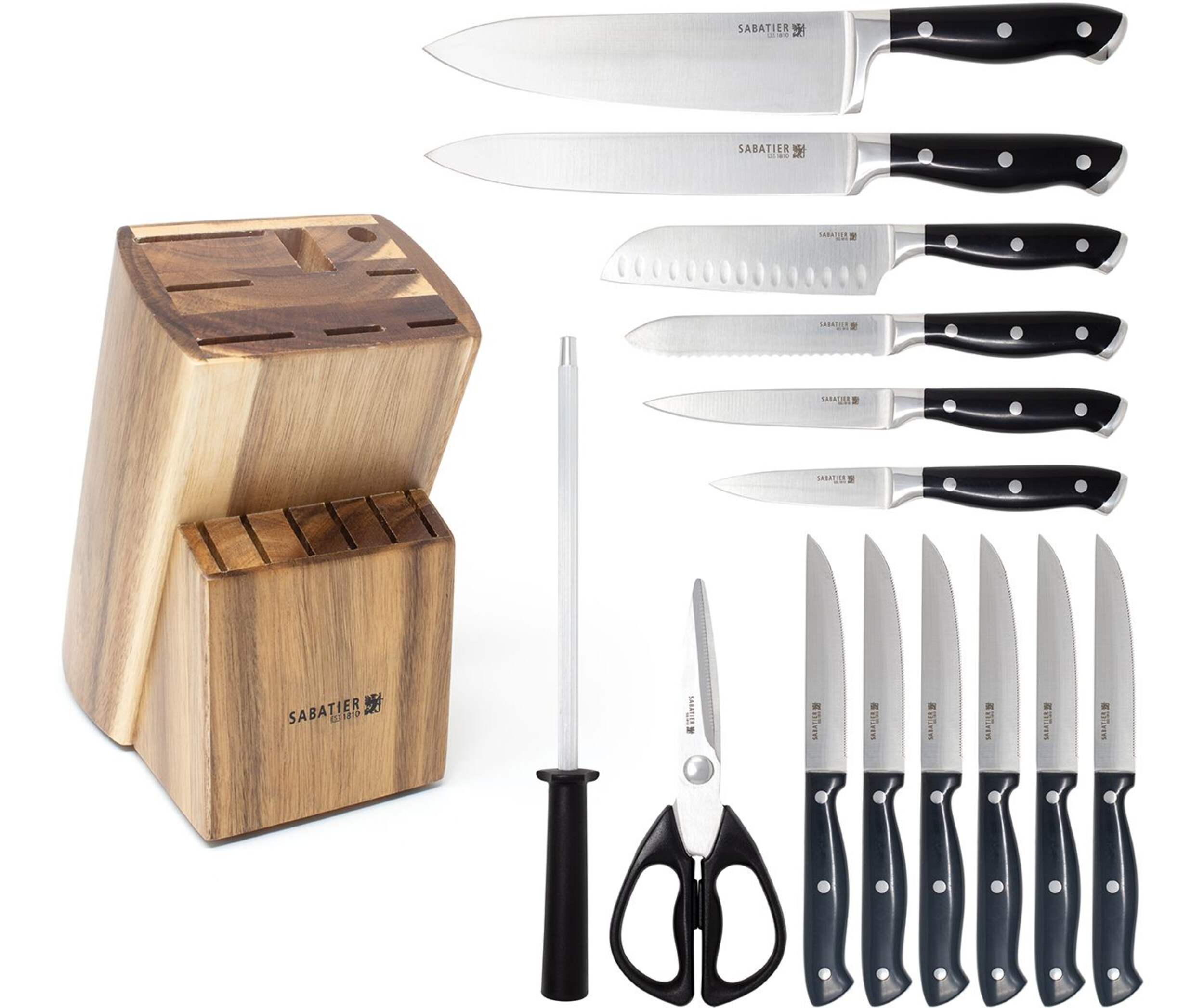 15-piece set includes: (1) 8" chef knife, (1) 8" carving knife, (1) 5" Santoku knife, (1) 5" serrated utility knife, (1) 4.5" fine edge utility knife, (1) 3.5" paring knife, (6) 4.5" steak knives, (1) kitchen shears, (1) sharpening steel, (1) acacia wood block