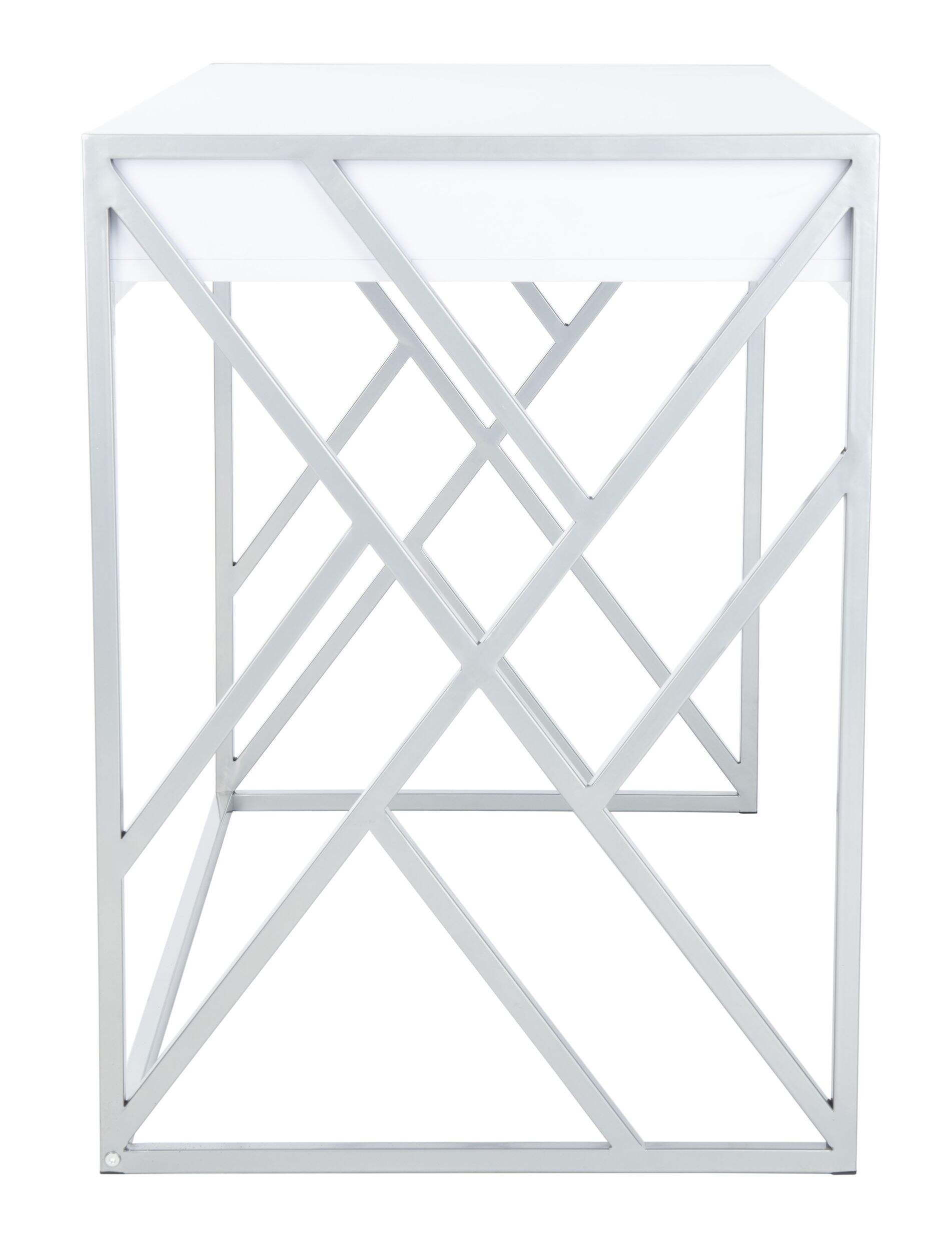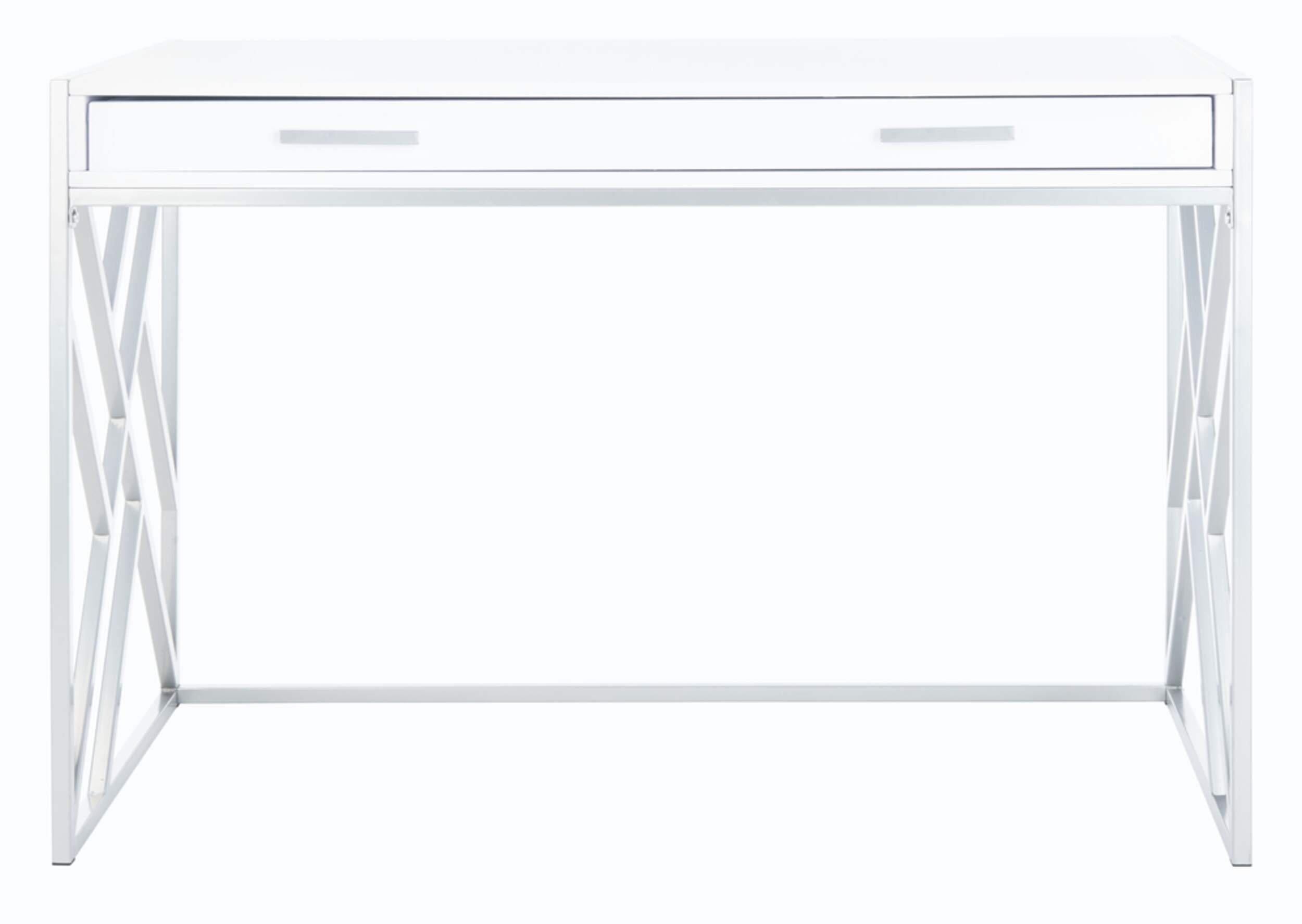 A contemporary glamorization of art deco design, this Safavieh Elaine 1-Drawer Desk transforms the office or workspace with eye-catching sophistication. The desk's sleek white surface is given a modern art touch with a geometric frame in a rich silver finish, the minimalist pulls on its ample drawer perfectly balancing the look.