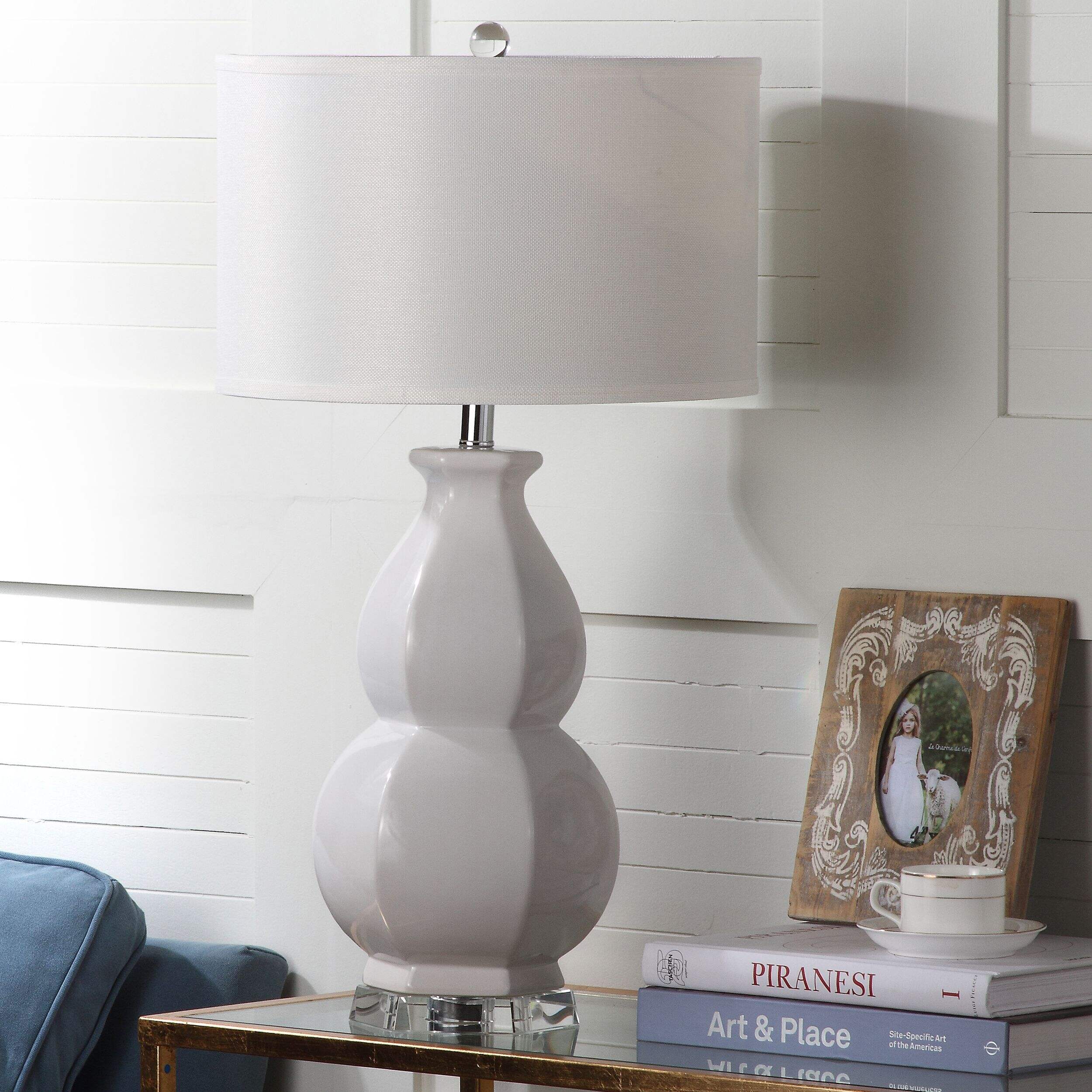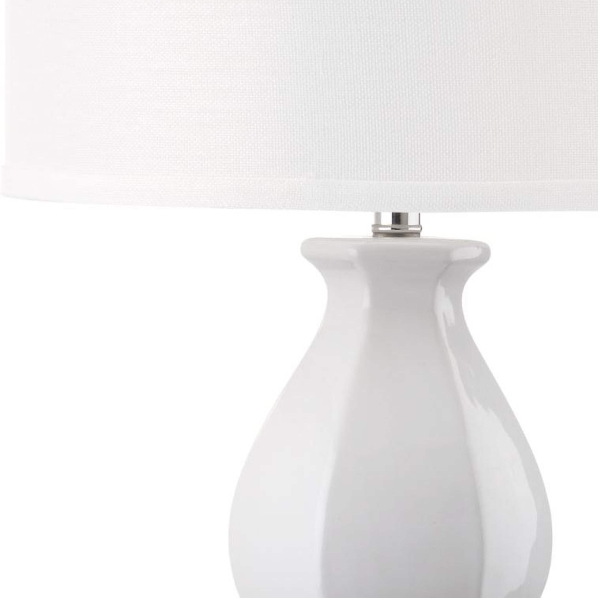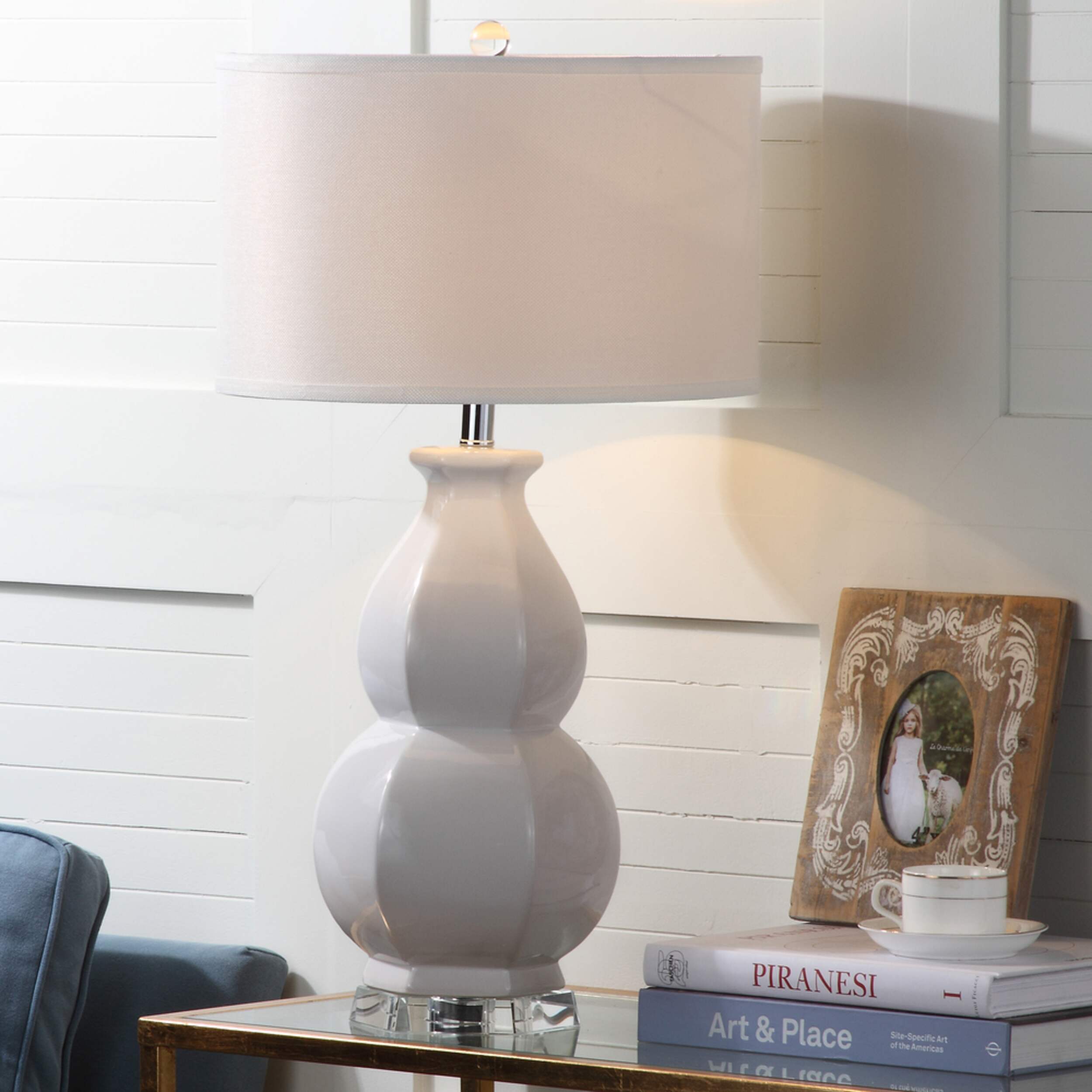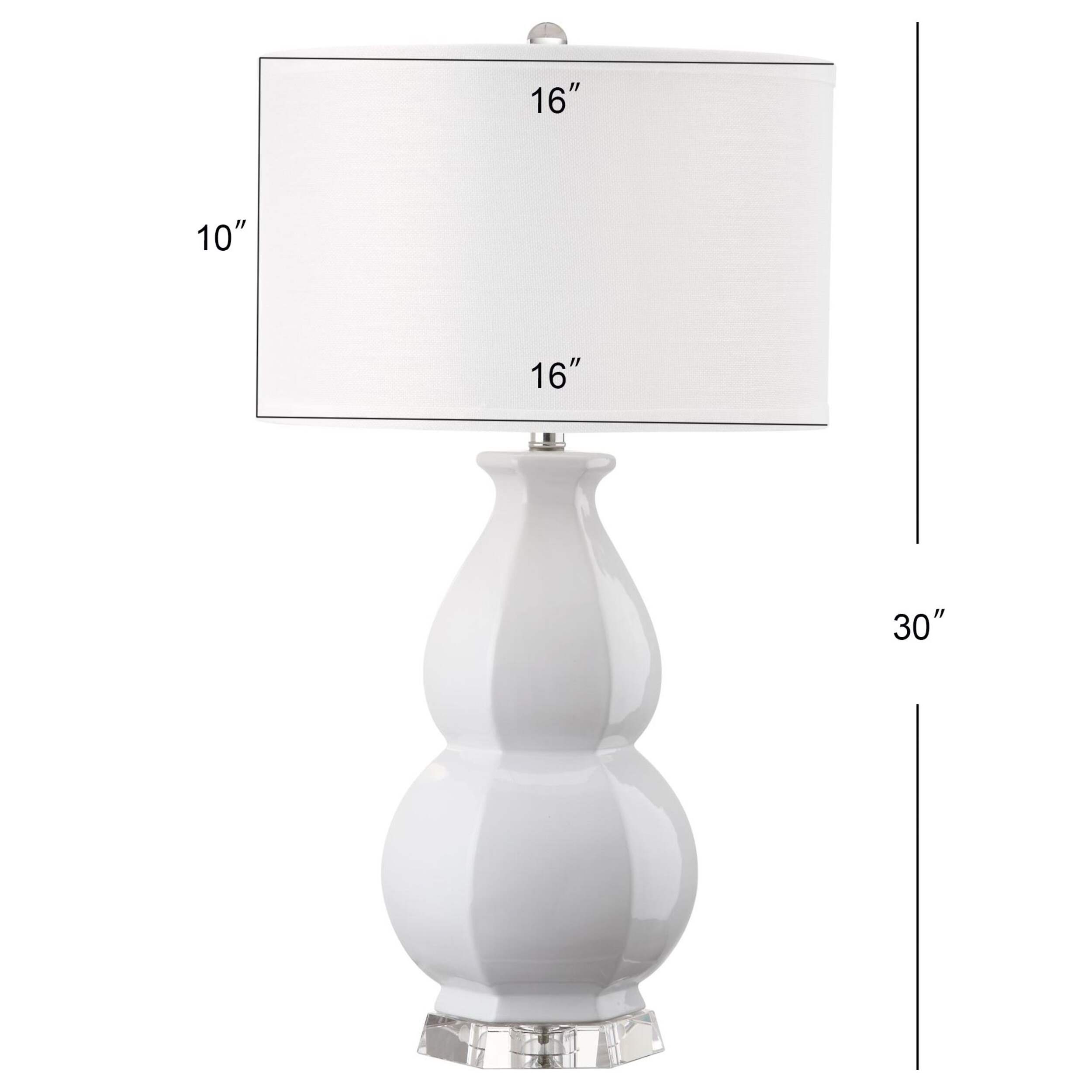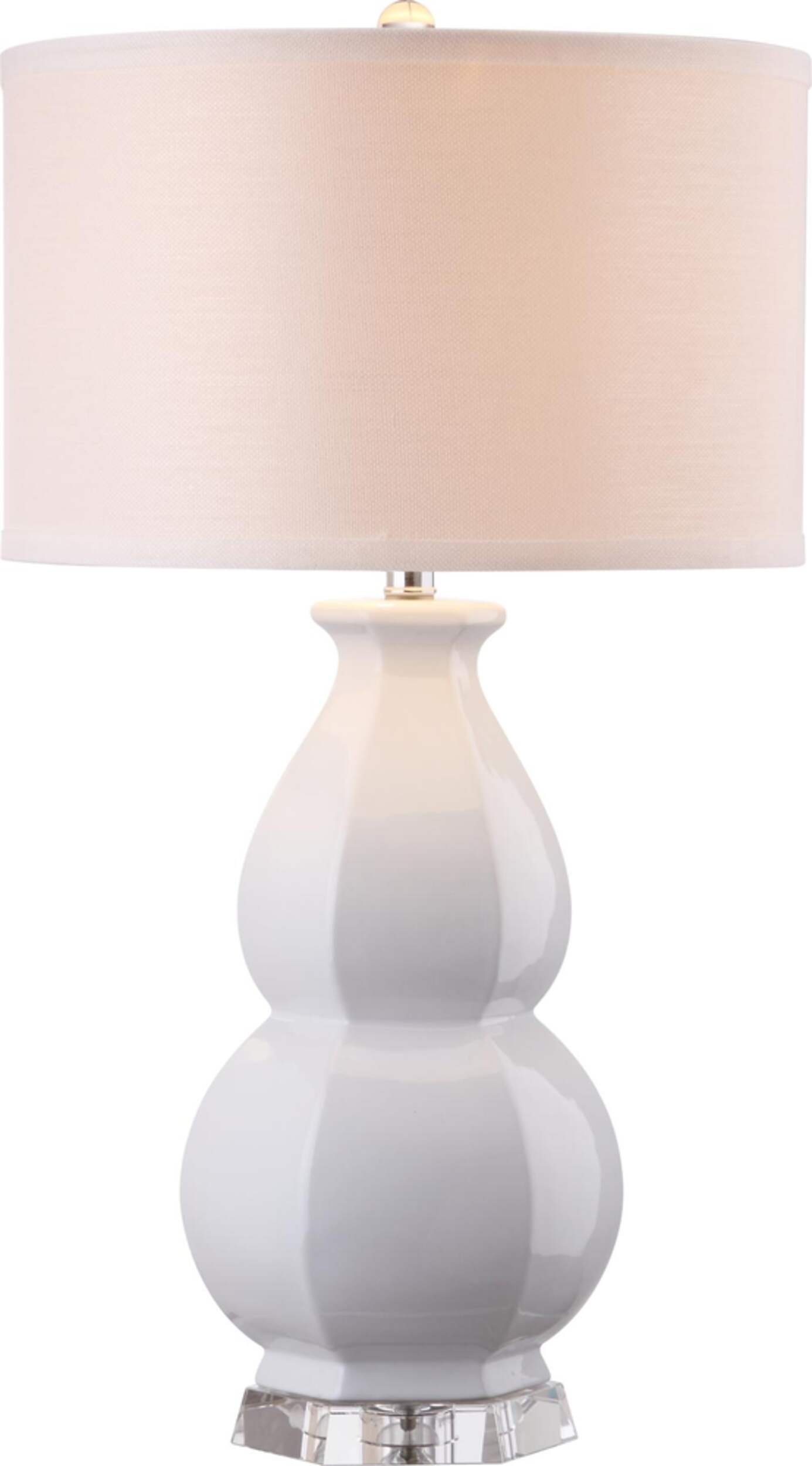 Safavieh Juniper Table Lamp gets a fashion update with faceted detailing in pure white glazed ceramic, a textured white cotton drum shade, and modern acrylic pedestal and finial