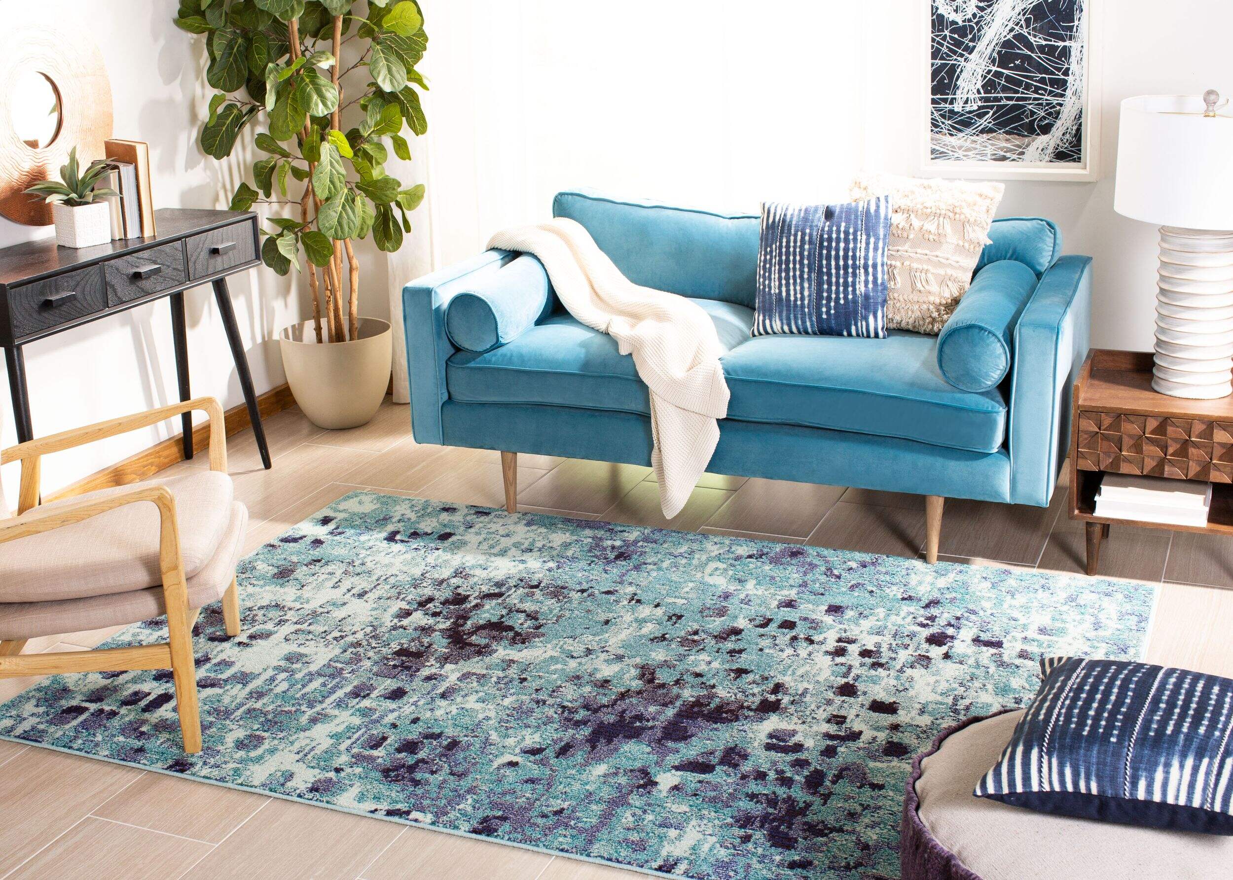 The Safavieh Madison 425 Turquoise/Navy Area Rug brings a modern twist to traditional motifs with its vibrant turquoise and navy palette. Machine-loomed from easy-care synthetic yarns, the rug’s distressed antique patina lends a timeworn look to the classic medallion motifs and intricate detailing. Well-suited for contemporary décor, this large rectangular frieze rug offers long-lasting beauty and a cozy 0.3" pile height. The Madison's versatile style can complement any room. Available in an array of sizes, it's an easy way to add a pop of colour and visual interest to your floor.