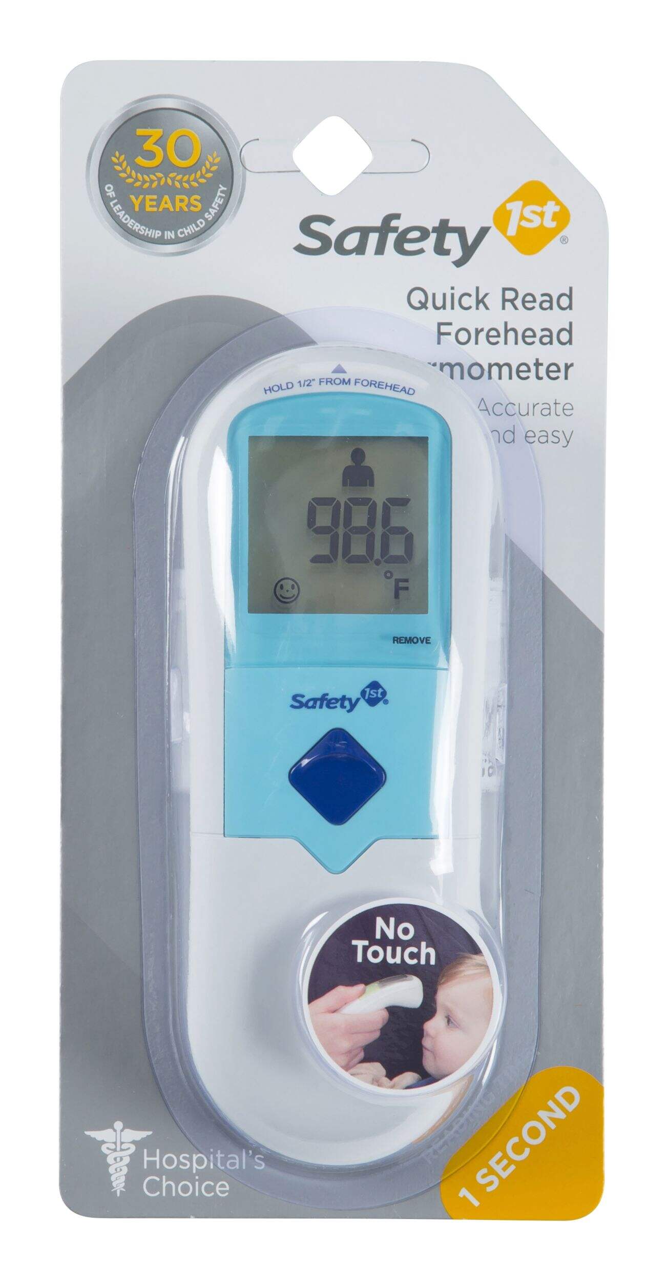 The Safety 1st Quick Read Forehead Thermometer, Blue, provides you with fast and accurate temperature readings without waking up your little one. Simply glide the sensor across your child's forehead and get a reading in just one second, shown on the large display in either Fahrenheit or Celsius. A fever icon appears for high temperatures and the last reading is stored in the memory for handy reference. With its auto shut off and inclusion of 2 AAA batteries, this thermometer is made for busy parents enabling them to quickly and easily check for fever without fuss.