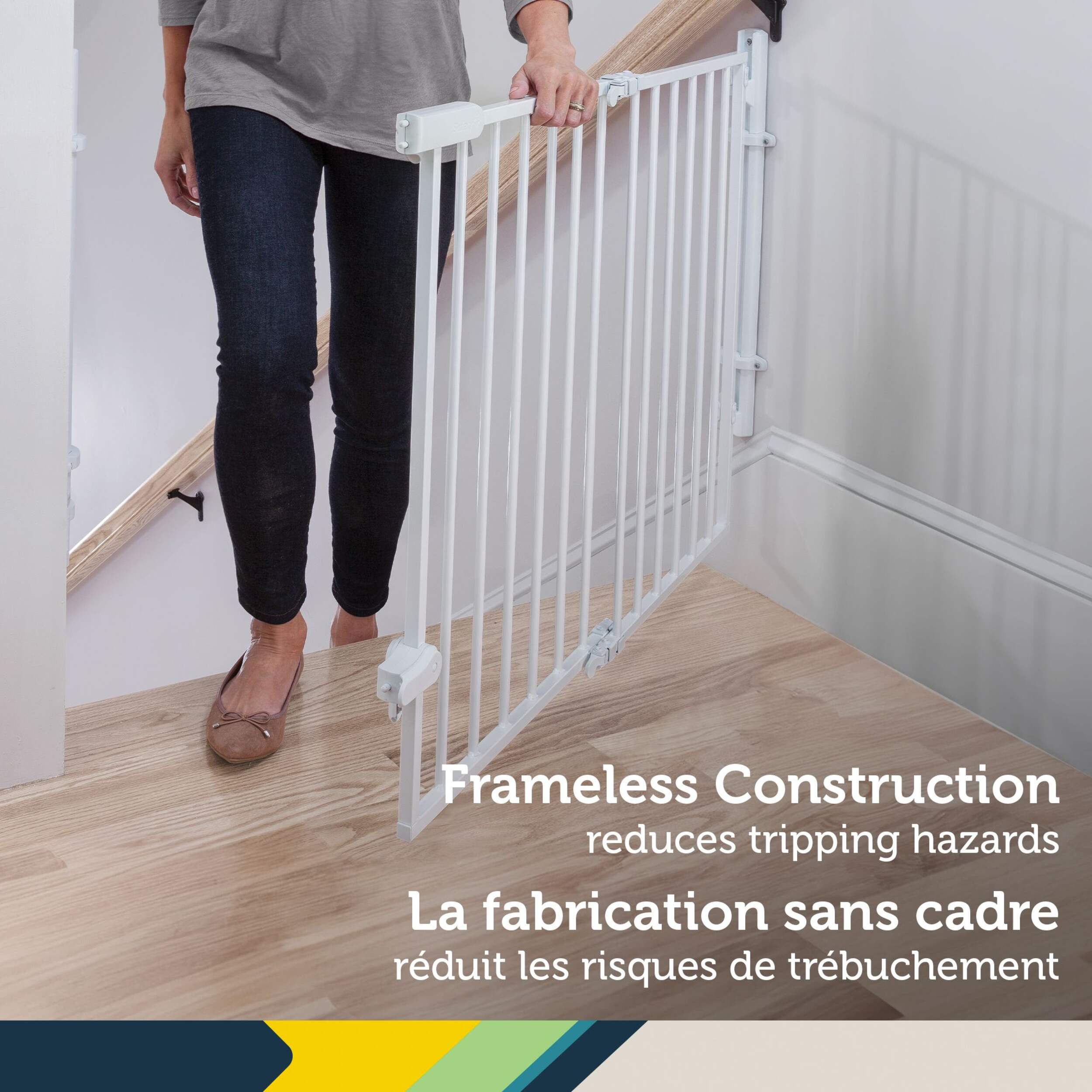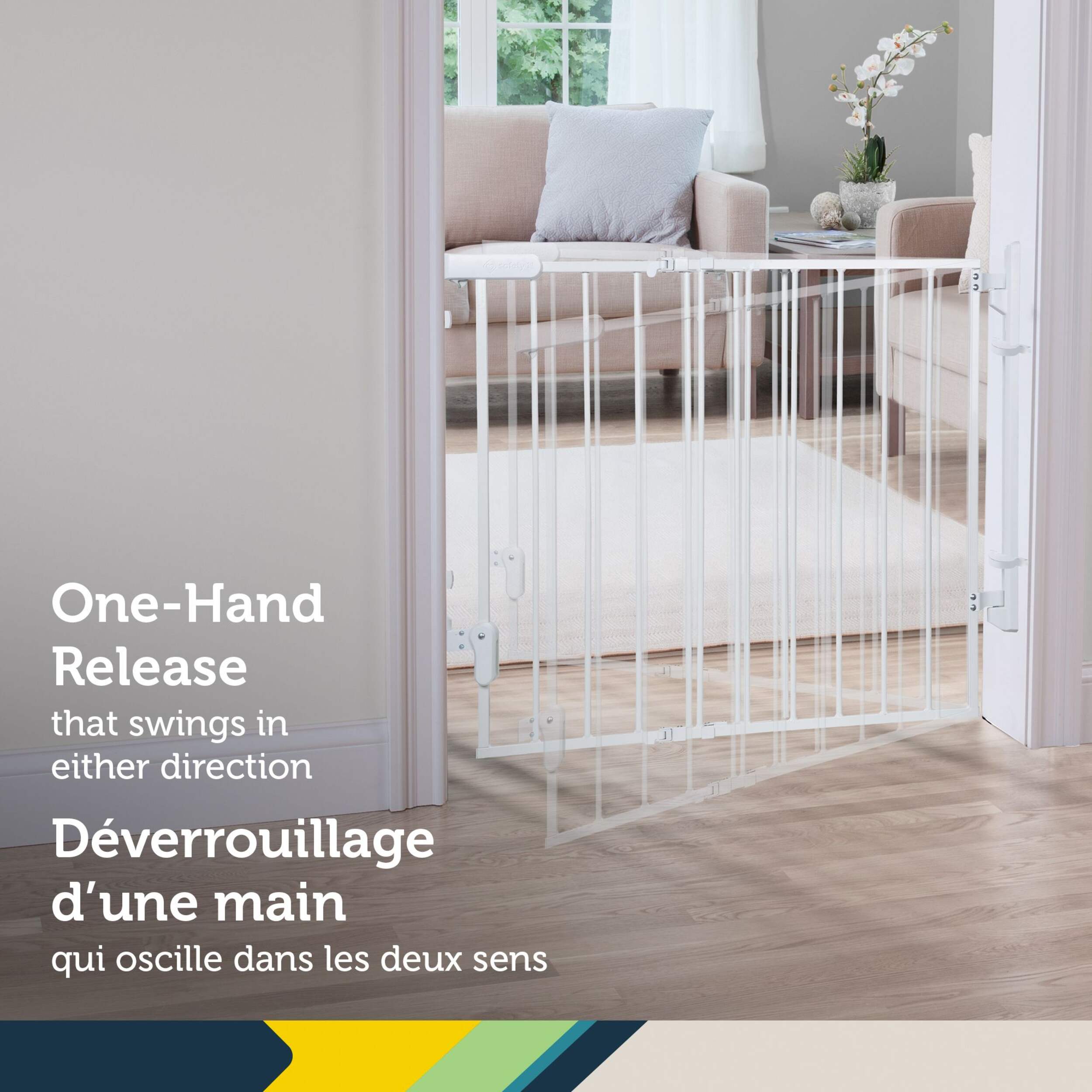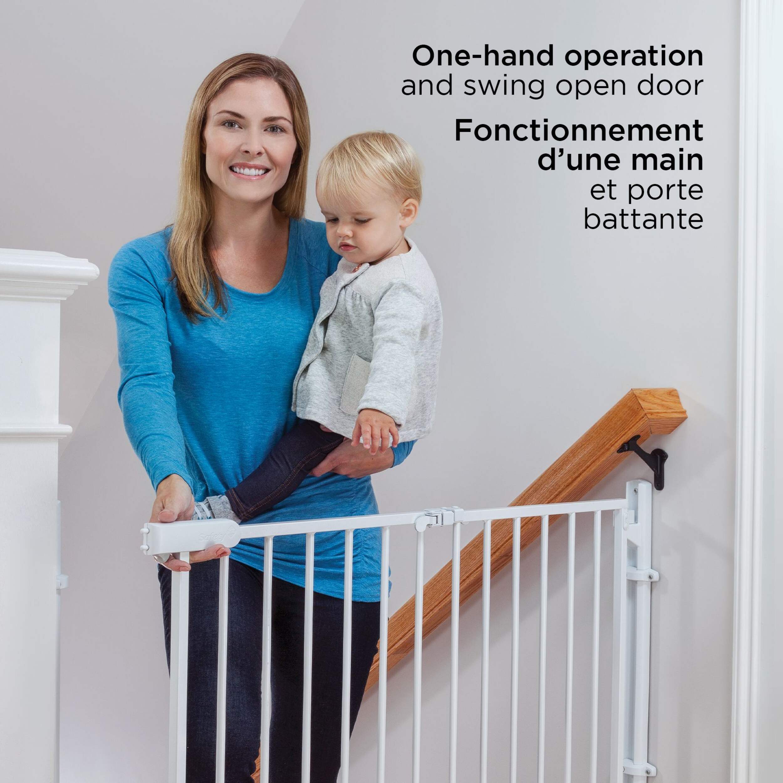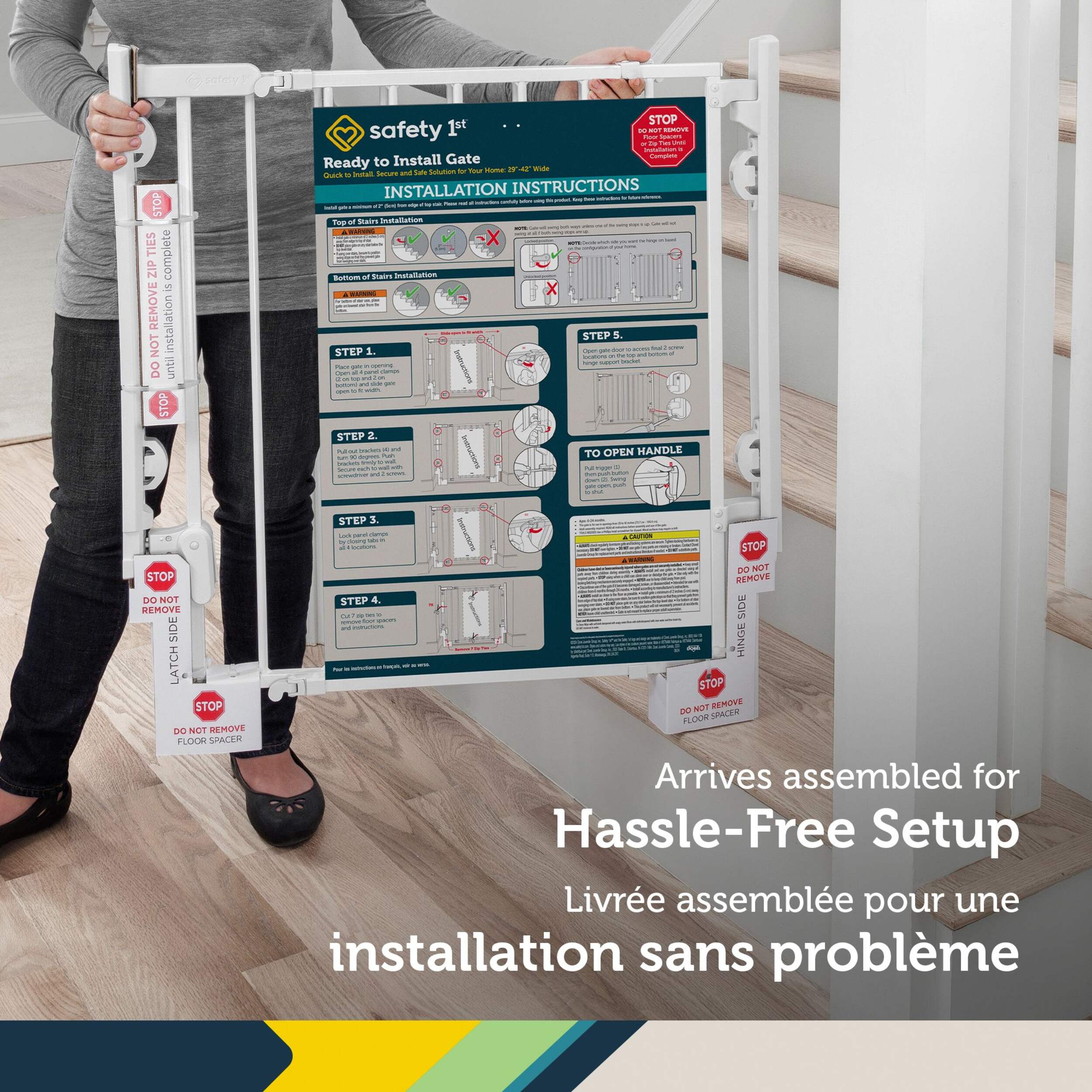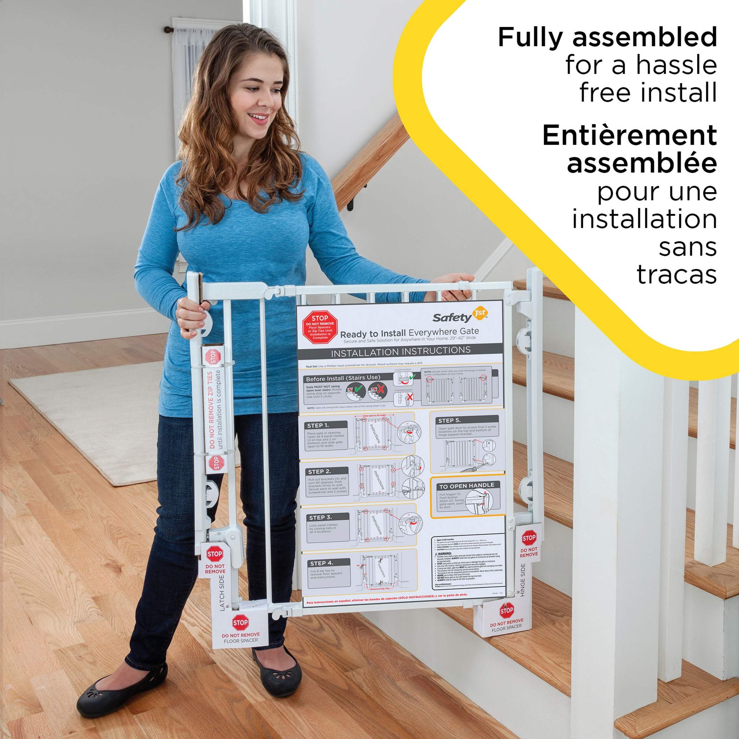 Now that baby is on the move, you can easily keep stairways off limits with the Ready to Install Gate from Safety 1st. This hardware mounted security gate with a no trip design is perfect for any room in the home including the top of stairs, bottom of stairs, and between rooms. There's no measuring, marking or need to level thanks to the innovative packaging. The gate comes out of the box in one piece to ensure your install will be hassle free. While other gates require multiple parts, and extra steps that lead to frustration; this fully assembled gate installs easily in 15 minutes - half the time of a standard gate install. Operating this safety gate is easy too. The no threshold design means no trip hazard at the top of the stairs. One-hand operation and a swing-open door make it easier to pass through, and the gate closes with just a push, letting you get on your way.
