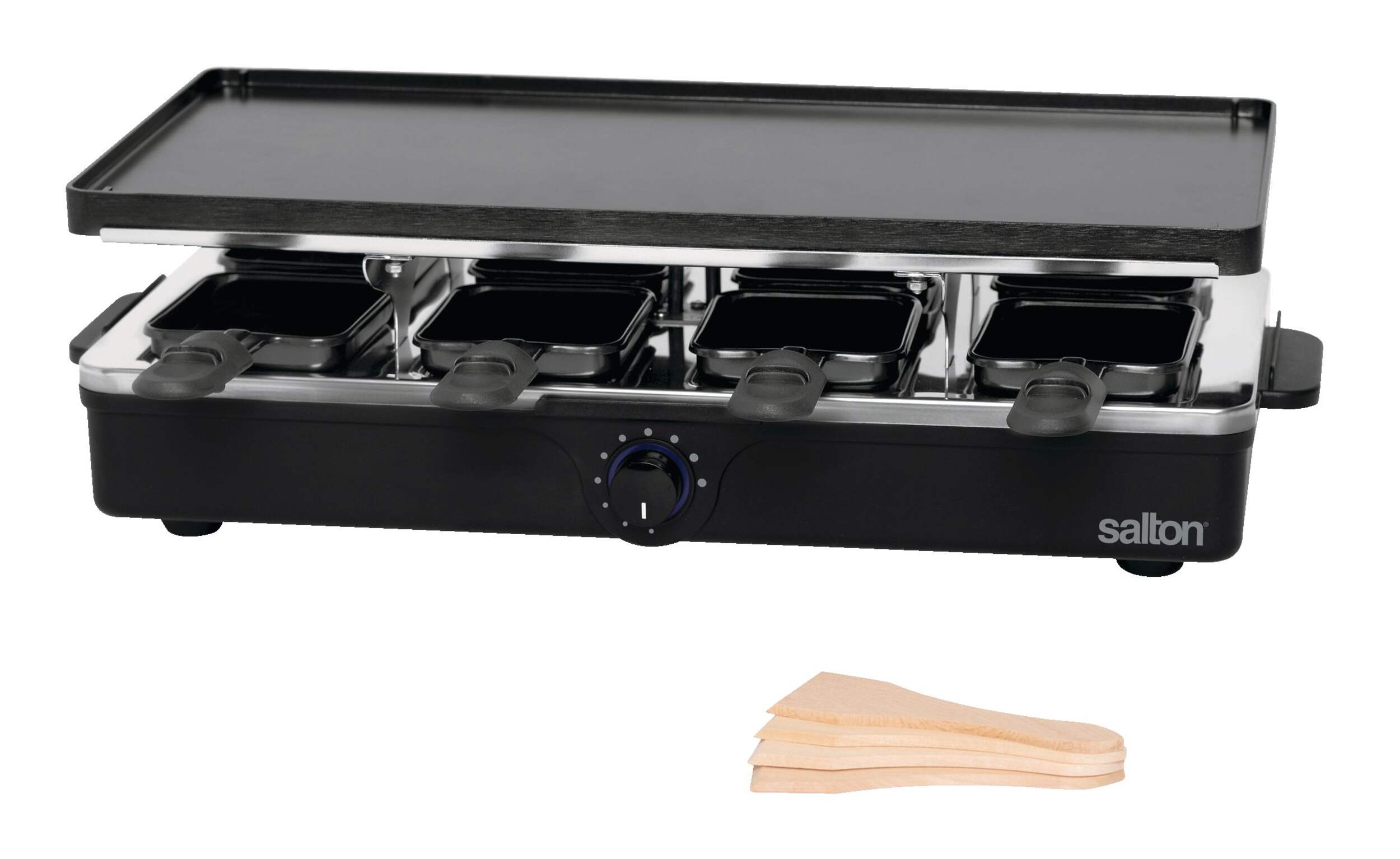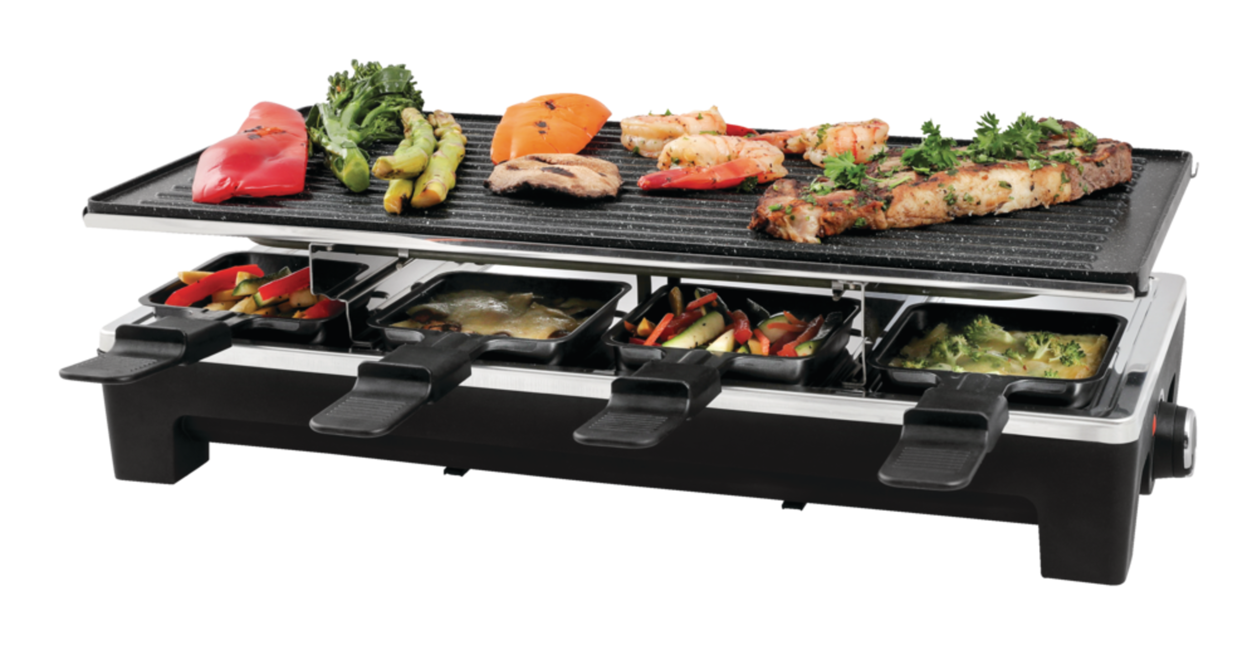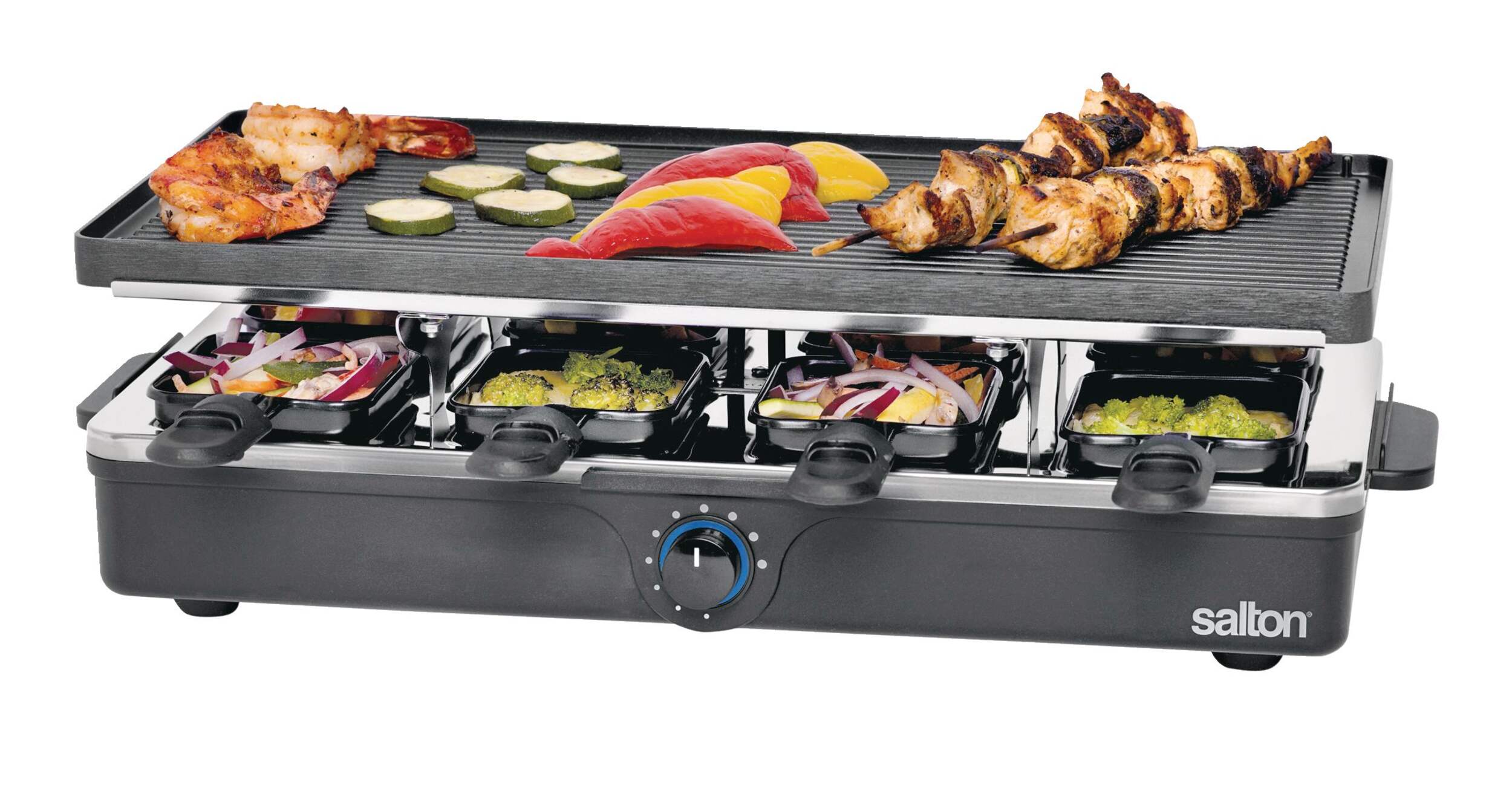 Salton 8-Person Party Grill & Raclette includes 8 non-stick colour-coded raclette pans and 8 spatulas