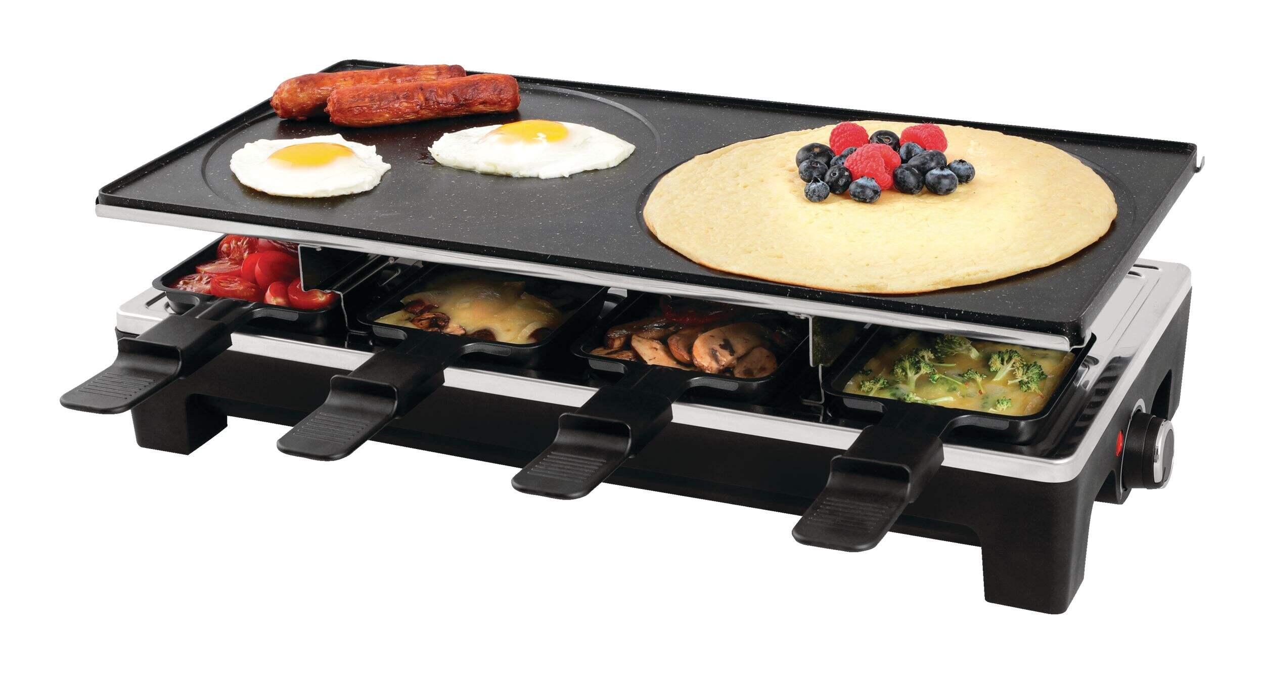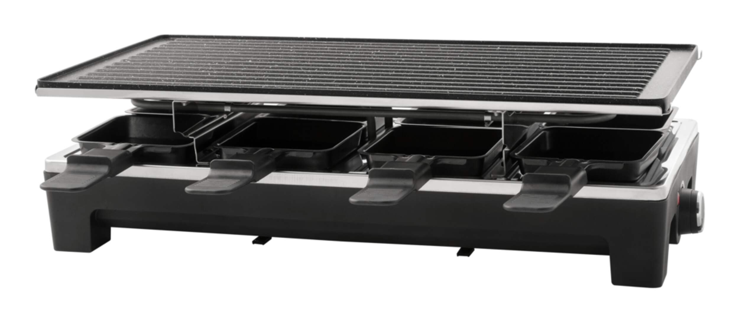 Gather up your friends and family for a mouth-watering raclette get together! Grill fish, chicken, sausage and vegetables on the top grill, while the cheeses melt below in the 8 non-stick, colour-coded pans. Equipped with 8 spatulas to remove the food, this easy-to-use and easy-to-clean raclette will bring people together over delicious food.