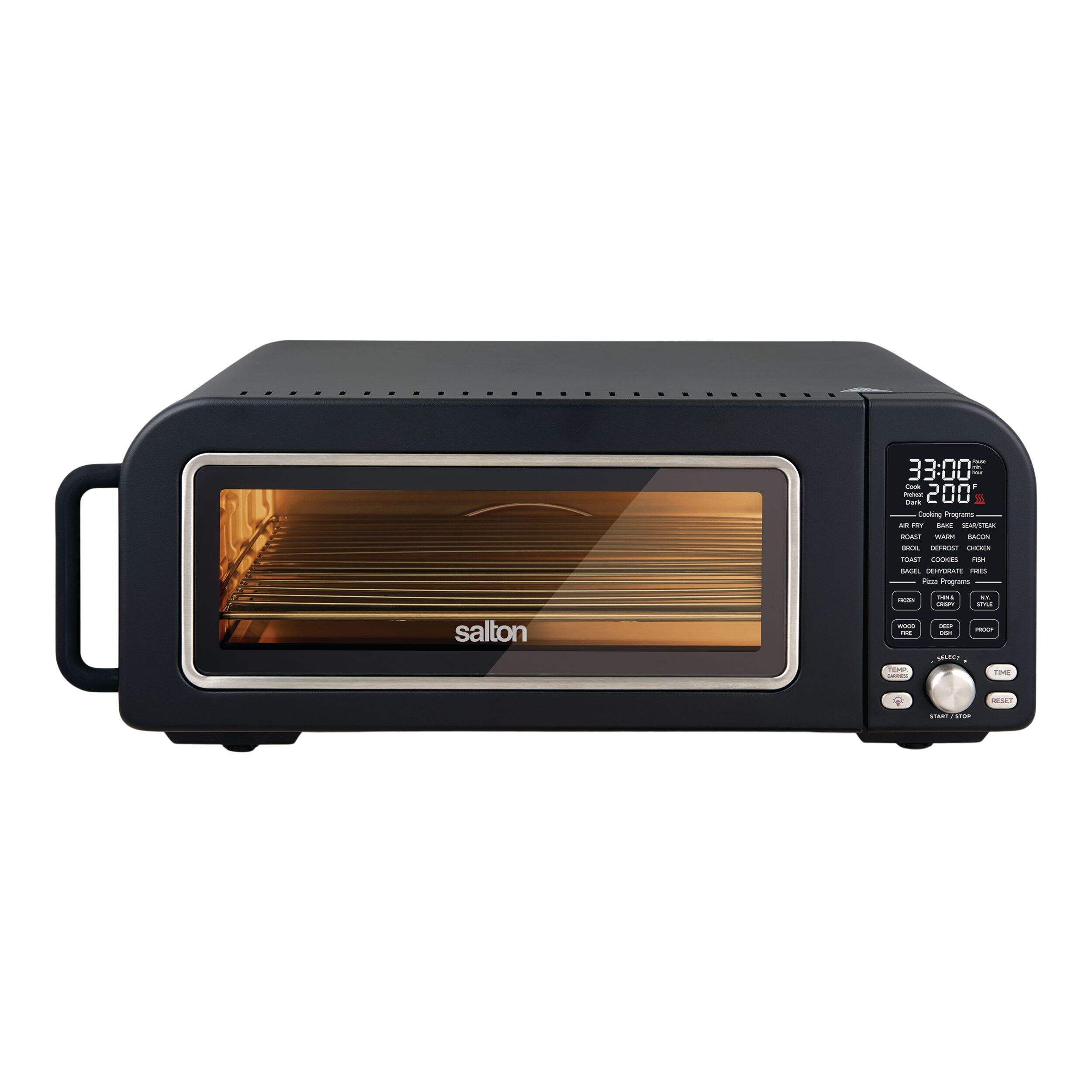 The Salton Pizzadesso Professional Pizza Oven bakes pizzas quickly at high temperatures, offering a crispy result. With 15 cooking functions and six pizza programs, it's versatile for various dishes. You can also make healthier fried foods with little oil and cook steak rapidly.