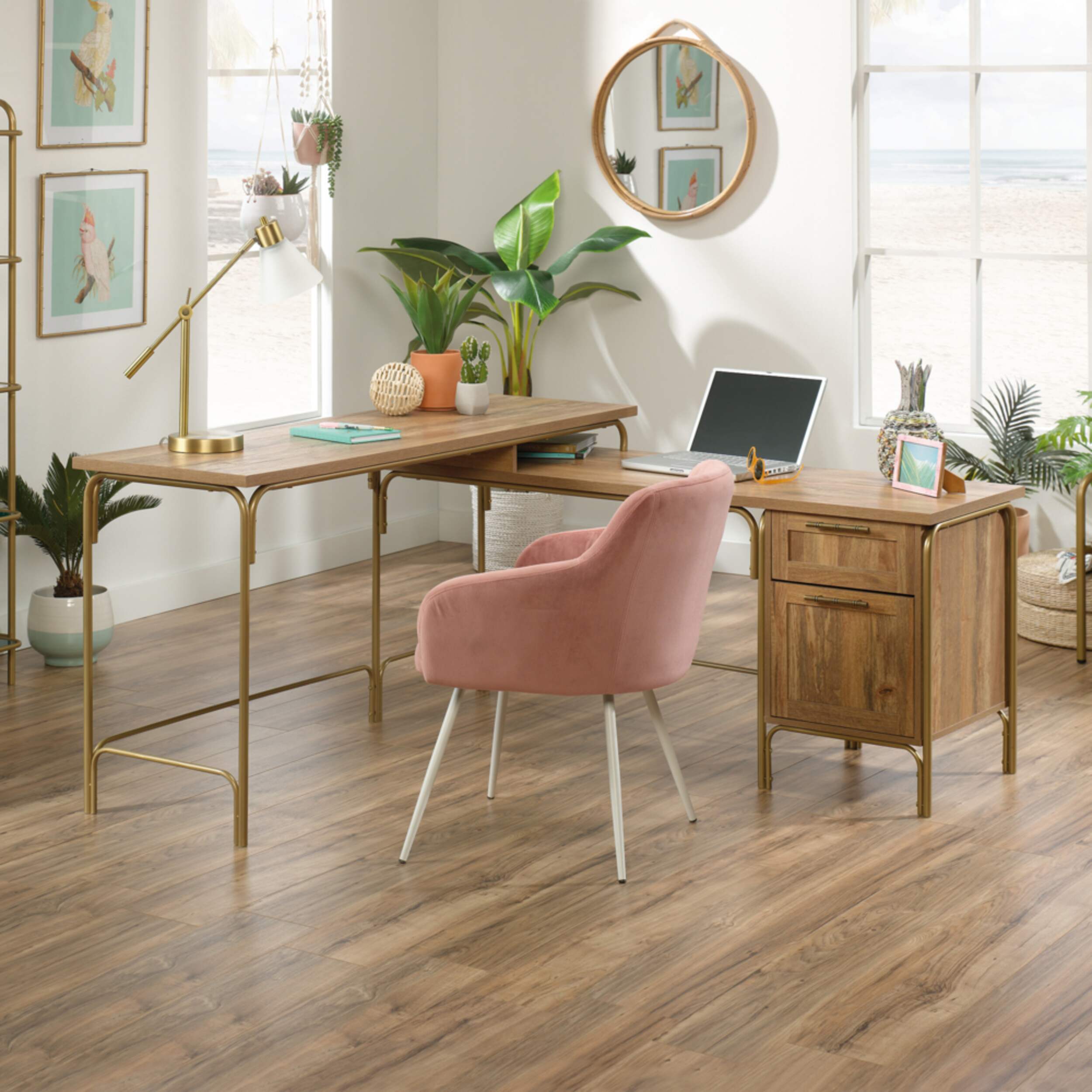 Who says your office space can't be as stylish as the rest of your home? Certainly not us! Create a beautiful look in your home office when you add the coastal-inspired style and design of this L-shaped desk from the Coral Cape® collection. This home office desk offers a spacious top surface that provides you with the room you need for all your office essentials like your laptop, stacks of notepads, folders, and your hot cup of coffee. There's plenty of room for home décor items like an accent lamp and framed photos too. The file drawer with full extension slides can hold letter-size hanging files so you can keep yourself organized. The storage drawer opens and closes on smooth metal runners for easy access storage of items like stamps and envelopes. This L-shaped computer desk is finished on all sides for versatile placement throughout your home. It's powder coated metal frame with satin gold finish is sure to make it stand out. Finished in Sindoori Mango®, this L-shaped is just what your office space is missing.