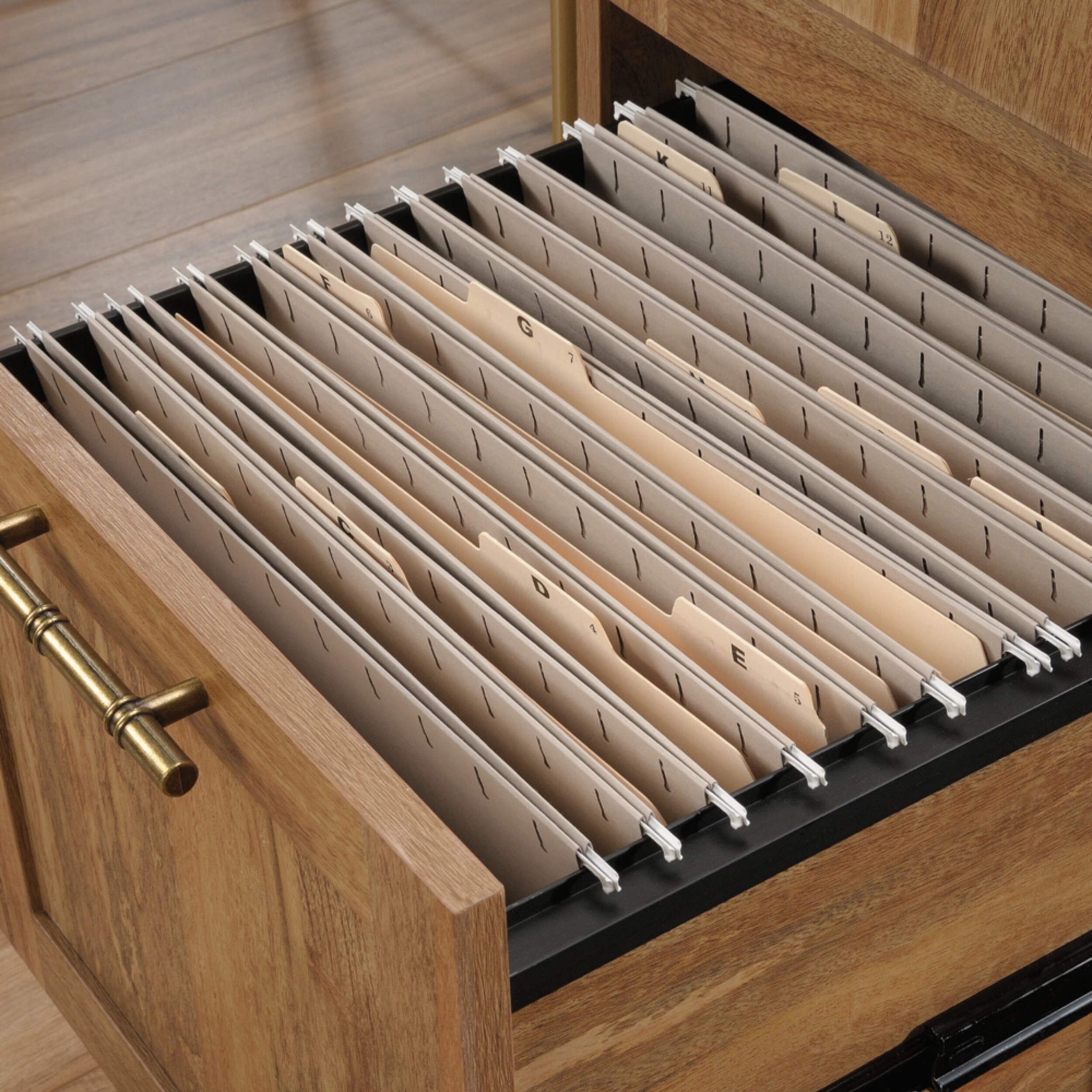 Lower drawer with full extension slides holds letter-size hanging files