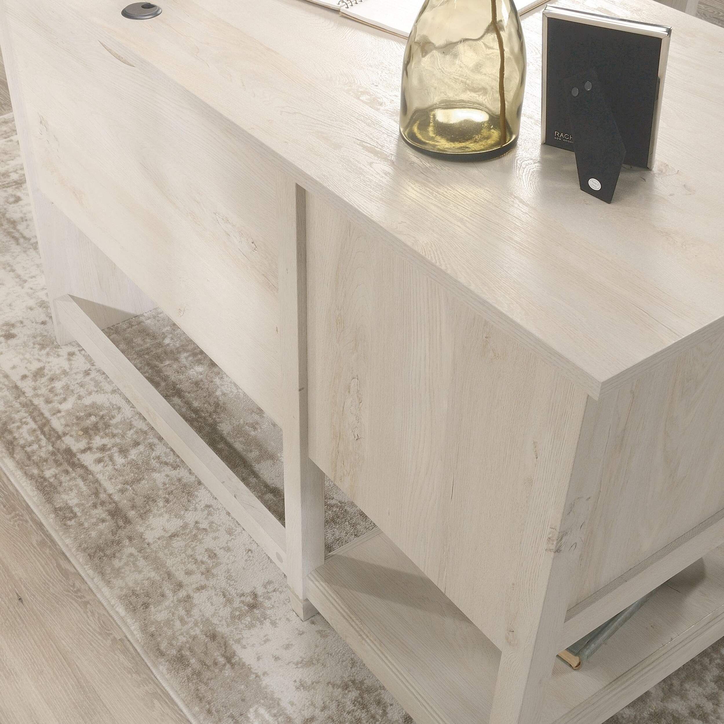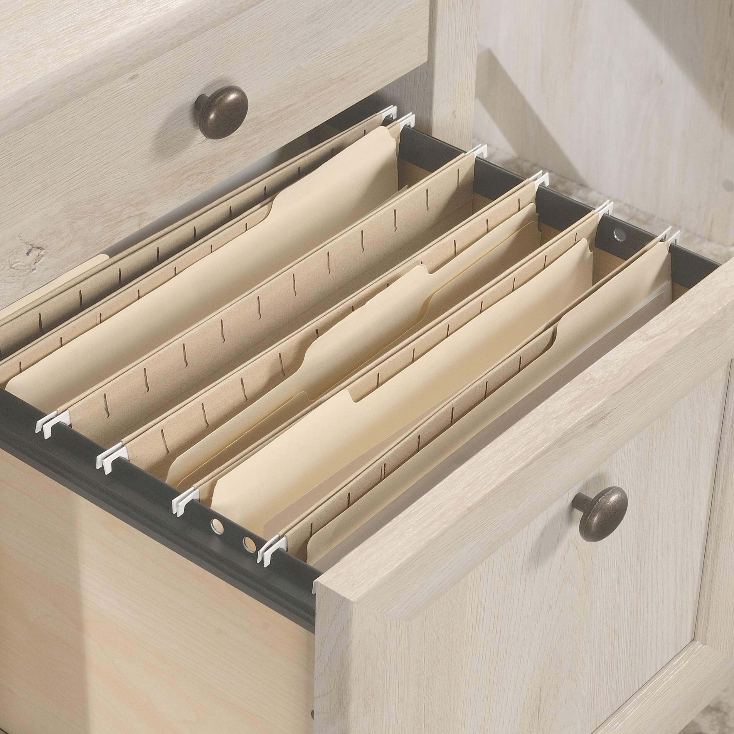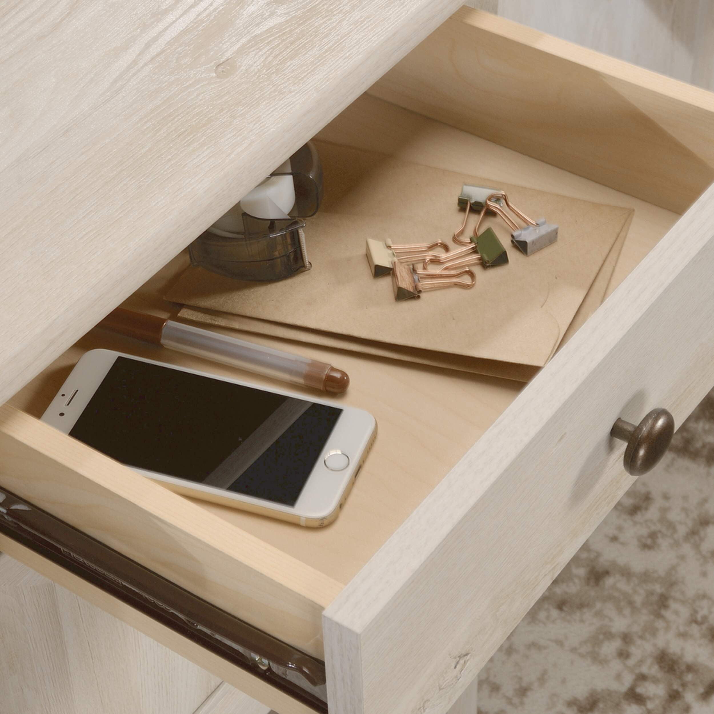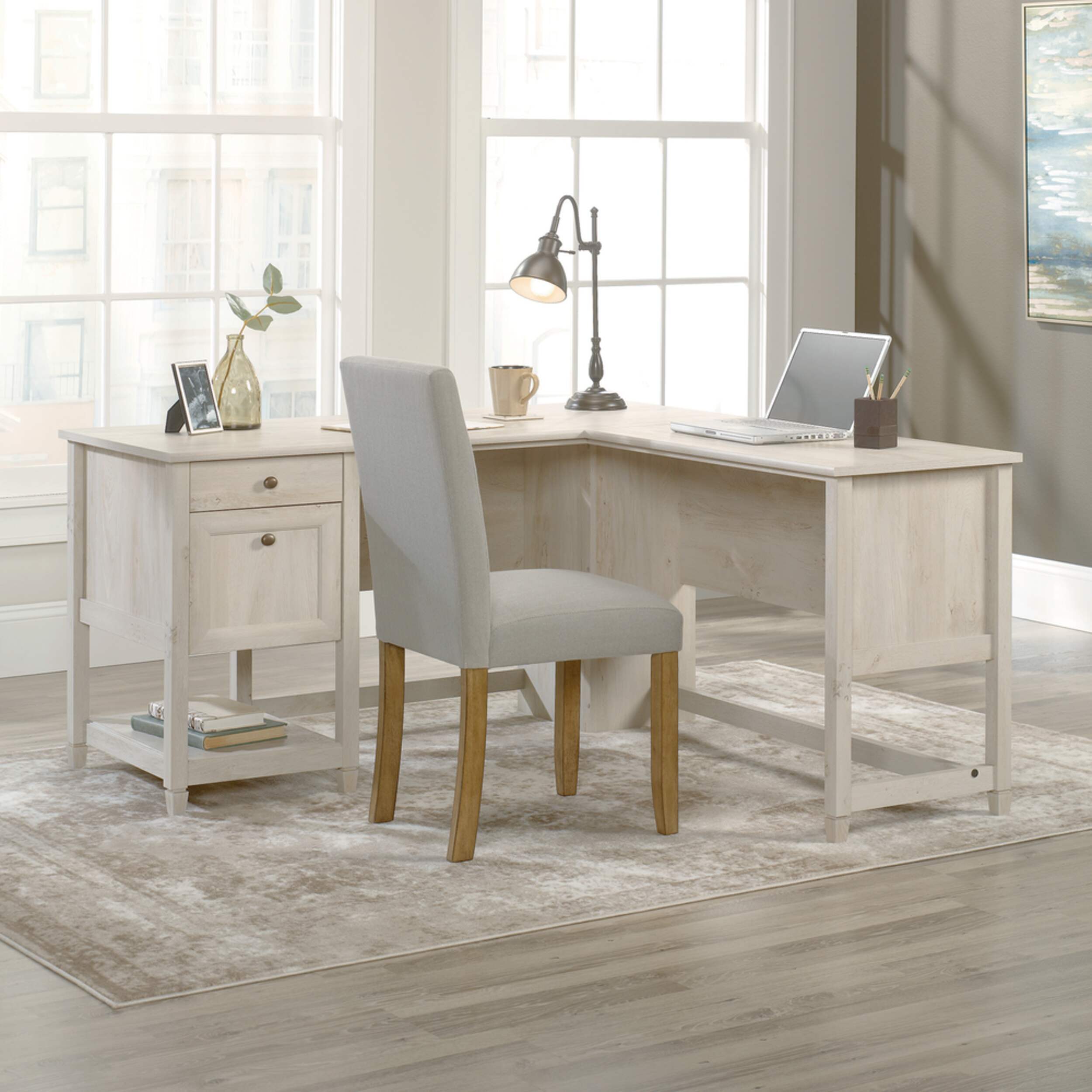 Sauder Edge Water Home Office L-Desk with Storage features a file drawer with full extension slides that holds letter or European size hanging files to help keep you organized