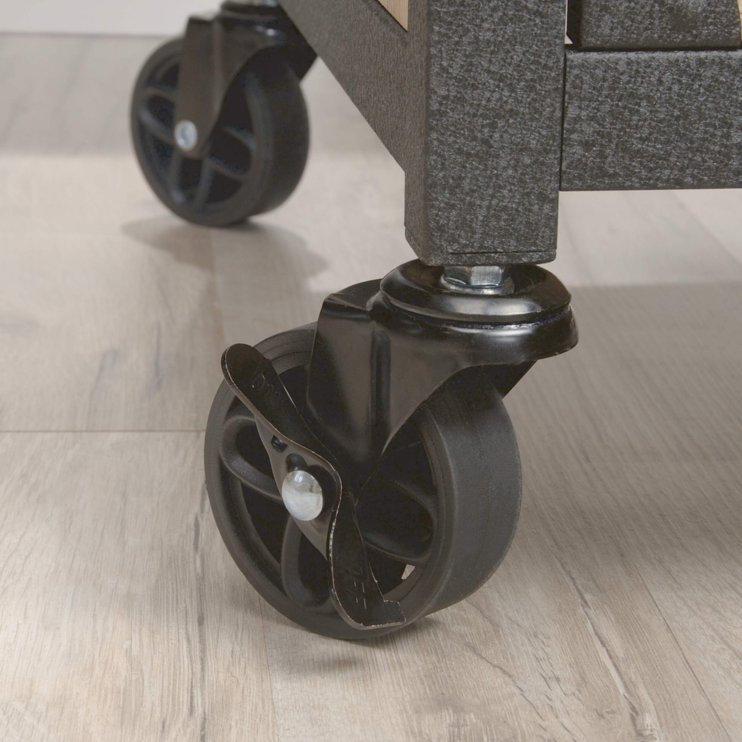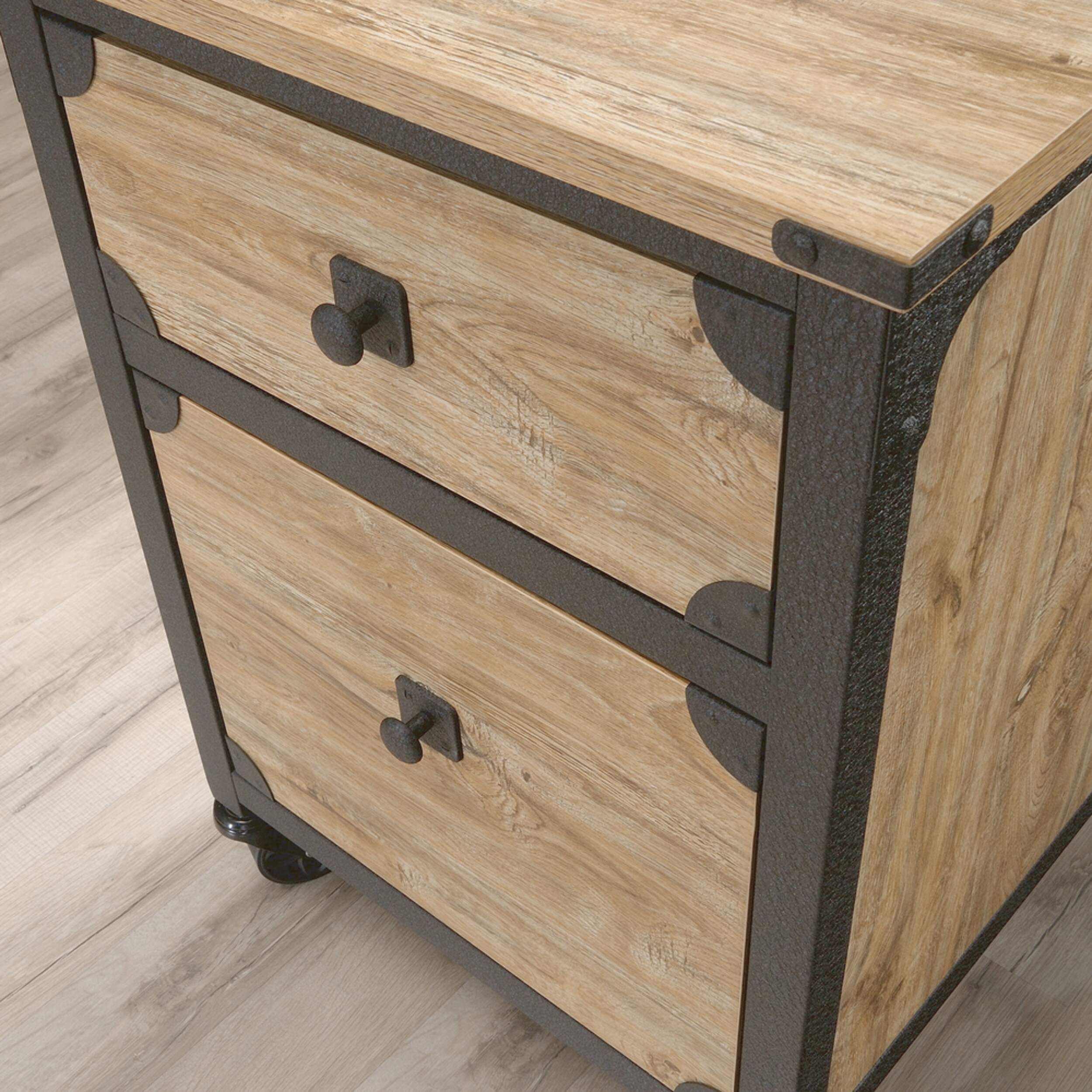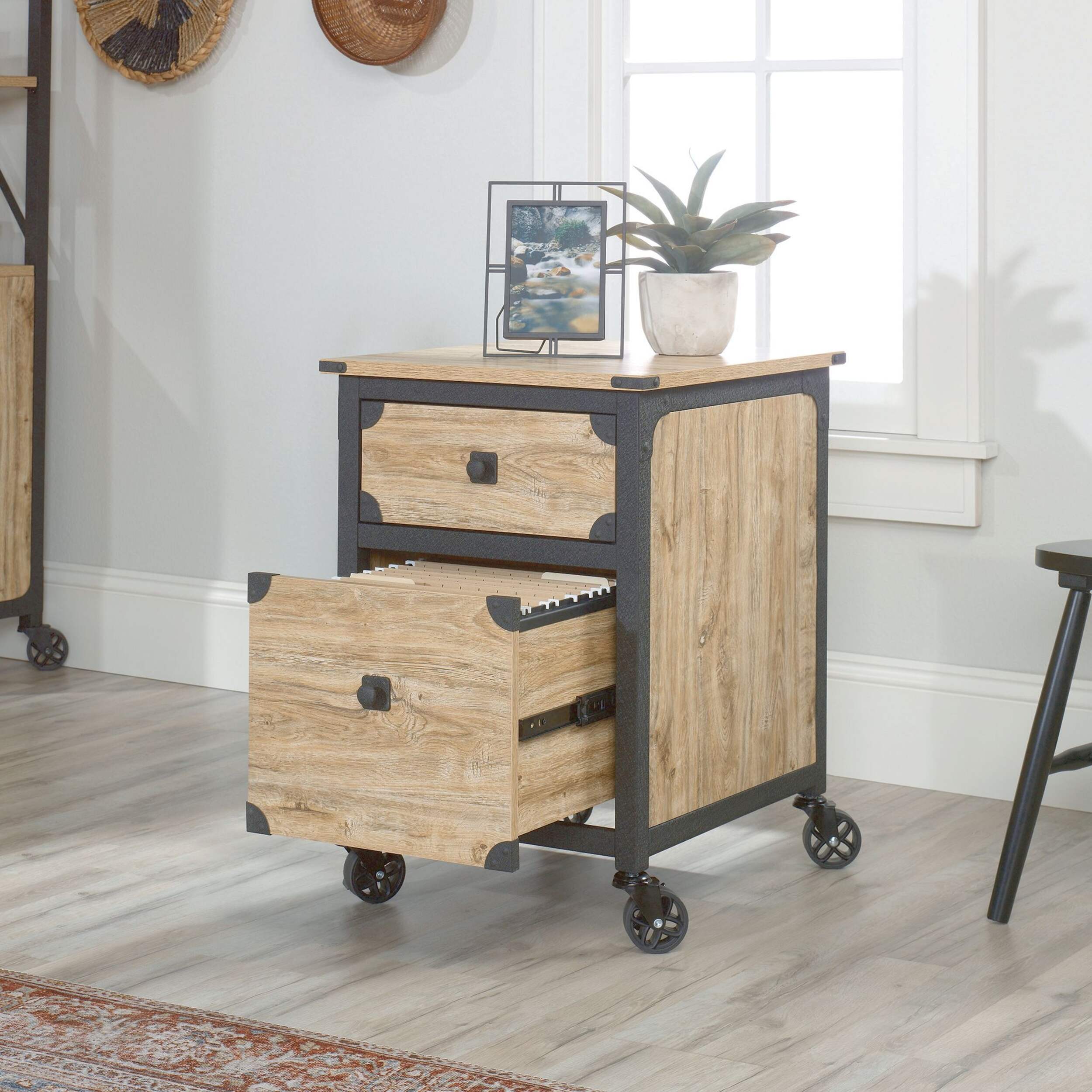A lack of storage space can bring your office—and productivity— down. Add a versatile storage solution for important papers and office supplies with this pedestal file cabinet from the Steel River® collection. The file pedestal's roomy top drawer opens and closes on smooth metal runners for easy-access storage of miscellaneous office items like notepads, pens, and folders. The lower drawer with full extension slides can hold letter-size hanging files to keep all your papers safely organized. This file cabinet with casters can easily be moved anywhere. The spacious top surface provides additional space to store and display items like framed photos and decorative plants. For an extra touch of detail, this file cabinet pedestal features a textured, powder-coated metal frame and corner accents. Finished on all sides in Milled Mesquite™, this metal and wood file cabinet will keep your office feeling organized and clutter-free.
