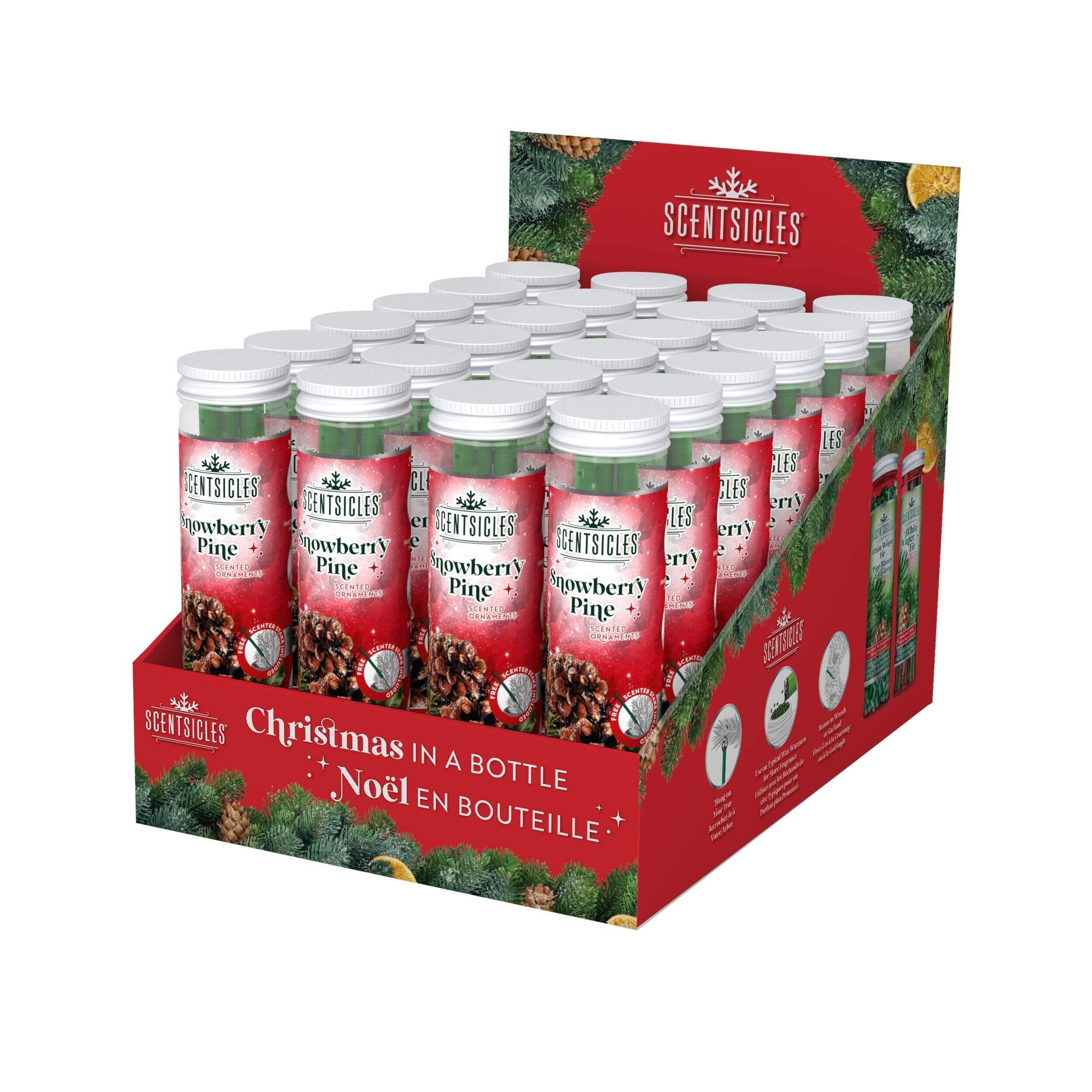 Each bottle contains 6 five-inch scented ornaments and swirl hooks