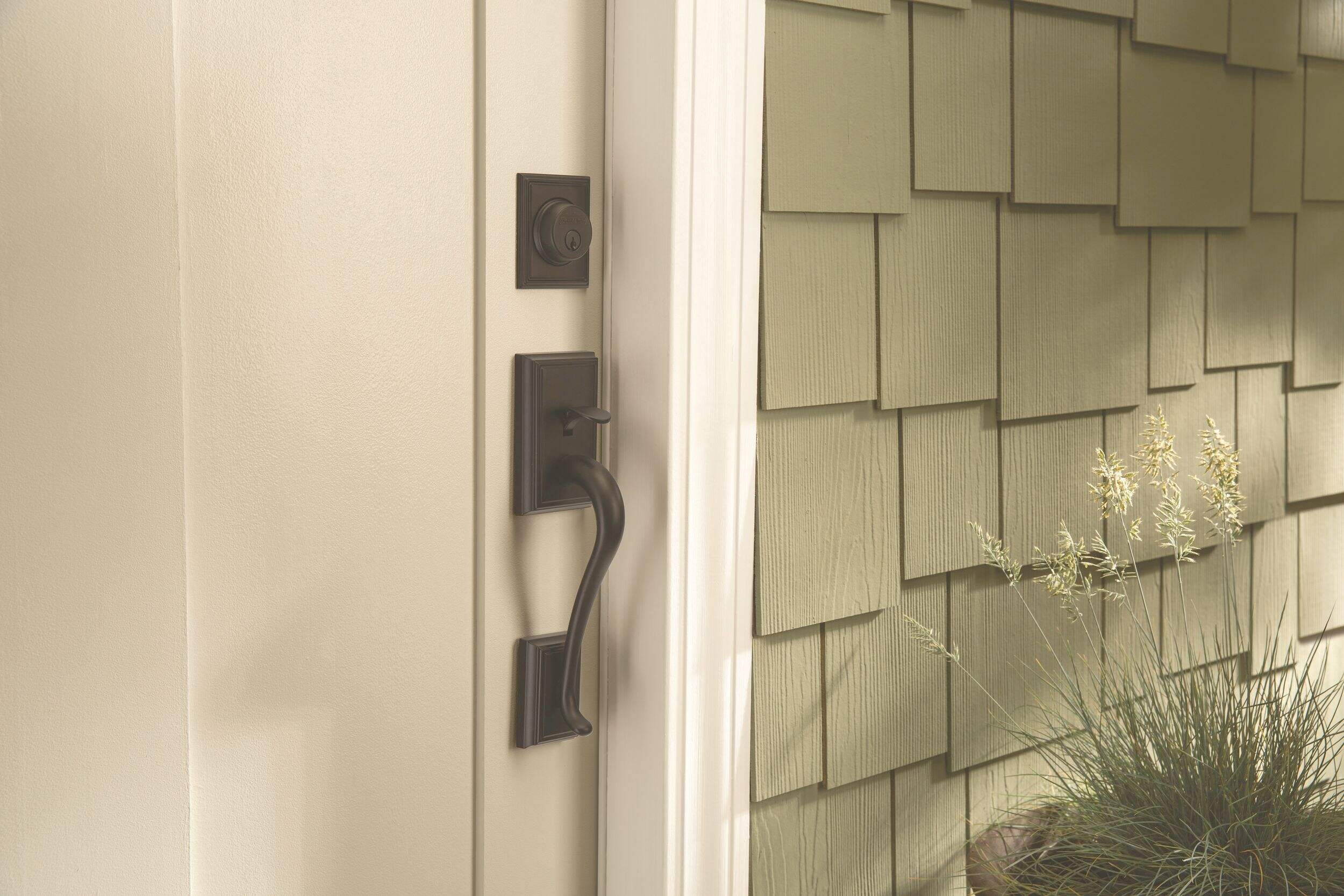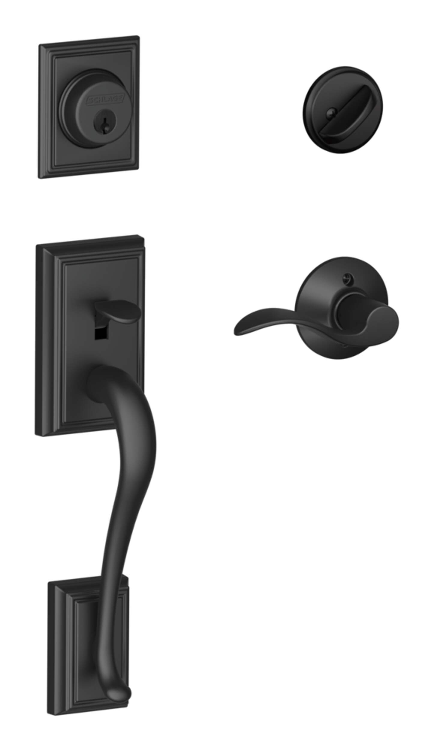 Make a stylish statement with the Schlage Addison Grip Handle Set & Deadbolt Door Lock Set with Accent Lever, Matte Black. The wavy accent levers add an eye-catching touch of flair to your doorway while the matte black finish blends in seamlessly with any decor. Adjust the patented throughbolts to fit your existing holes so you don't have to drill new ones, and secure your home with the 1-inch anti-kick latch and strike plate reinforcer. The 1-in latch/bolt-on deadbolt and strike/door frame reinforcer with 3-in screws offer maximum kick-in resistance. Latch features a universal design to fit either 2-3/8-in or 2-3/4-in backsets. Engineered for both right and left-handed doors, this handle set combines security you can trust with a look that elevates your space.