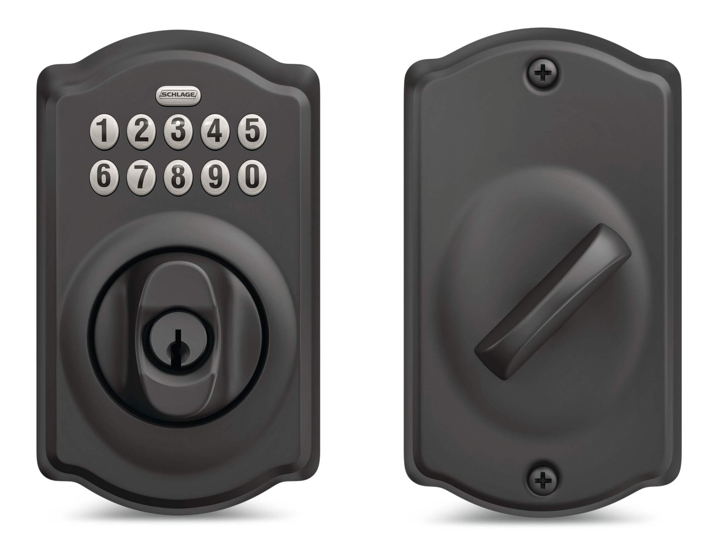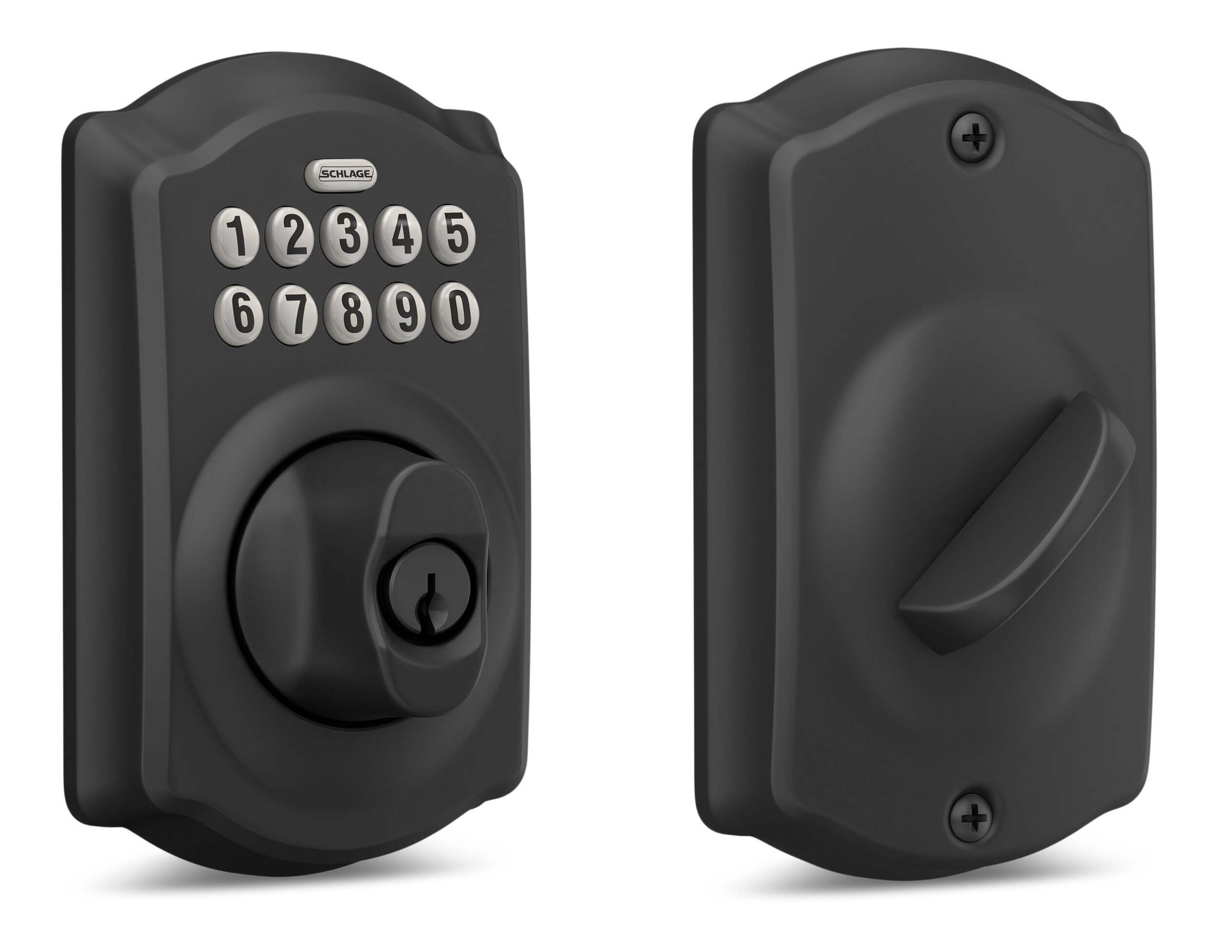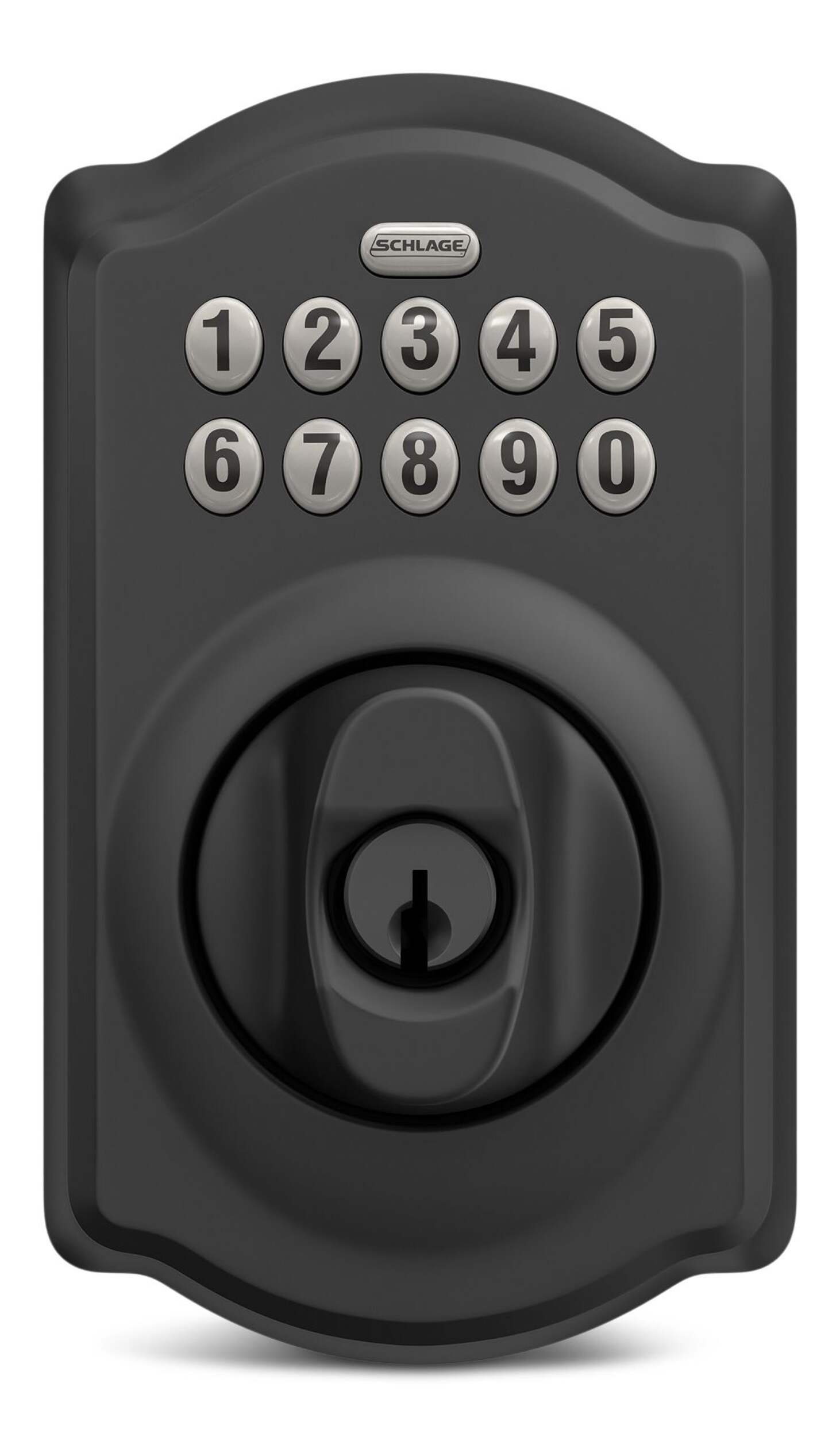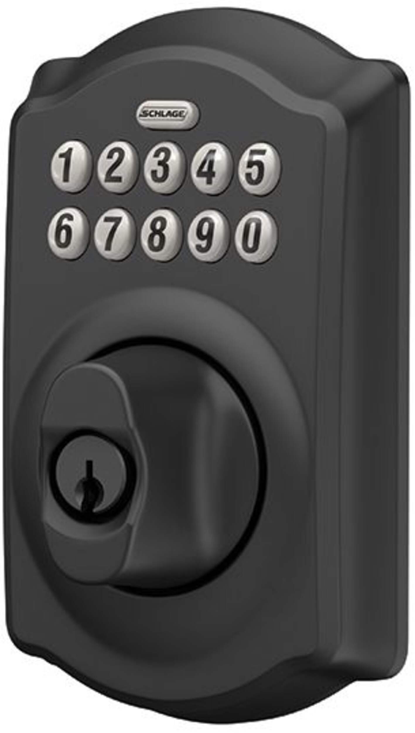 The Schlage Camelot Electronic Keypad Deadbolt Door Lock in Matte Black combines effortless keyless entry with robust home security. Designed with a classic scalloped trim, it complements any door style with a timeless look. Simply enter a code for convenient access without needing a key, making it ideal for high-traffic areas in the home. Built for durability, it fits seamlessly onto standard doors, ensuring secure and reliable entry.