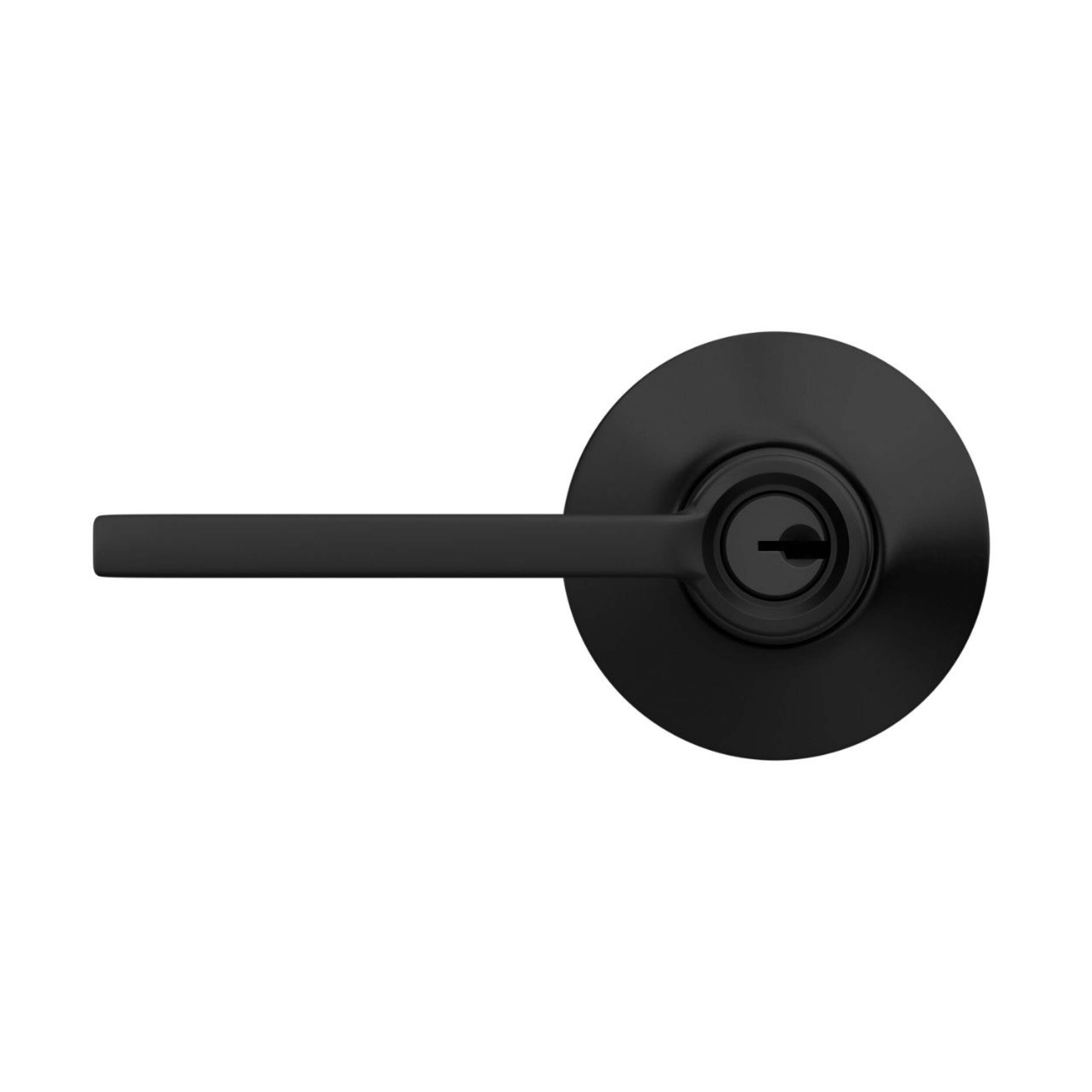 The Schlage keyed entry knob helps access any interior door with ease. The versatile matte black lever design works for doors swinging left or right and installs on standard predrilled door openings between 1.3 and 1.7 inches. The simple, clean lines complement contemporary and modern interiors while the neutral finish coordinates with popular gray tones. Best of all, the knob remains unlocked for hassle-free entering any room in your home.