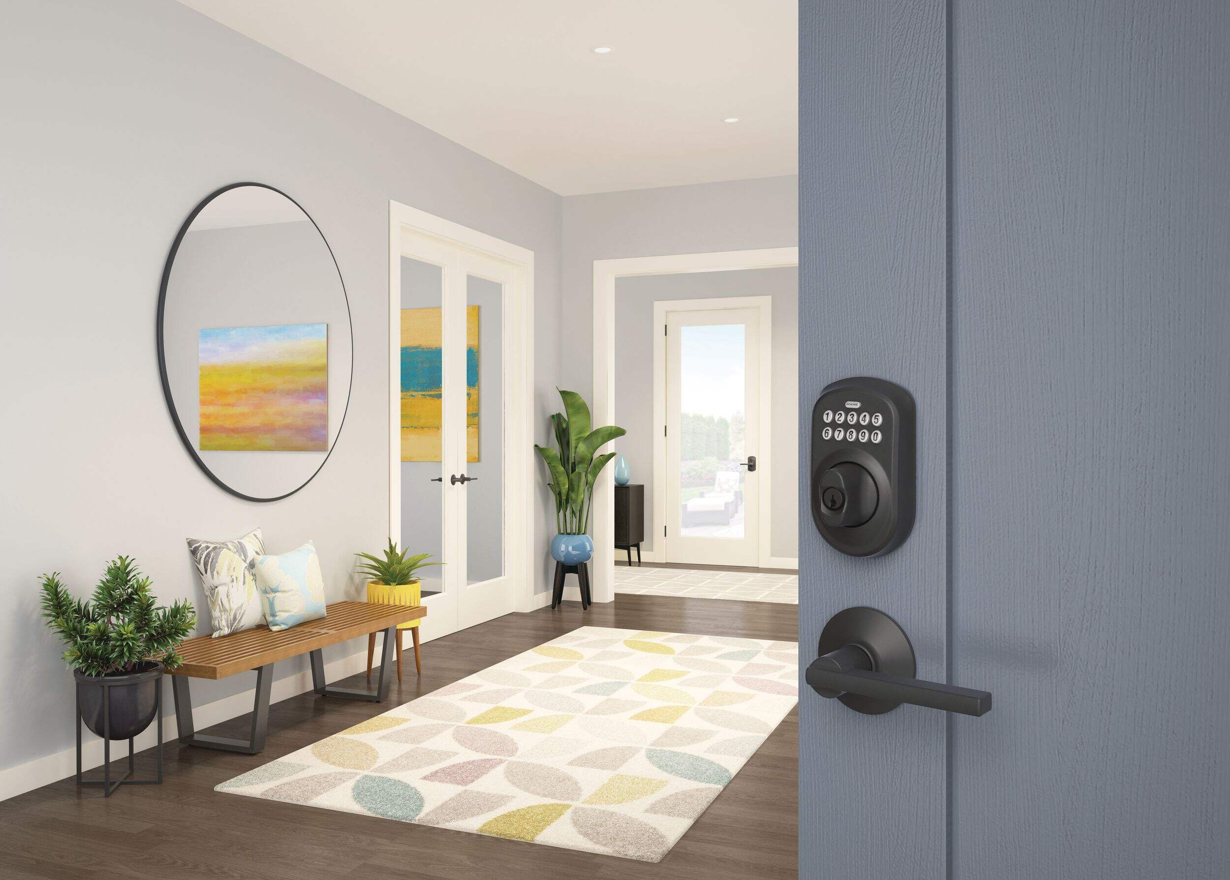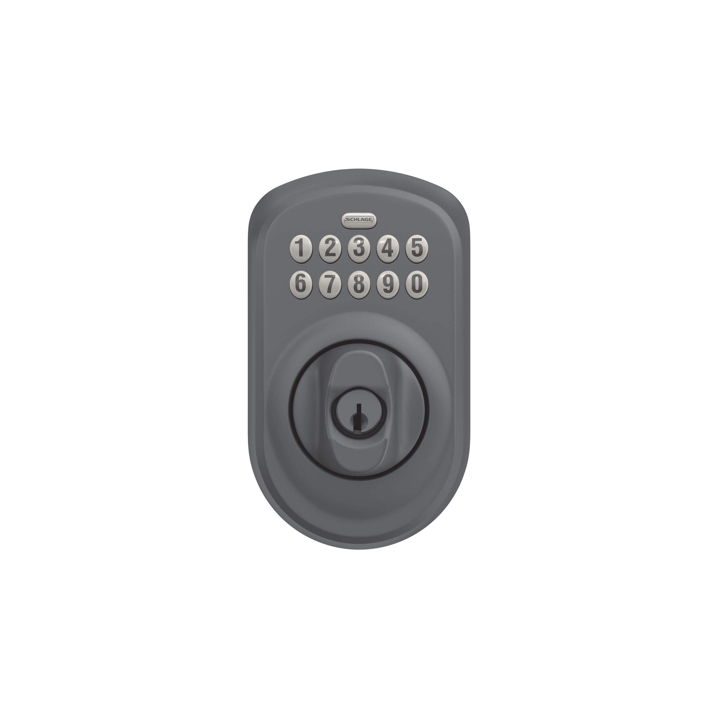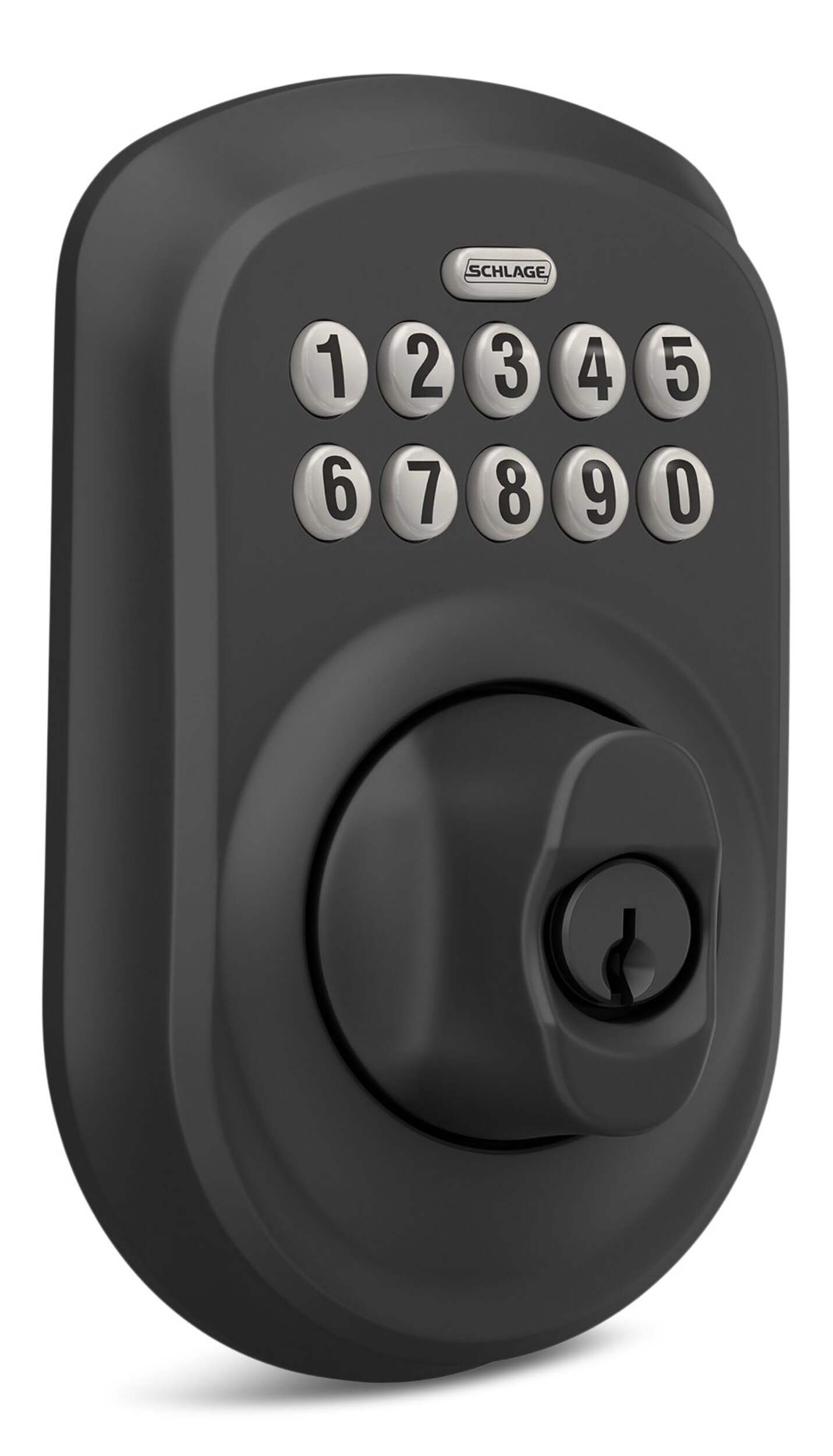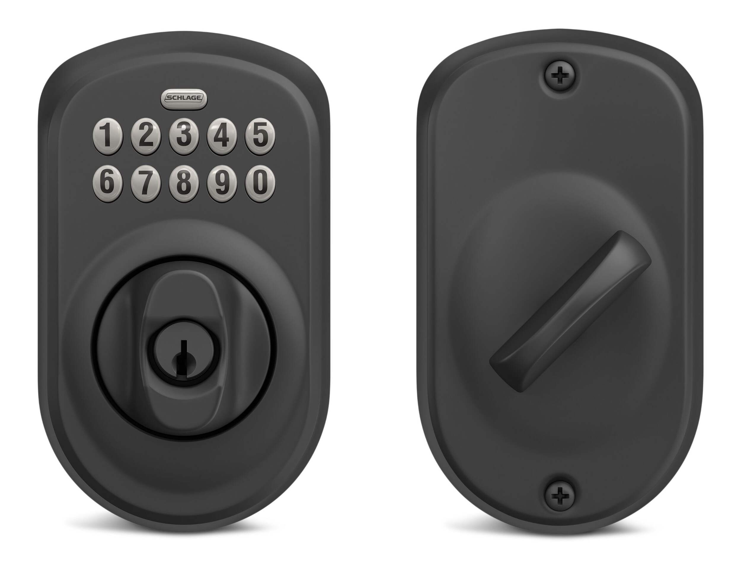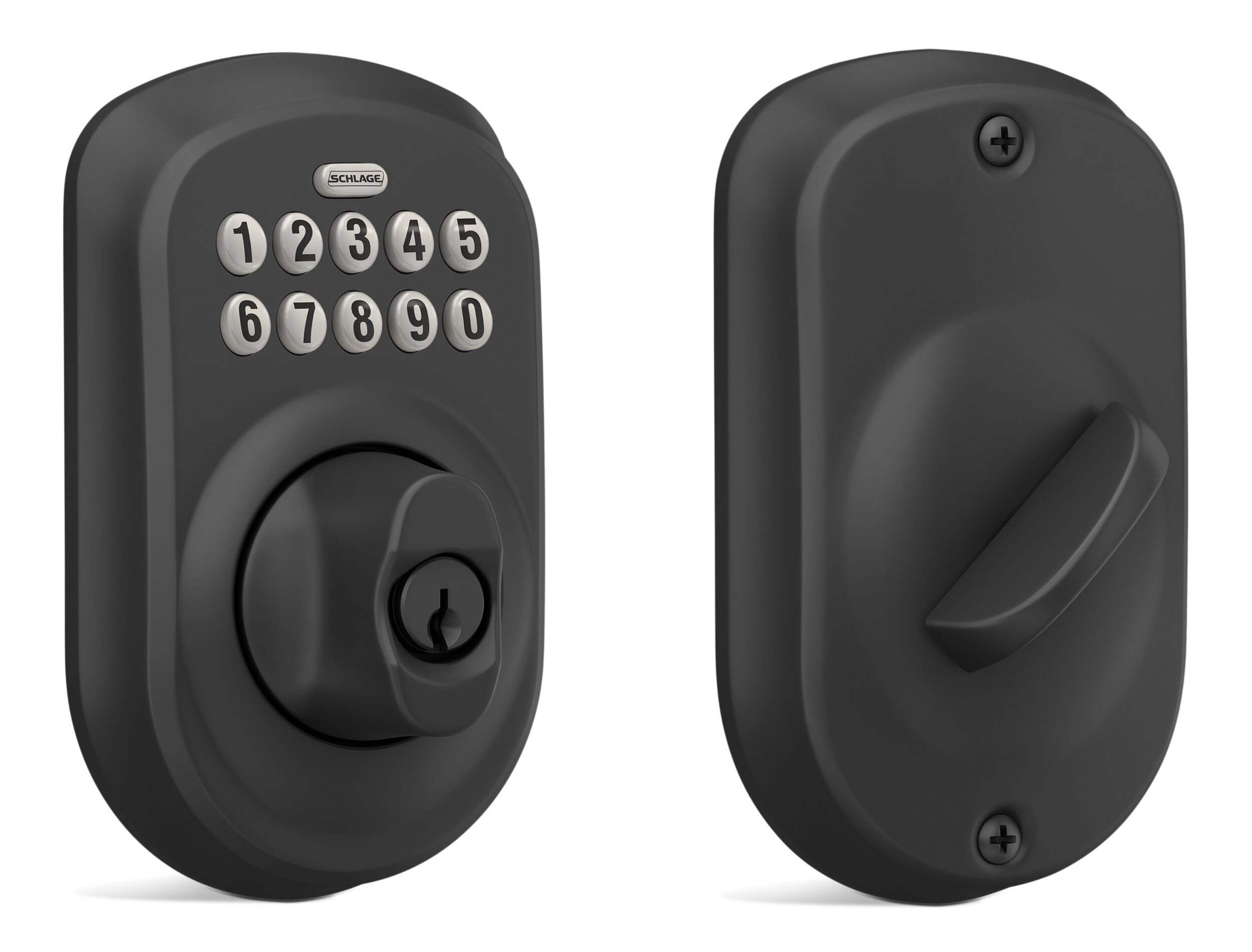 The Schlage Plymouth Lighted Keypad Deadbolt offers convenient and secure entry control to your home. Rather than hiding keys or keeping track of copies, simply use access codes that can be created or deleted in seconds. The matte black finish and oval-shaped plymouth trim lend a straightforward yet modern aesthetic. Designed and tested for strength and durability, this deadbolt fits existing, standard pre-drilled doors with 2-3/8-in or 2-3/4-in backset and 1-3/8-in to 1-3/4-in door thickness.
