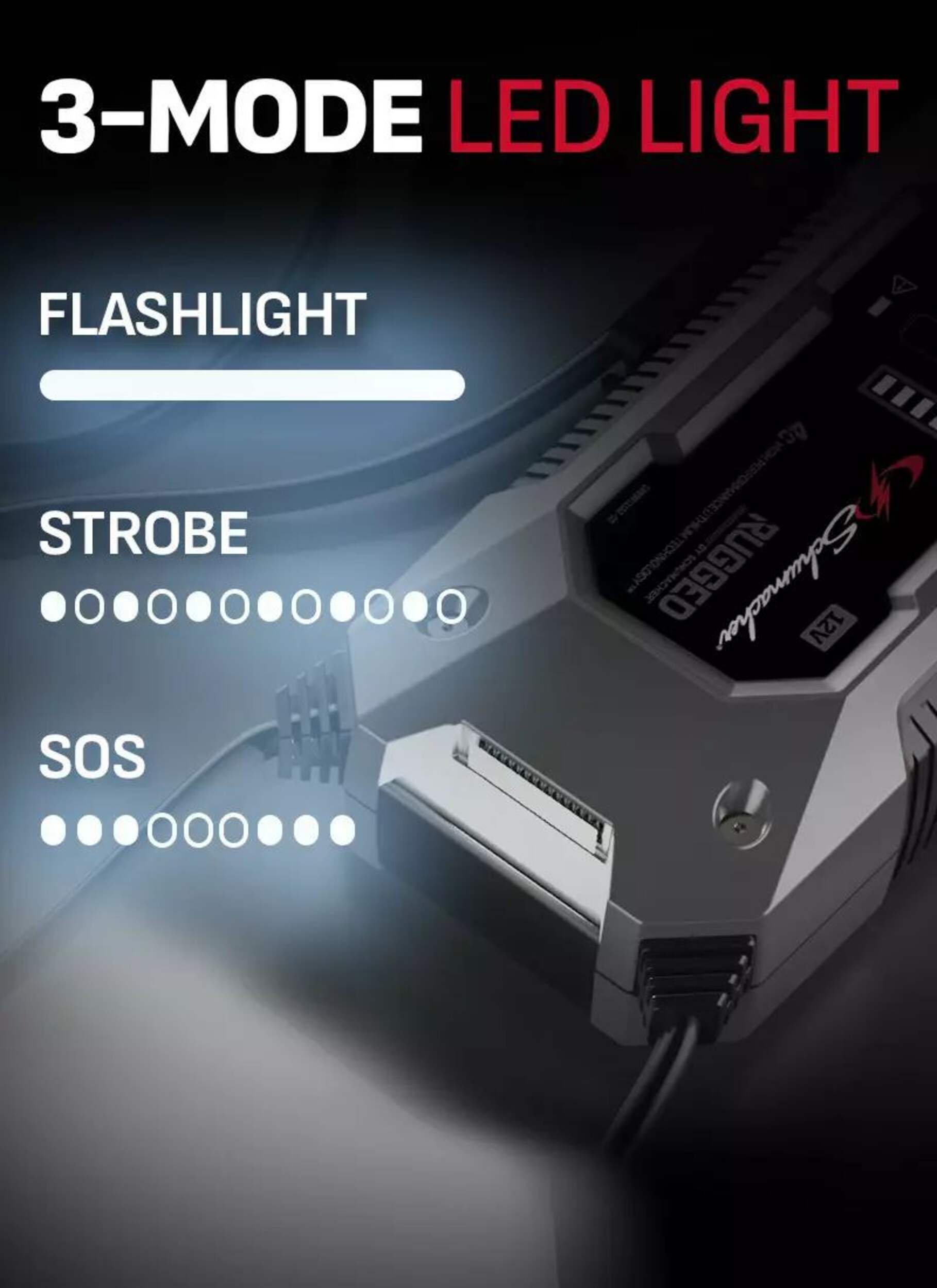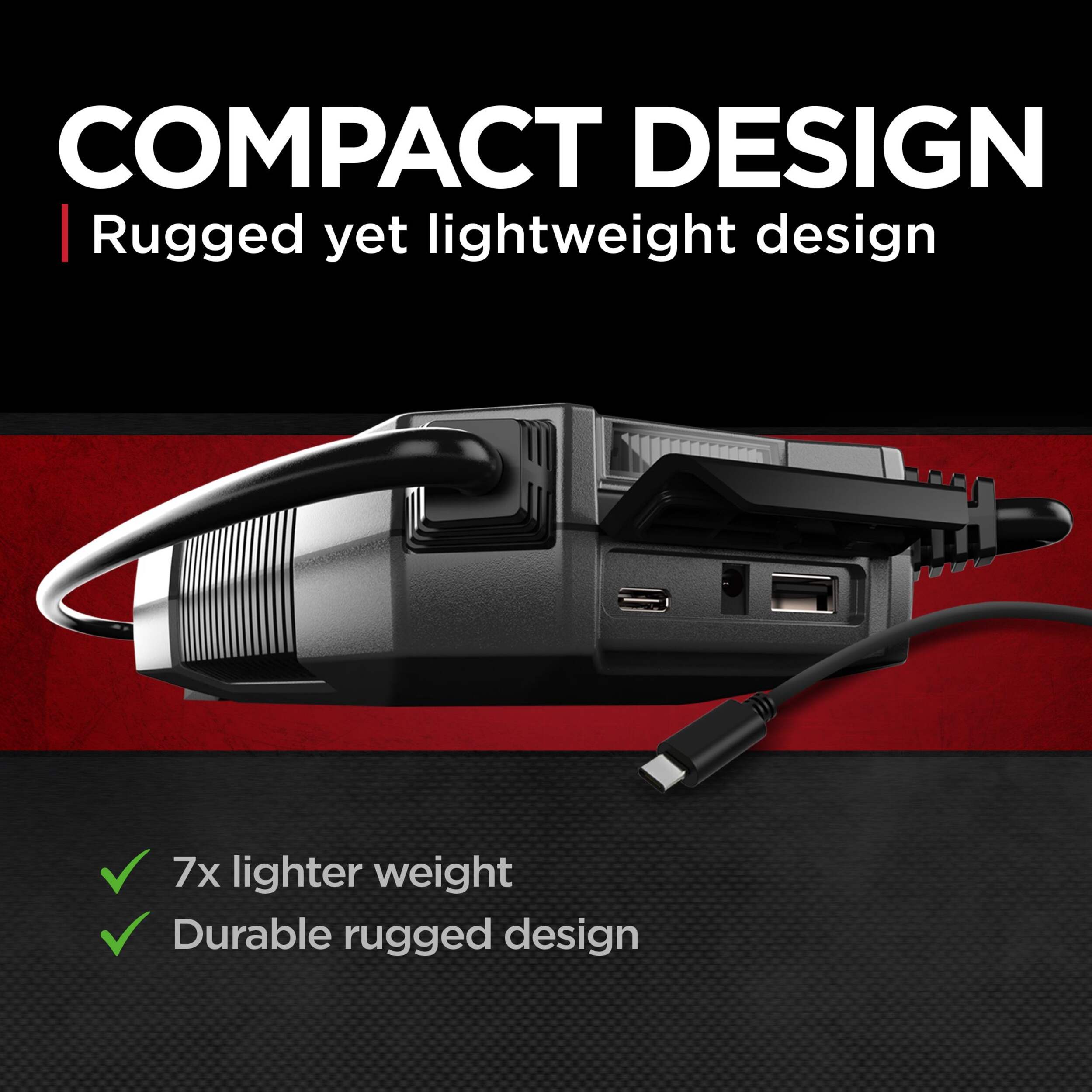 Users can jump start a vehicle, charge their devices, and illuminate their work area with this reliable and long lasting lithium-powered device