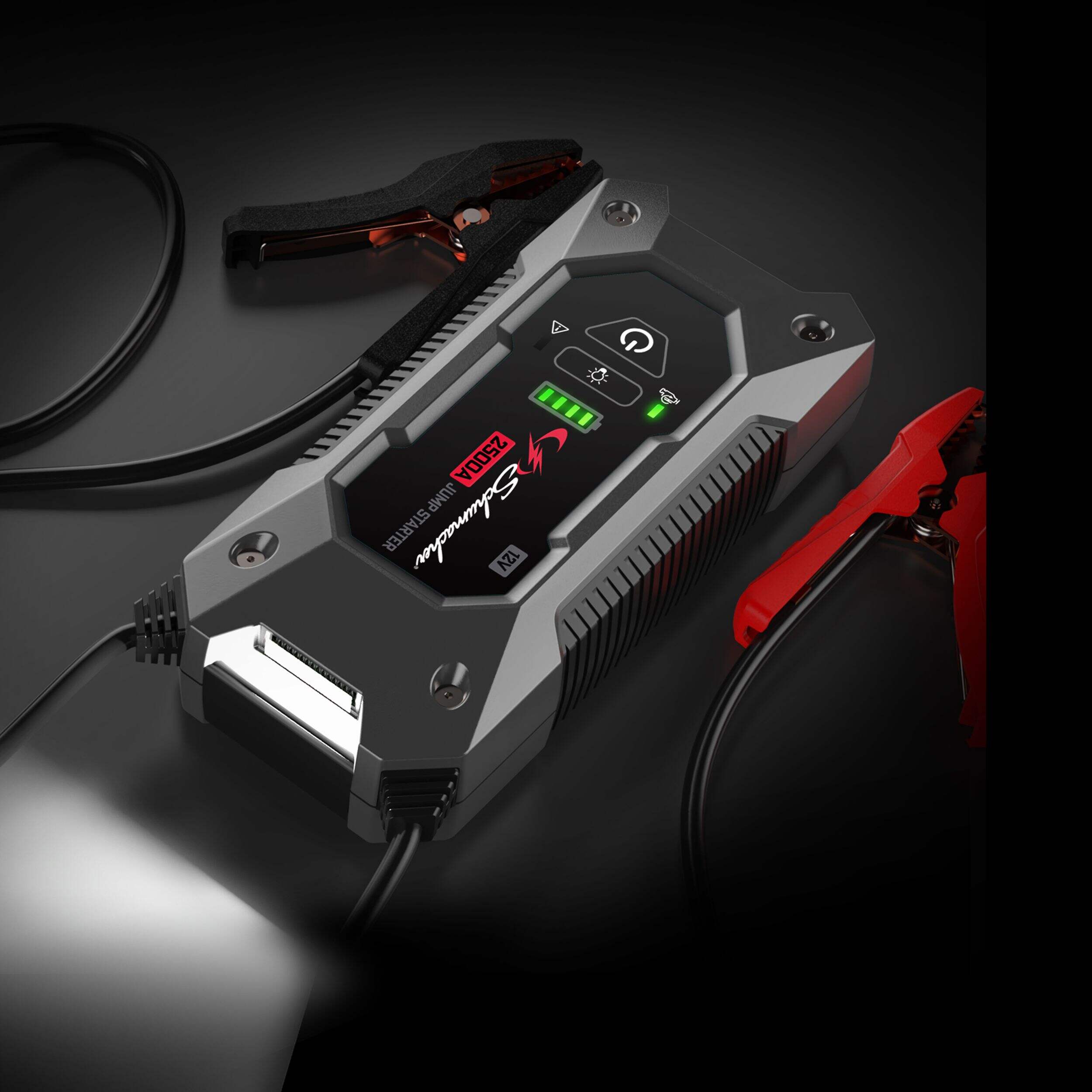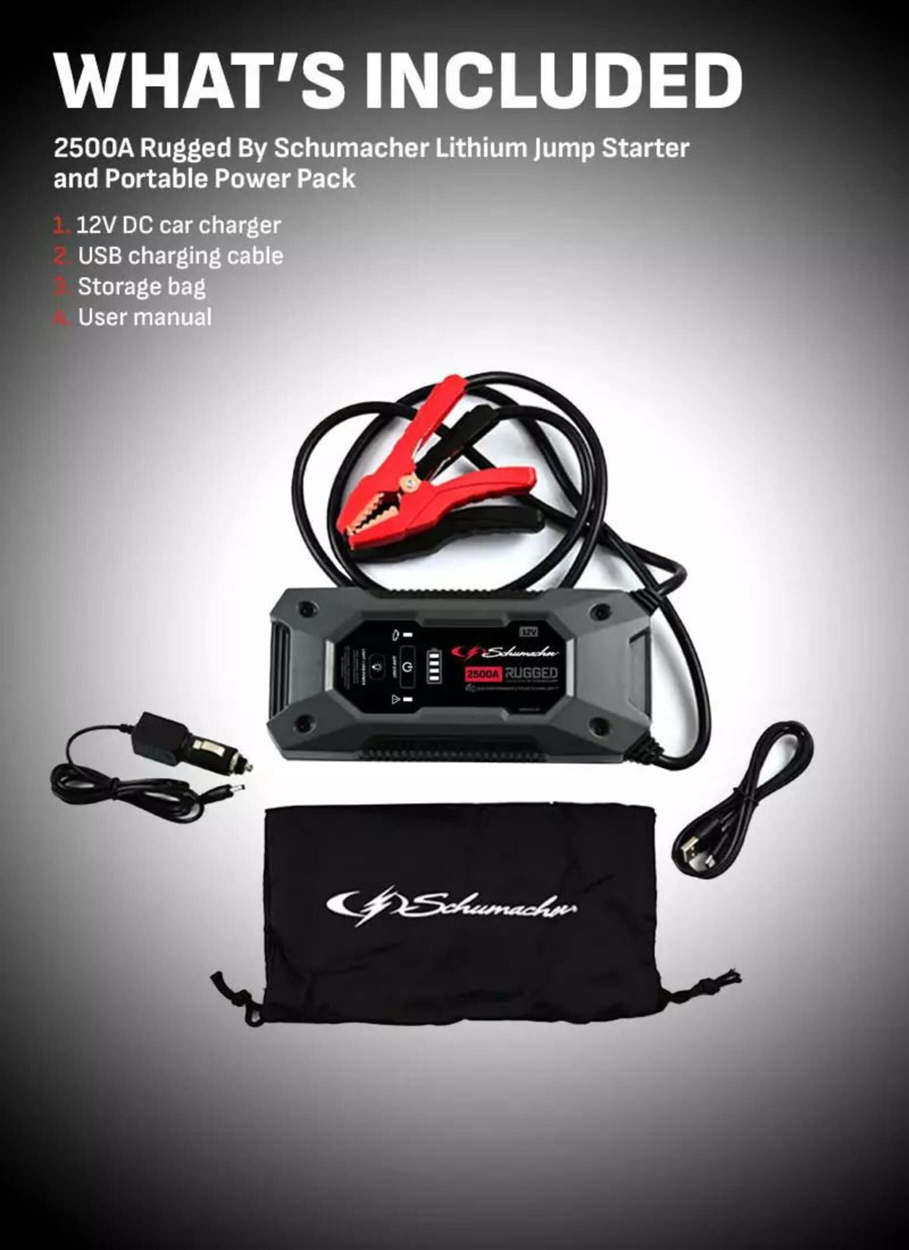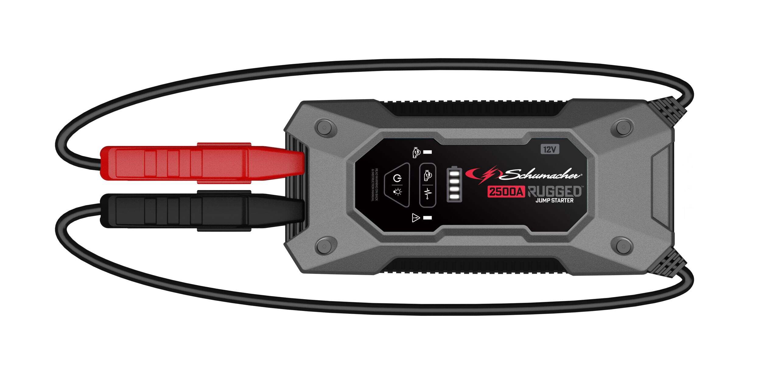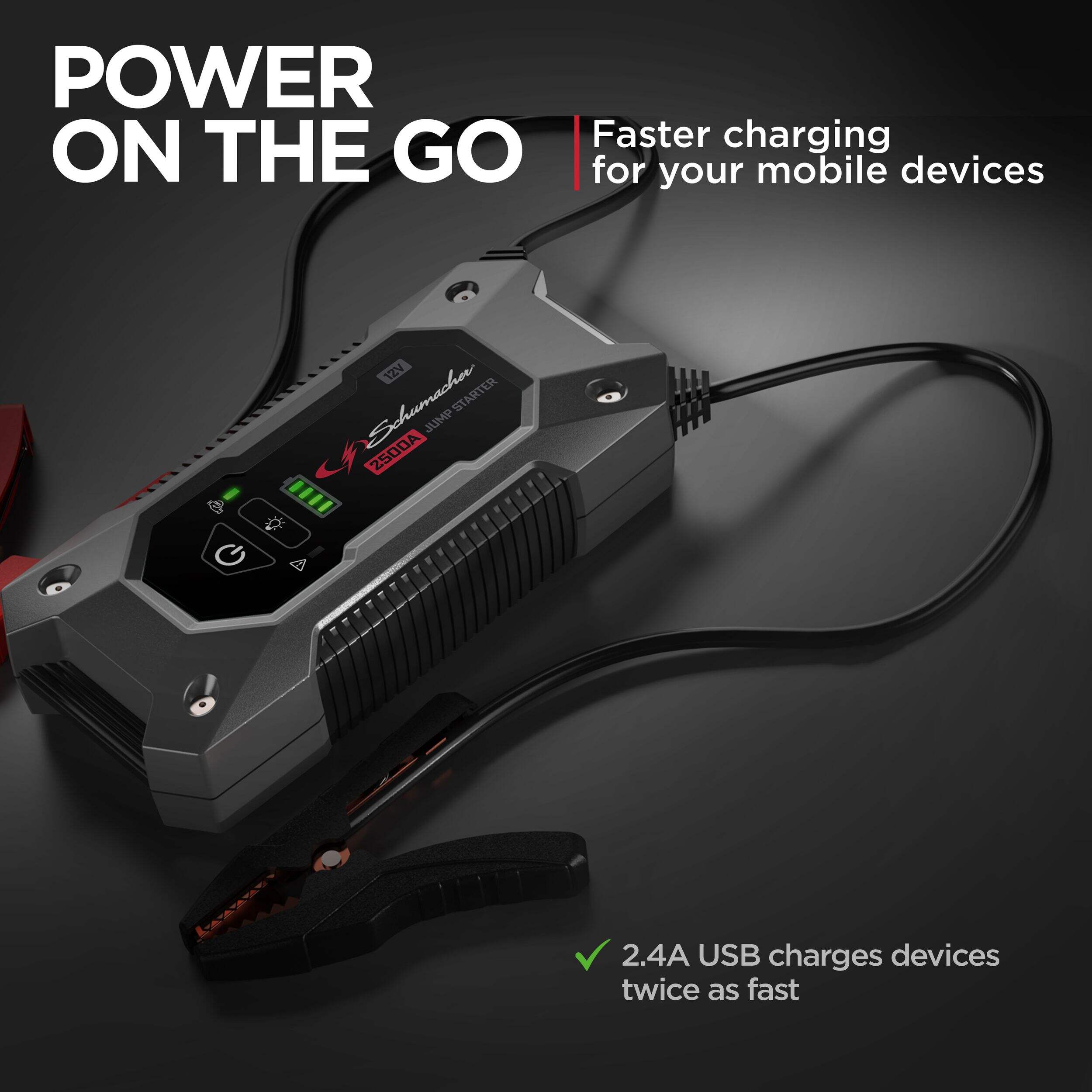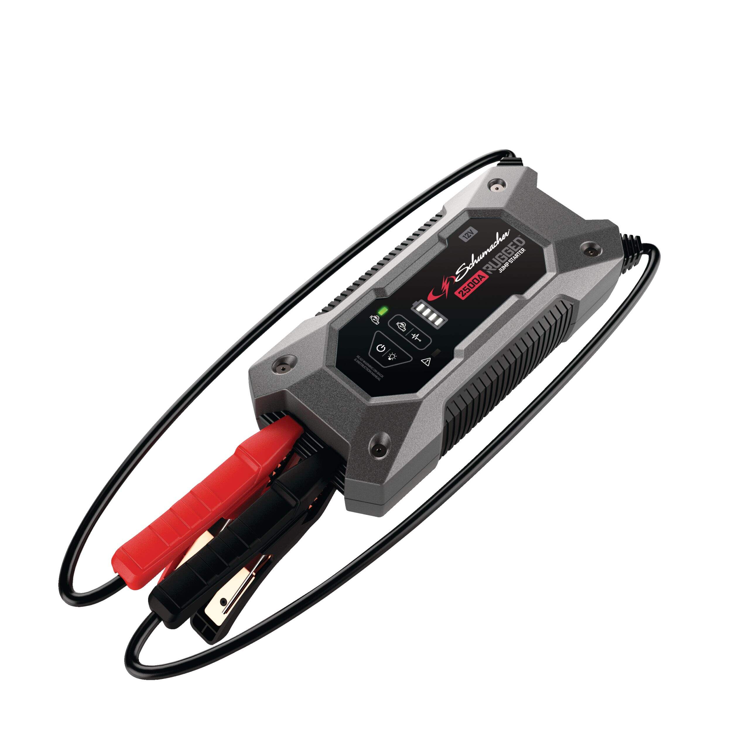 The heavy-duty Schumacher Jump Starter packs serious power to restart vehicles of all sizes. With 2500 amps, it jump starts engines reliably in any weather. The long-lasting internal lithium-ion battery can jump start a dead battery up to 50 times on a single charge. This portable jump starter also features charging capabilities to charge dead devices. With a variety of safety features, the rugged 2500W jump starter provides portable power when you need it most.