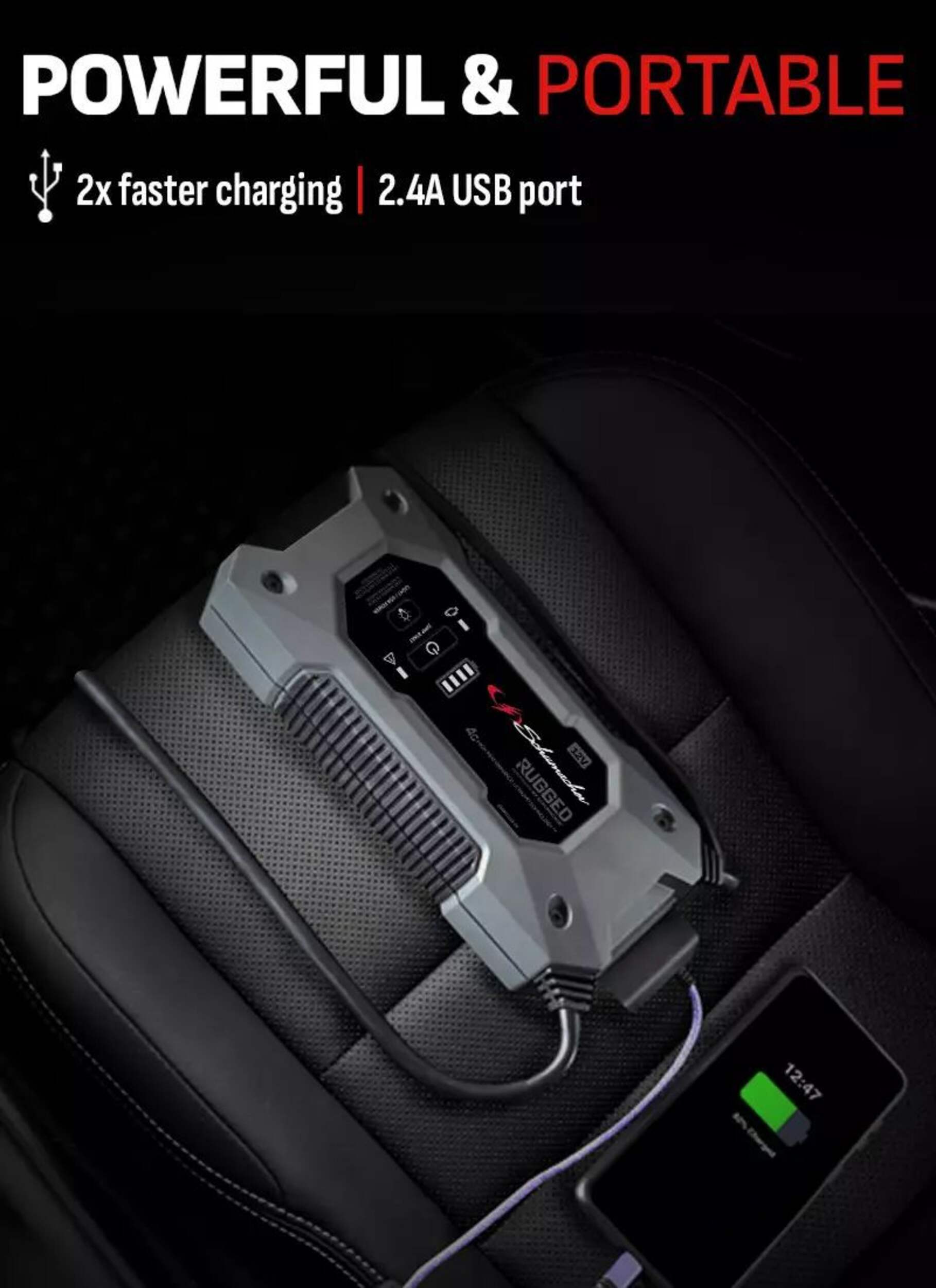 2.4A USB output, 2.0A USB input, and 12V input ports
