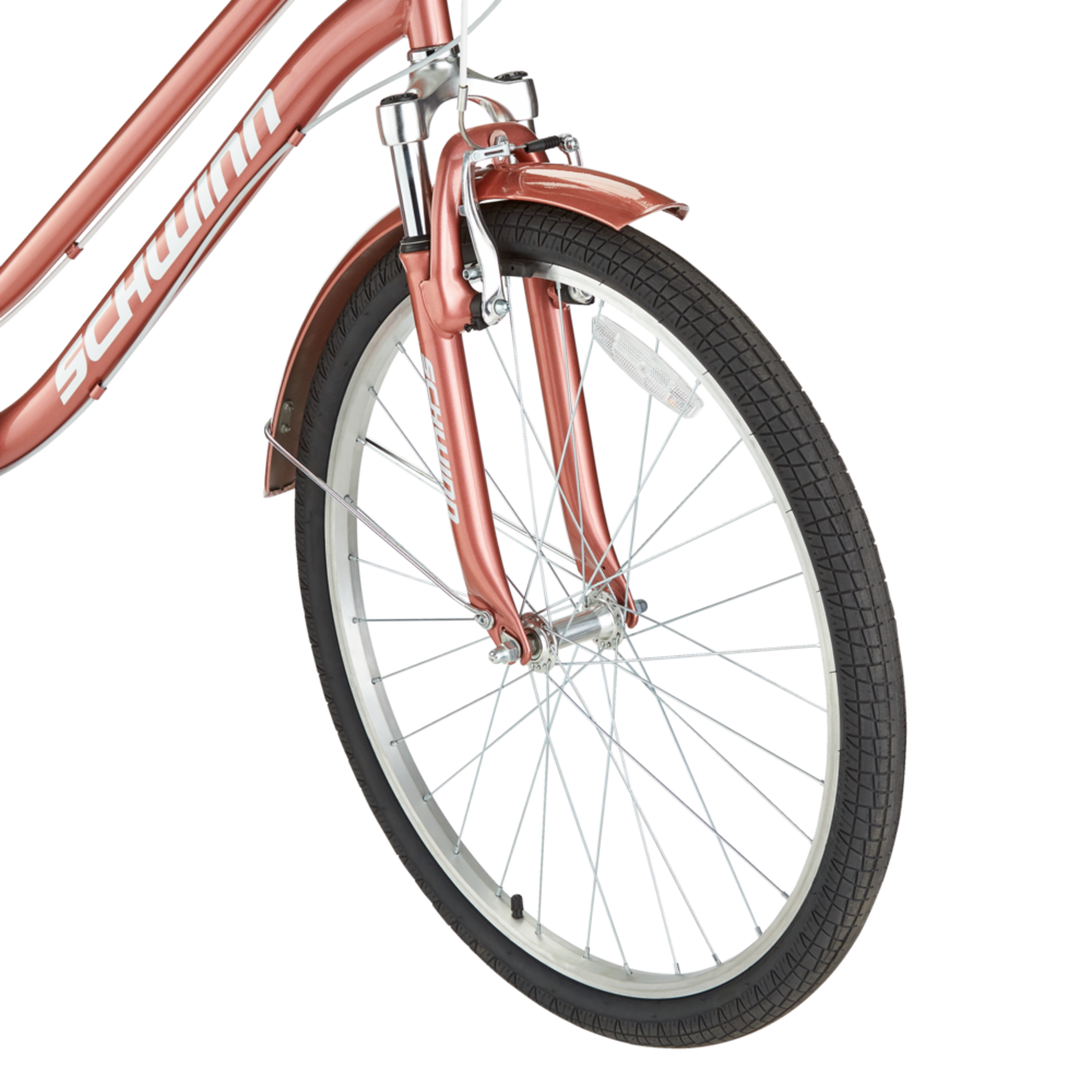 I just bought this beauty today, it is quite the stunner and perfect for a girly girl. It’s shiny rose gold exterior is more pink then it is gold just keep that in mind: the colour isn’t a true rose gold. It’s other redeeming quality is the comfort, it definitely lives up to its name. It’s the perfect fit for someone who is 5’4. Easy to get on and easy to get off of. Brakes currently work great and we’ll see how they hold up. Now for the drawbacks. There is no bike rake, basket, bell, or bottle holder. A lot of the other bikes at this price point have a combination of those extras. So factor in those costs if you want to buy this bike. Also, the wheels are not centrally aligned to the fenders. Not sure if this will be a problem going forward but we’ll see. Lastly, it is pretty heavy. I had some trouble hoisting it onto the ttc bus racks but if you want to incorporate strength training into your bike rides then this won’t be a problem. I would say the weight (someone said 41 lbs) would be the very upper limit of someone my size, it will take some getting used to.
