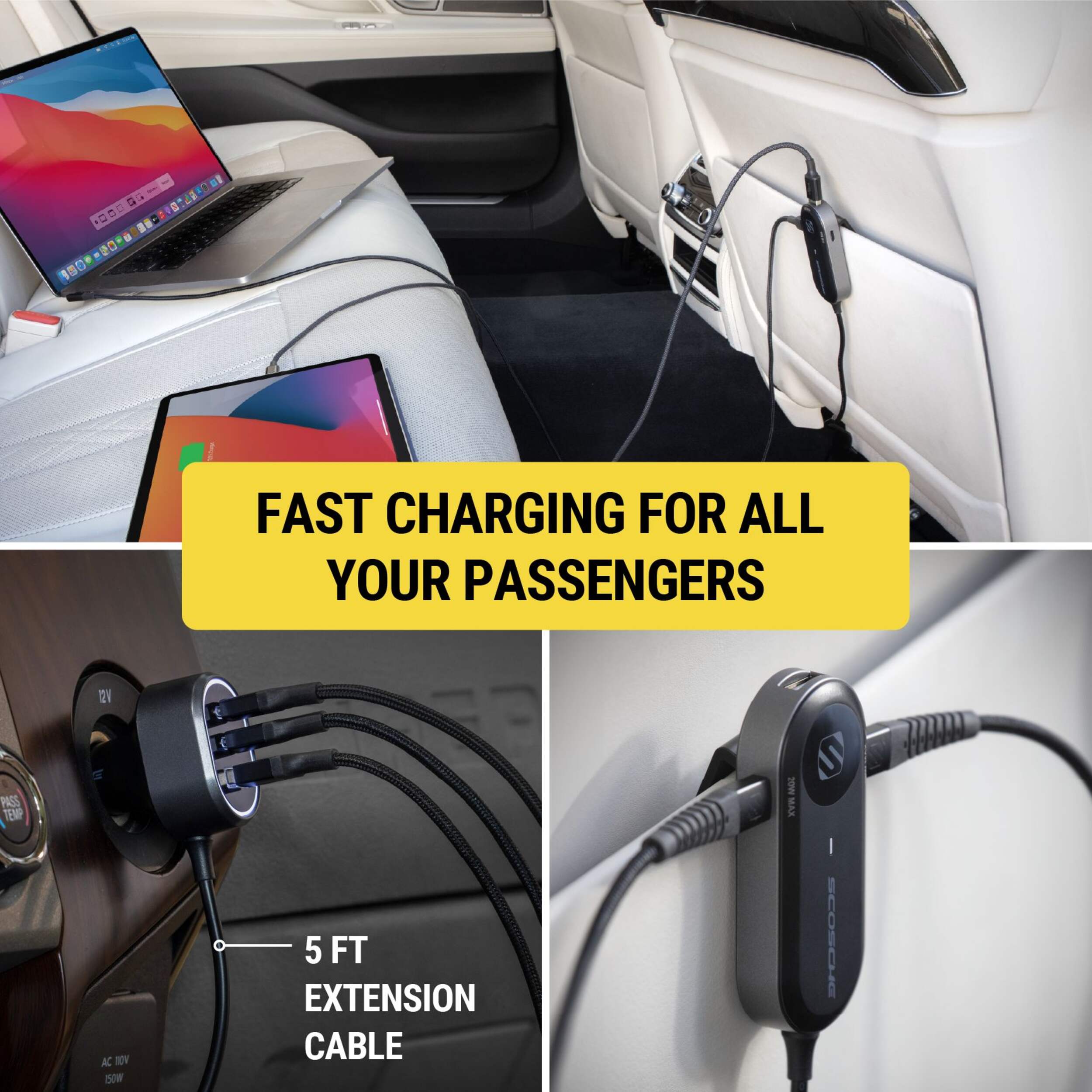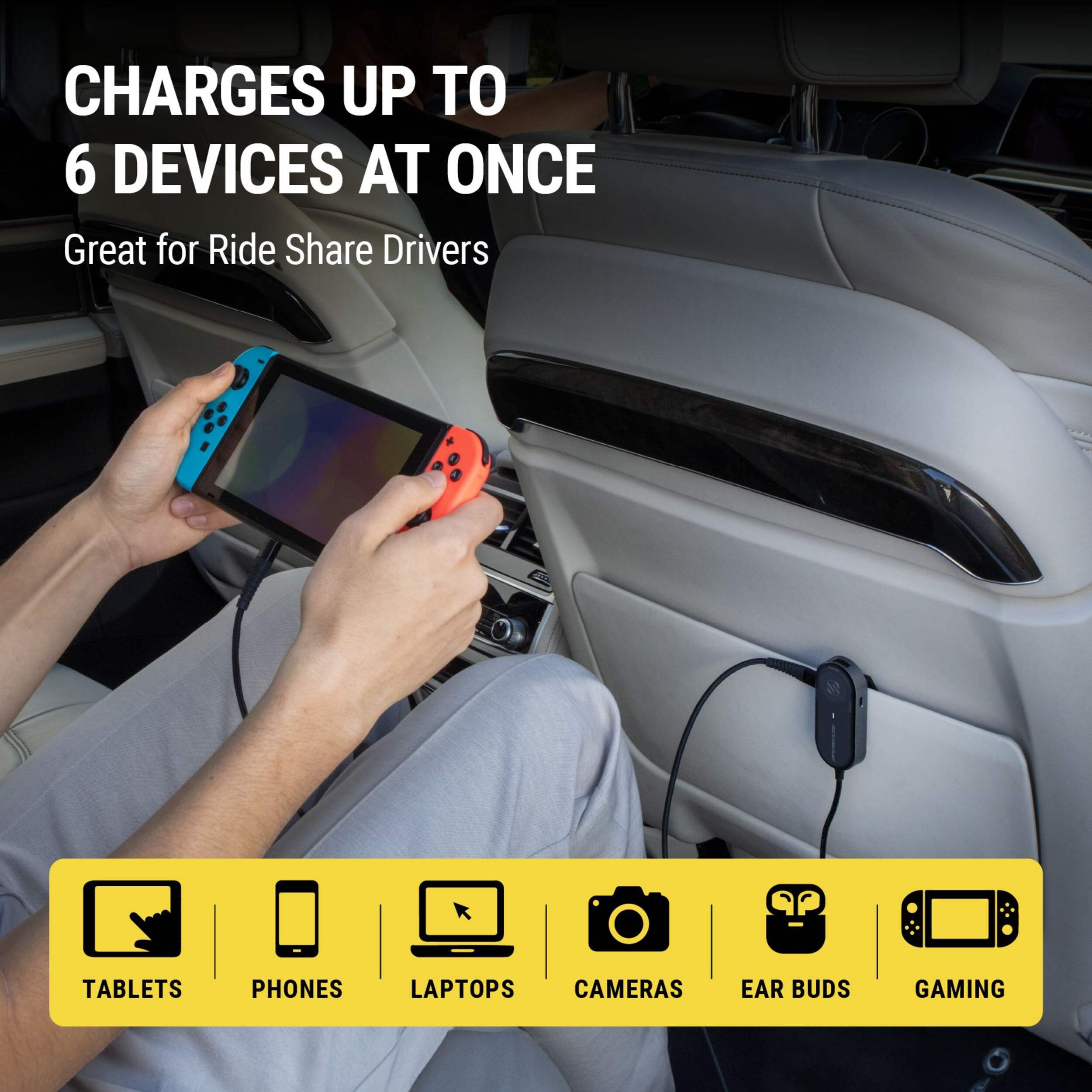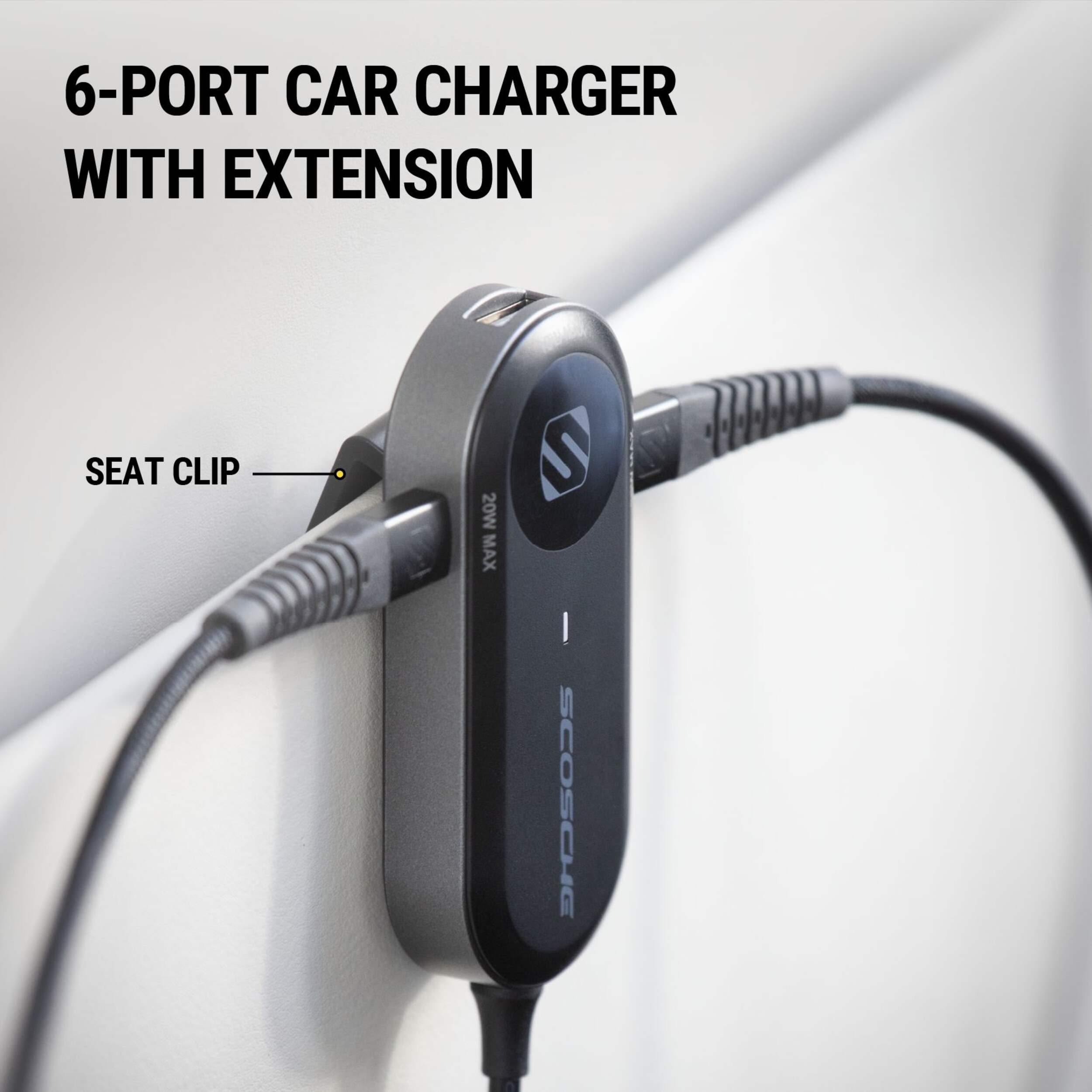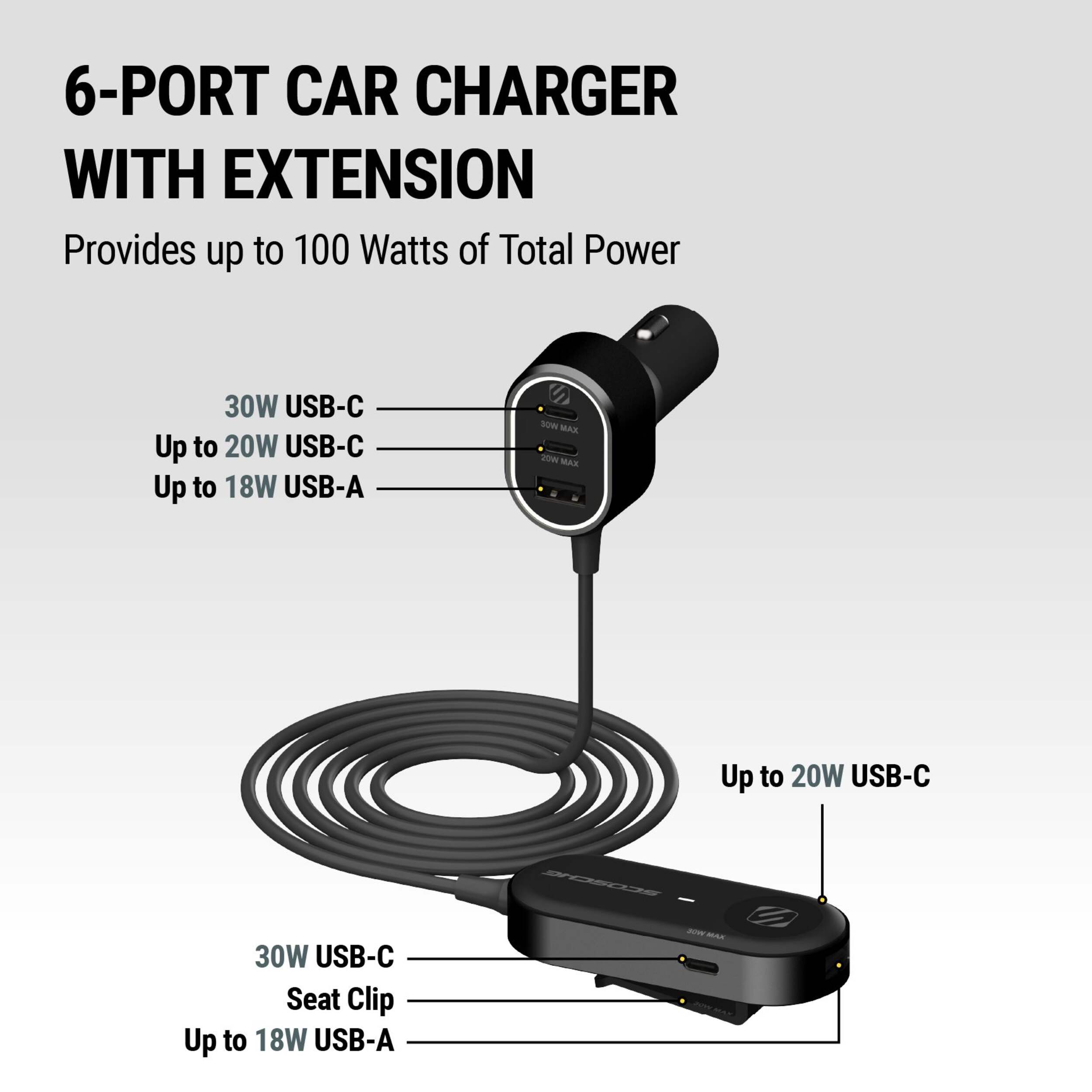 Stay powered on the go with the Scosche 100W PowerVolt 6-Port Multi Hub. Boasting 100W total power sharing, it can simultaneously charge up to six devices. Each of the two 50W hubs has two USB-C power delivery ports for fast charging and one USB-A port. Smart IC technology ensures optimal charging rates for phones, tablets, gaming devices, cameras, laptops and more. Perfect for road trips, this charger keeps all your devices ready.