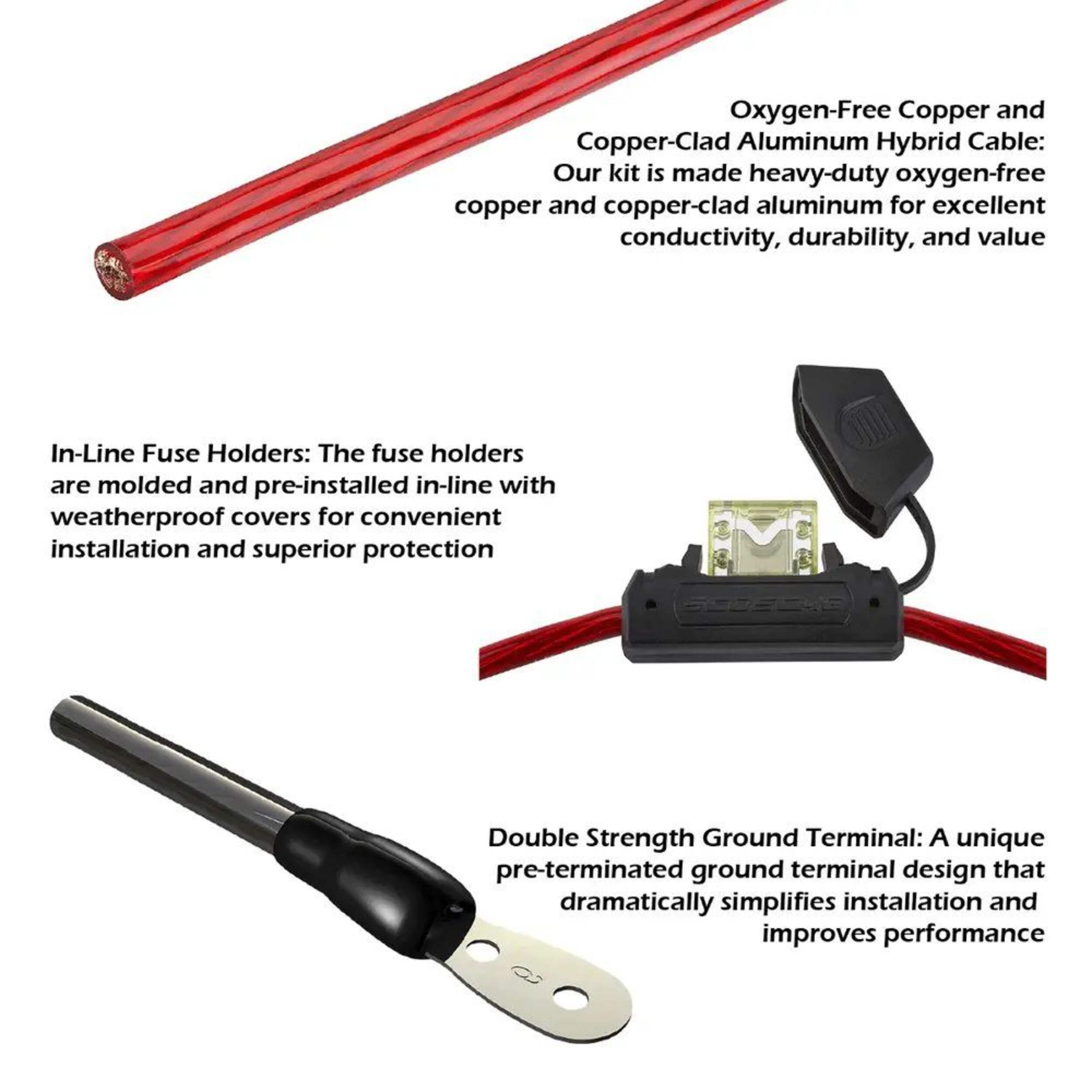 The Install Centric ICAK8 8 Gauge 2-Channel Amplifier Wiring Kit is compatible with systems up to 680-Watt Max or 400-Watt RMS. Our kit is constructed with heavy-duty oxygen-free copper and copper-clad aluminum for excellent conductivity, durability and value. The MAXI and ATC fuse holders are molded and pre-installed in-line with weatherproof covers for convenient installation and superior protection. The double strength ground terminal features unique, pre-terminated ground terminal design that dramatically simplifies installation and improves performance. The twisted pair RCA cables reject noise to provide a better sound performance. Includes: 16. 5ft. OFC / CCA power cable, 2 ft. OFC / CCA ground cable,16 ft. twisted audio cable, 16 ft. remote turn-on wire,30 ft. speaker cable, maxi fuse holder with 50A fuse, Pre-terminated double-strength ground terminal, wire ties and amplifier terminals.