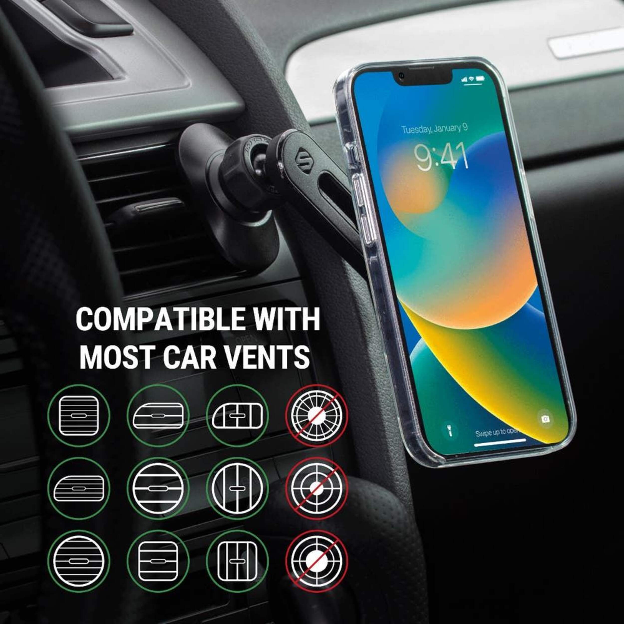 Keep your phone safely in view with the Scosche MagicMount Pro MS 4-in-1 Magnetic Phone Mount. The adjustable arm rotates easily, allowing for both portrait and landscape viewing, ensuring optimal usability while on the road. The Lock-Nut Vent mount attaches securely to most vehicle vents, providing easy installation and removal. This smart mount enhances your driving experience by keeping your hands free, so you can focus on the road ahead.
