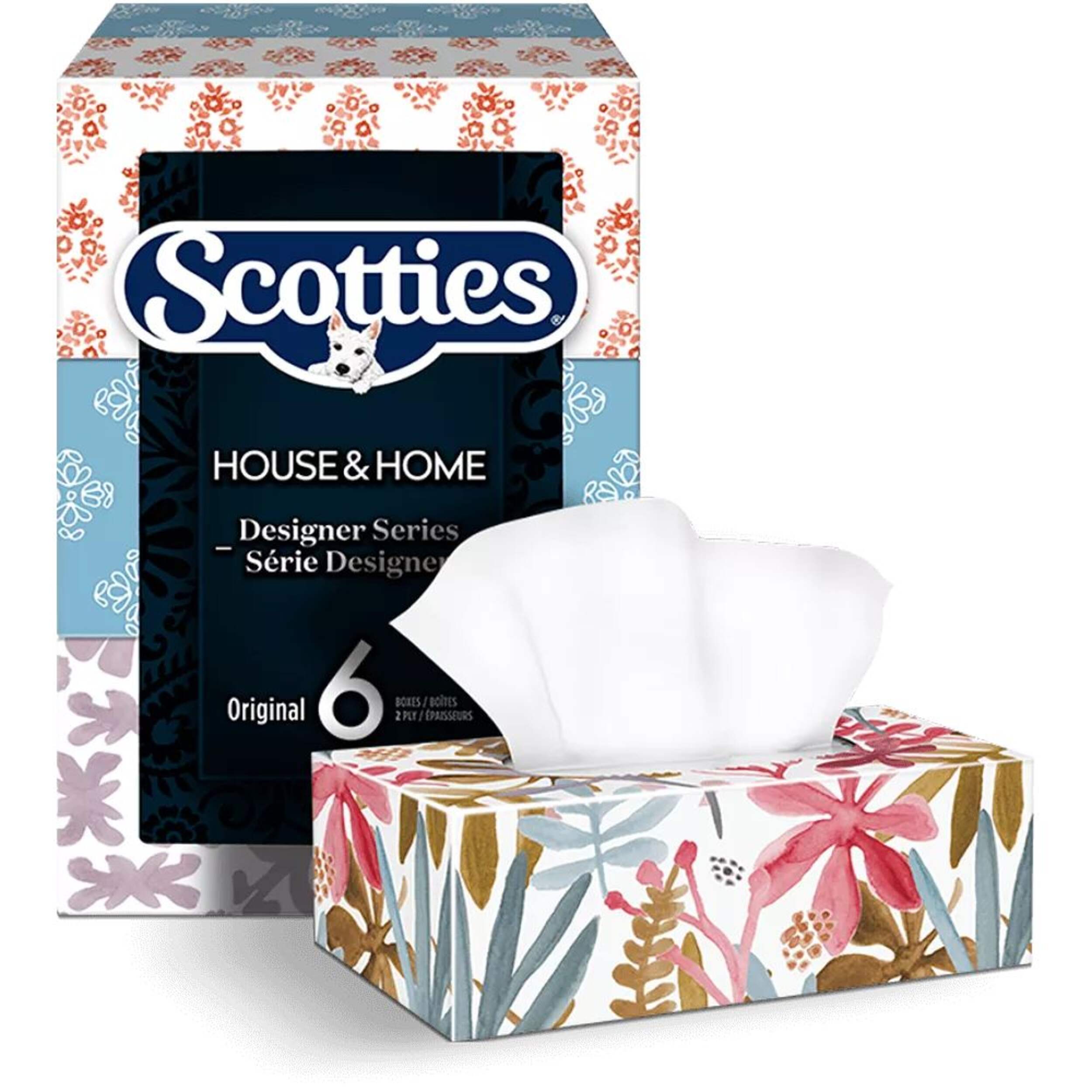 Contains 6 facial tissue boxes, each with creative patterns that add a touch of design and style to any room