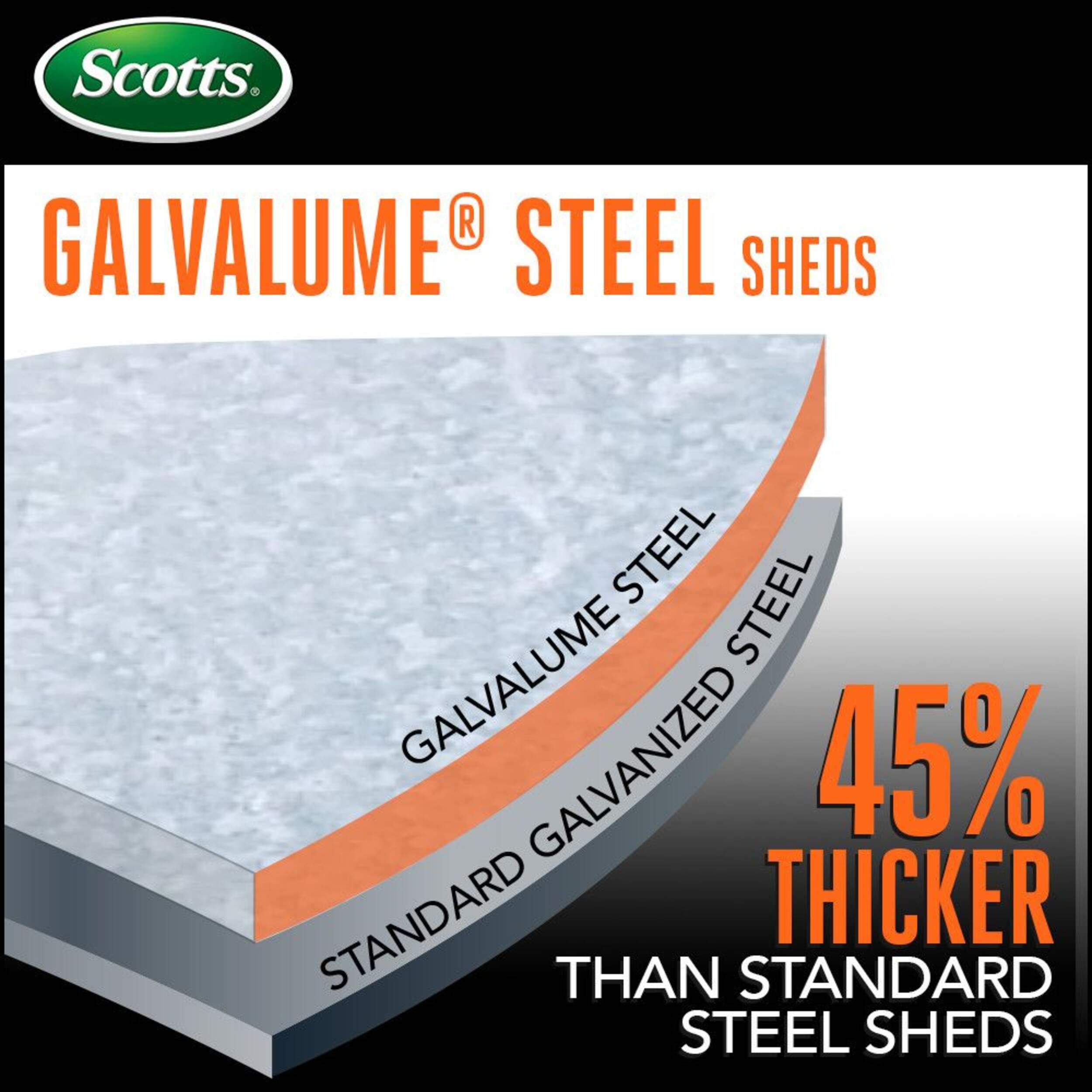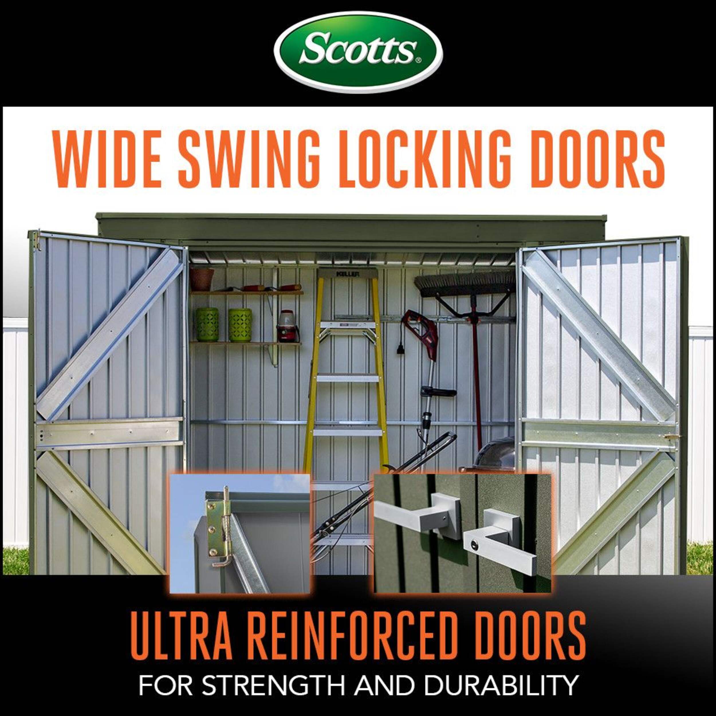The Scotts Lawn Care storage shed is a welcome fixture in any backyard This steel shed features a tall 72 in wall height and high gable roof for added headroom The rigid reinforced swing open doors with brushed nickel key lock handle allows for easy access to the interior, while allowing storage against the front wall In addition, gable vents provide increased air flow to the shed's interior.