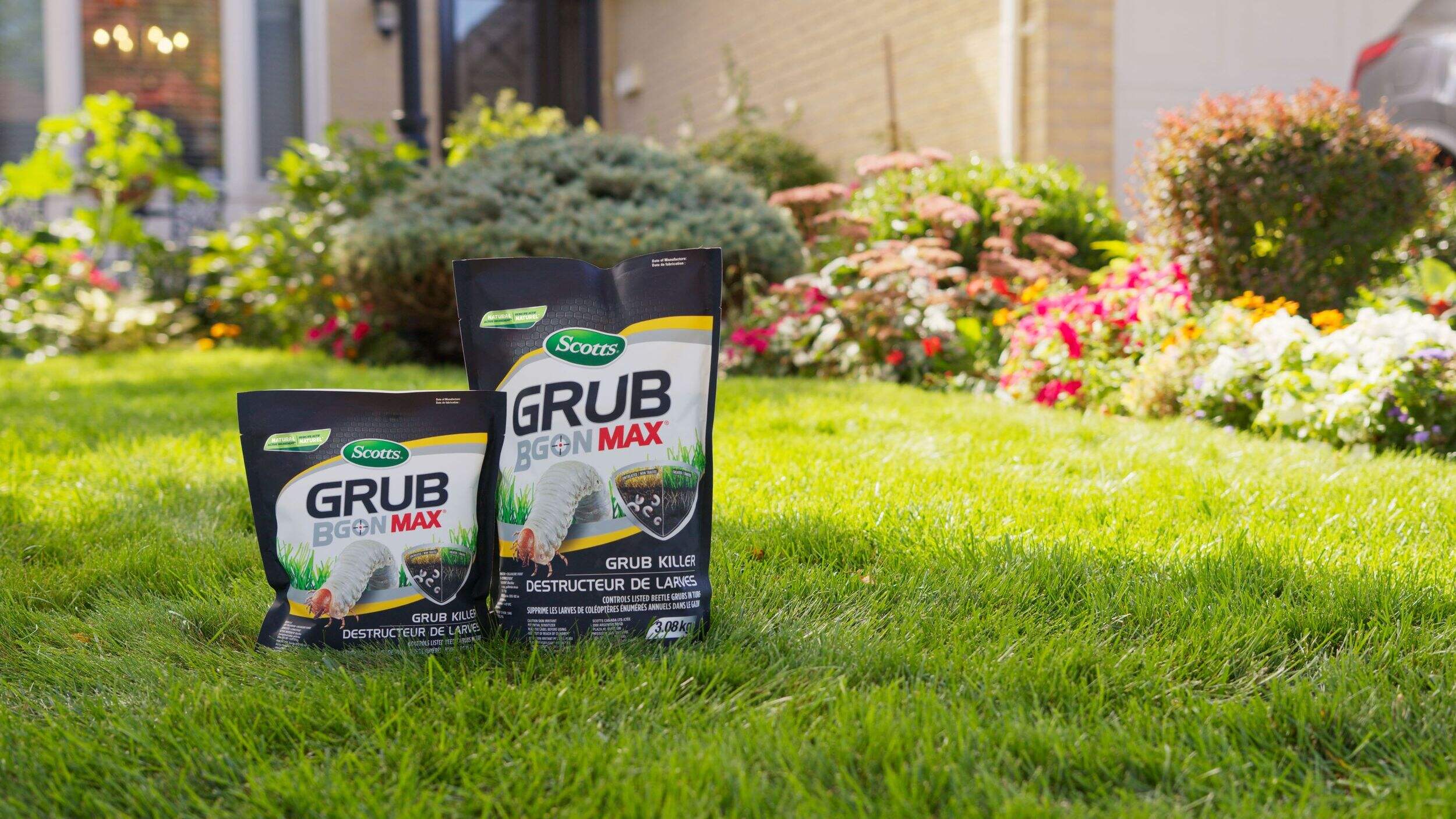 Uses a natural active ingredient Bacillus thuringiensis that absorbs into grass roots to kill grubs as they eat