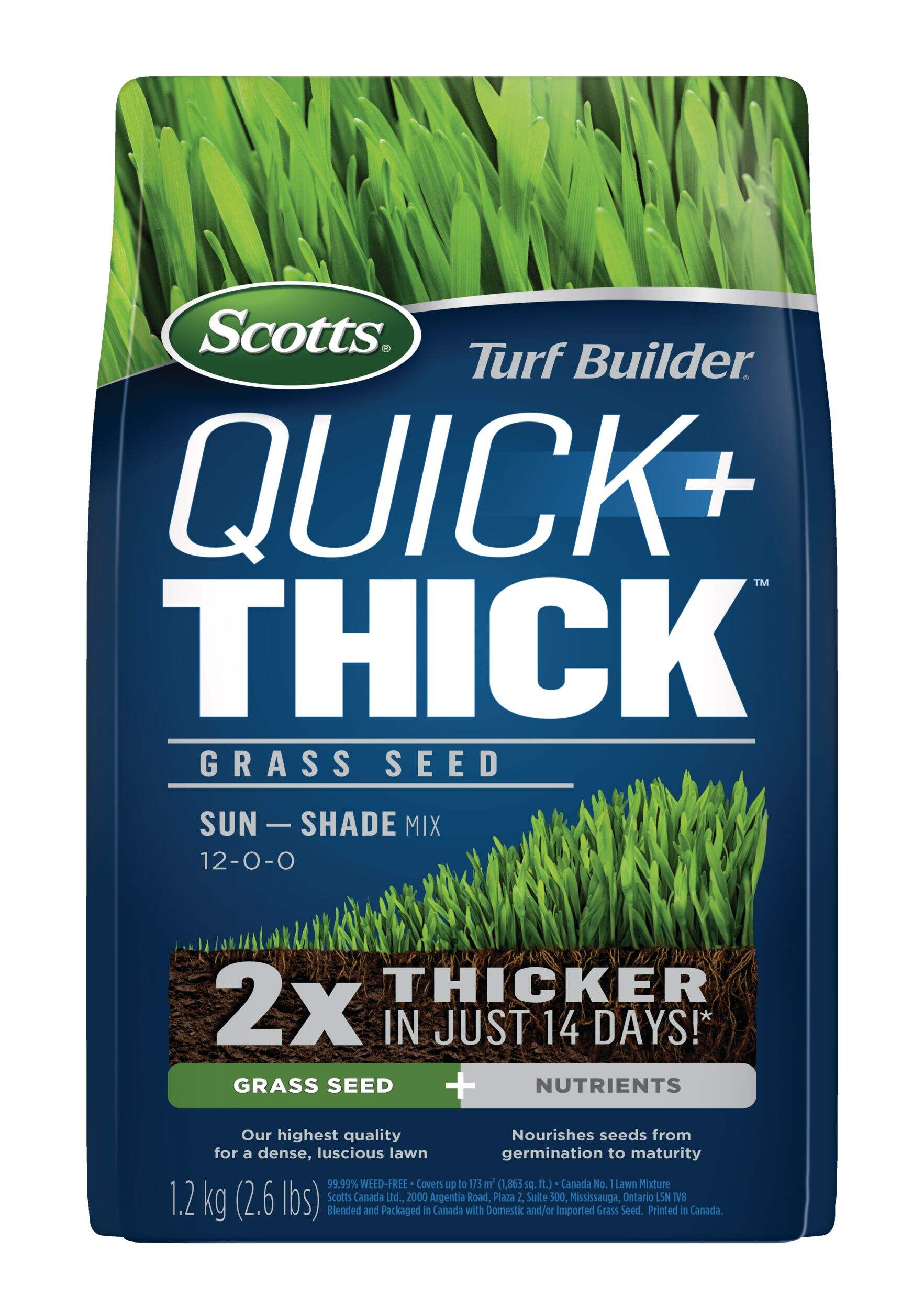 The Scotts Turf Builder Quick + Thick™ Sun—Shade Grass Seed & Fertilizer Mix produces dependable results any gardener will love. Even if your yard is the fickle sort with varying degrees of sun and shade, you can quickly grow a dense and luscious lawn with its rapid grass formula in just 14 days. Our exclusive mix contains the highest-quality grass seed plus a special blend of slow-release fertilizers. Made just for full sun and partial shade, it's ideal for over-seeding existing lawns.
